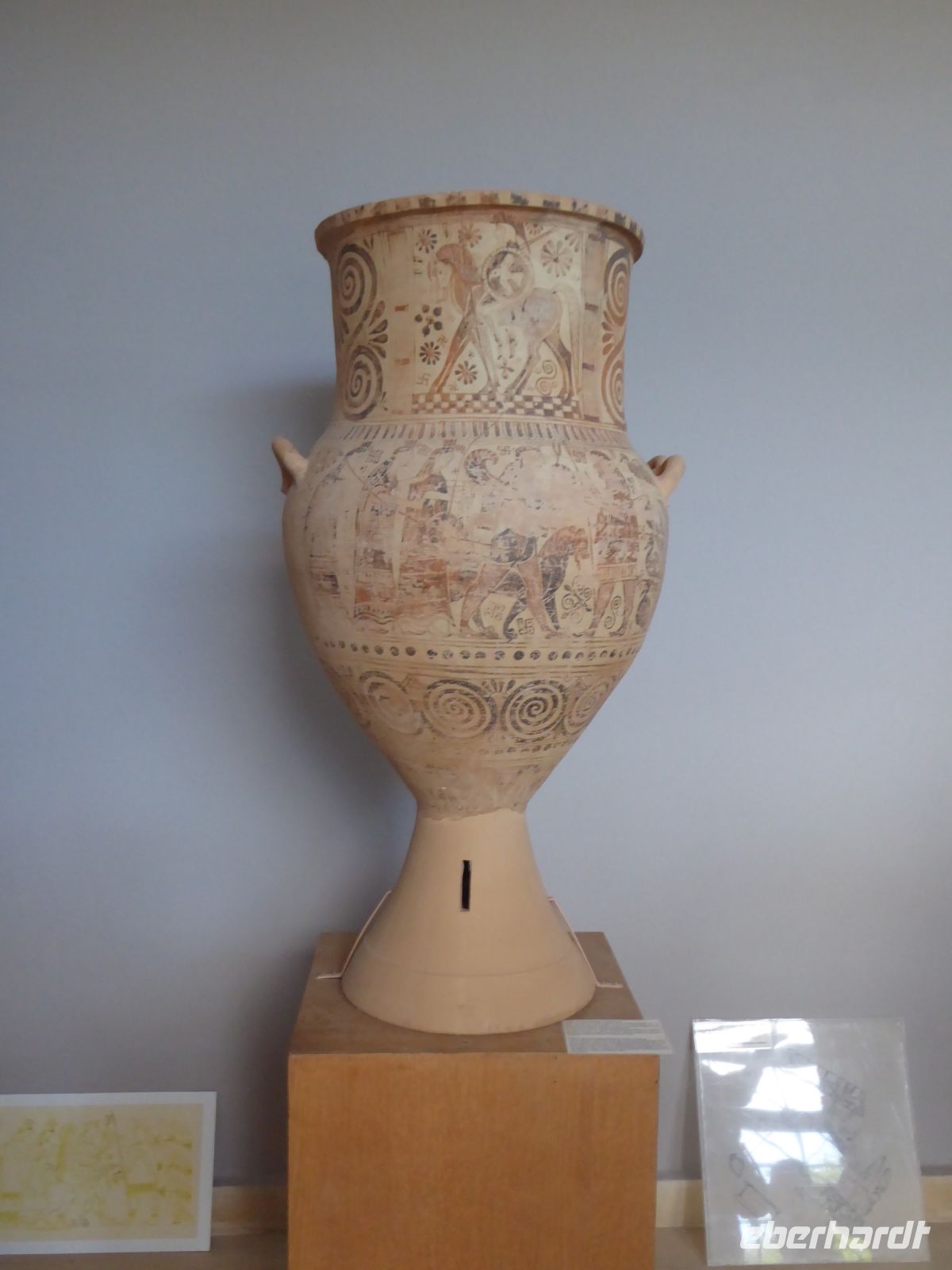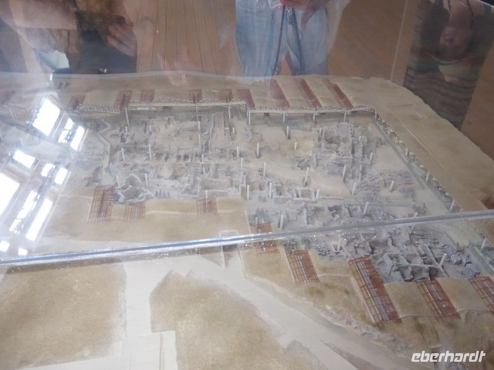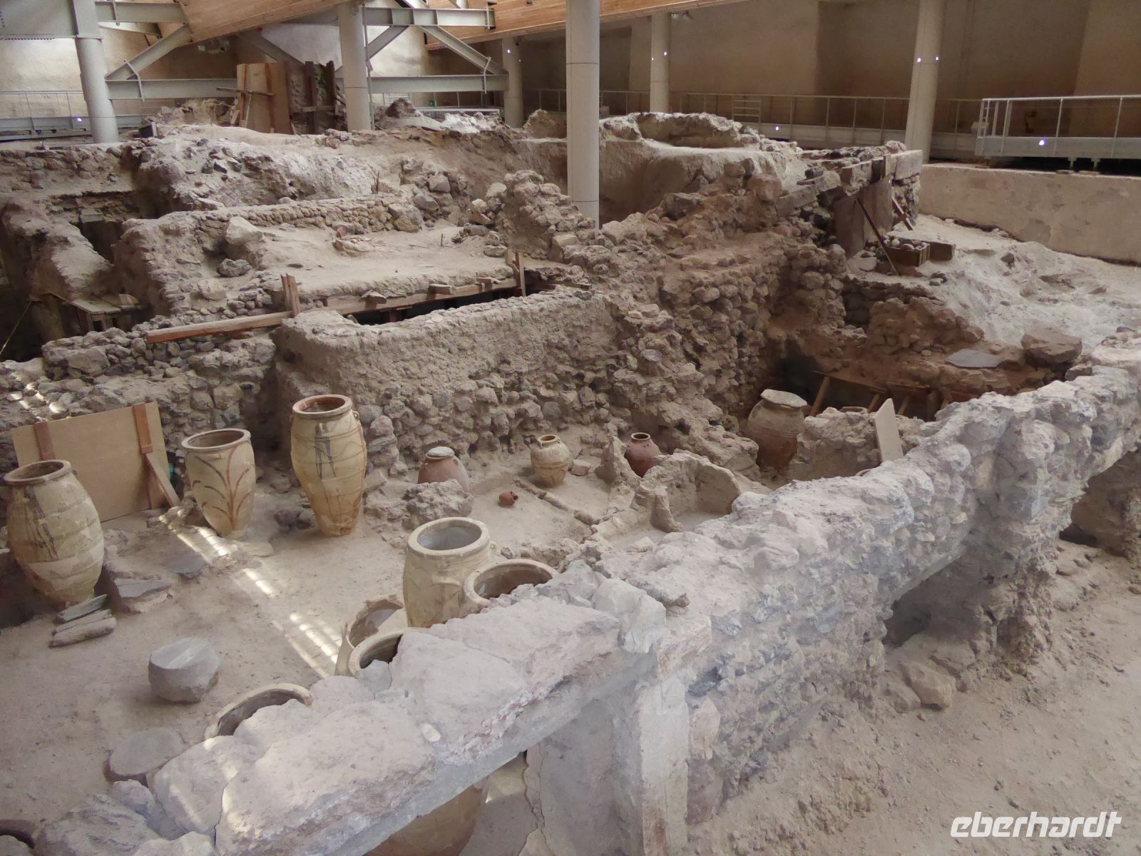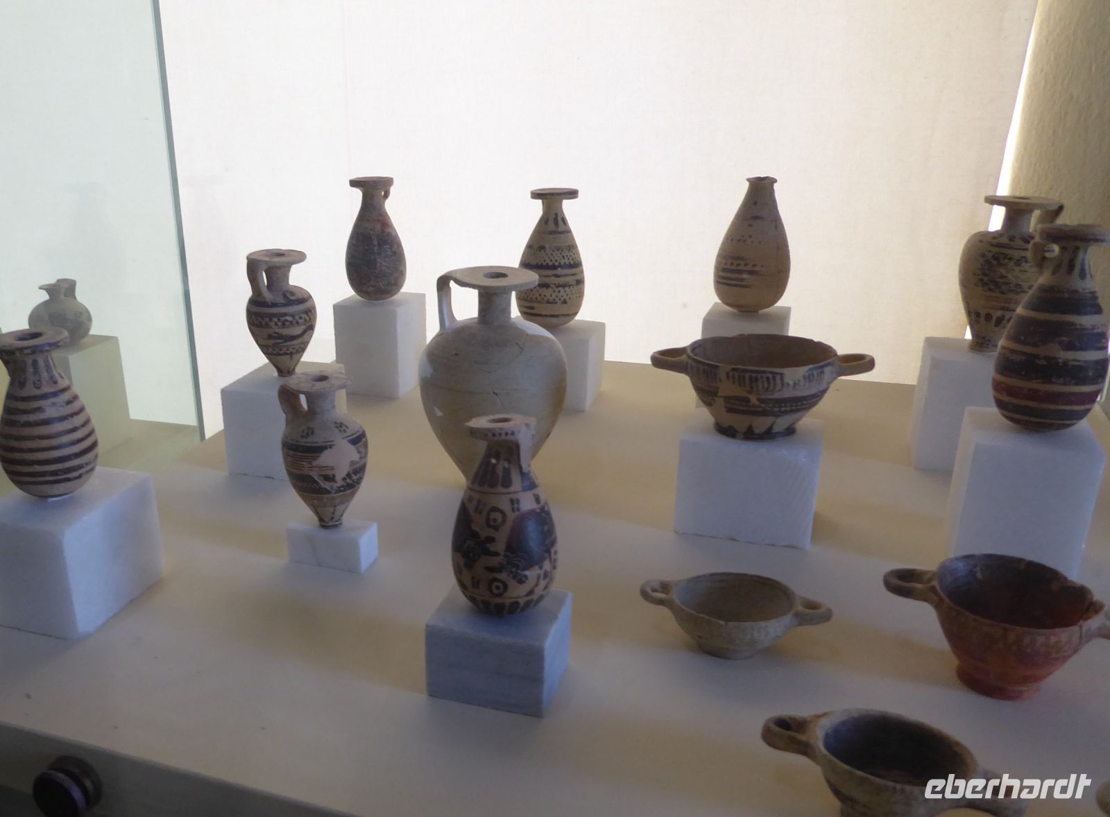 In Abwandlung des Programmes brachte uns der Bus erst zum höchsten Punkt der Insel, dem Profiti Ilias mit seiner fantastischen Aussicht über die Insel und das Meer und den Ort Pyrgos. Dann ging des zu den Ausgrabungstätten von Akrotiri, dem „Pompeji Griechenlands“. Hier wurde und wird immer noch eine prähistorisch minoische Stadt ausgegraben, die bei einem gigantischen Vulkanausbruch um 1.500 v.Chr. verschüttet wurde und über Jahrtausende unter Asche begraben war. Es gab mehrstöckige Häuser, Plätze, Mosaike und Vasen, bestens erhalten und zum Teil im Nationalmuseum Athens zu sehen sind. Viel zu bestaunen und fotografieren.
