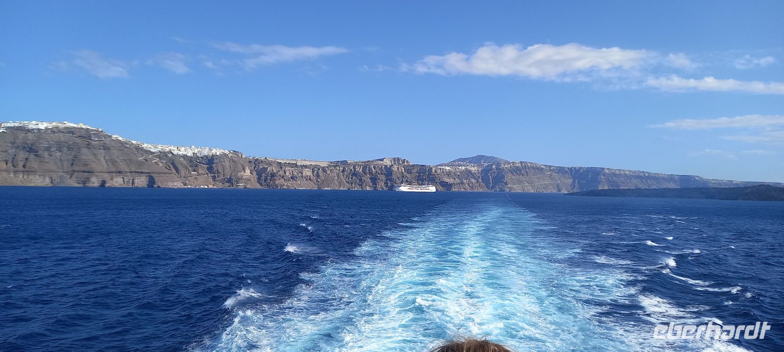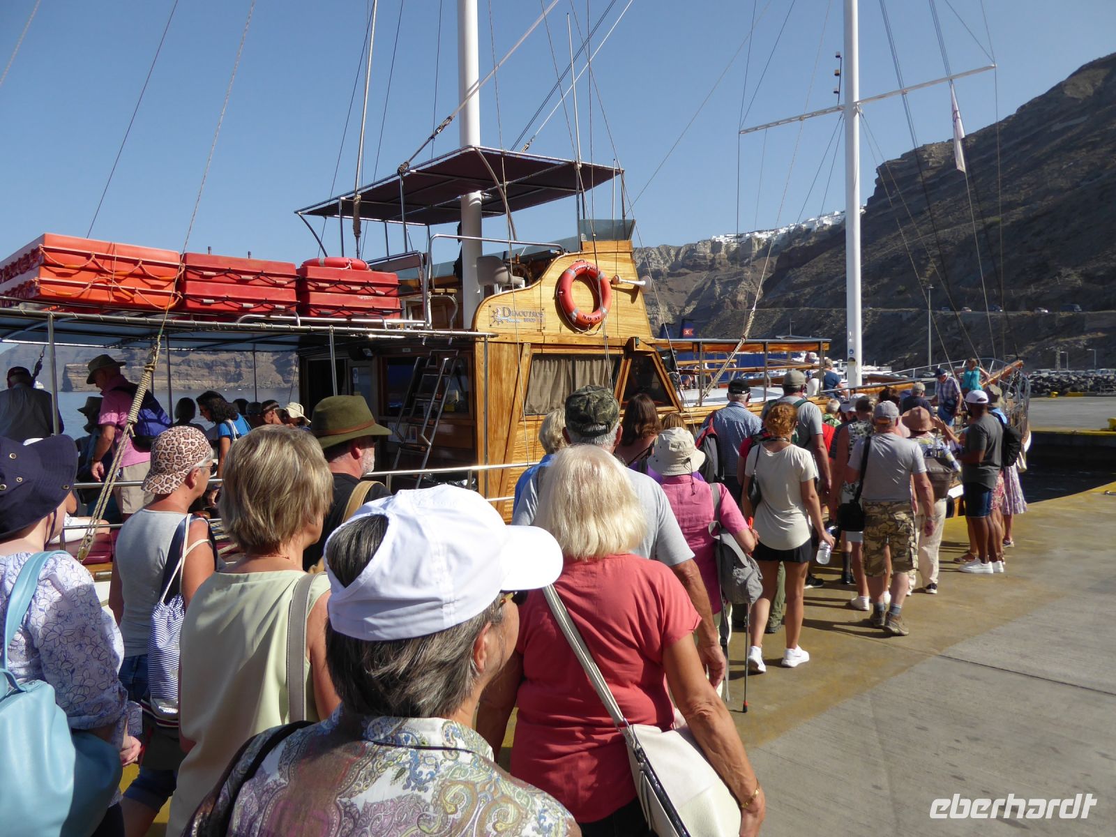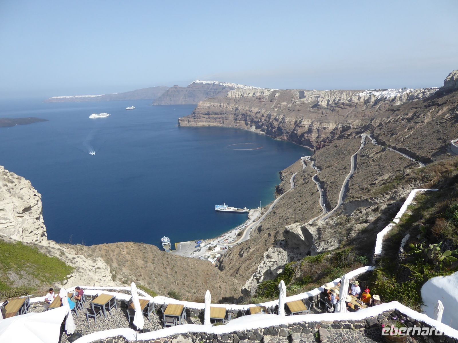 Der Tag beginnt mit einem leckeren Frühstück. Wer draußen sitzen wollte, musste sich schon ein windgeschütztes Plätzchen suchen. Um 09.15 h trafen sich dann alle mit Koffern am Bus und zur Abfahrt zum Arch. Museum. Hier gab es Exponate zu den Ausgrabungen von Akrotiri. Nikkos führte uns durch die Räume und erklärte die verschiedenen Ausstellungsstücke. Anschließend gab es kurze Führung durch die Hauptstadt er Insel, Fira. Es war Zeit für ein Mittagessen, und auch anschließend konnte man in der Stadt auf dem Kraterrand noch bummeln. Um 14.00 h trafen wir uns dann alle am Hauptplatz der Stadt und gingen gemeinsam zum Busparkplatz zur Fahrt hinunter zum Fährhafen. Bis zum Boarding war noch Zeit für einen kleinen Spaziergang im Hafen oder ein Getränk in den Cafés beim Anleger.
