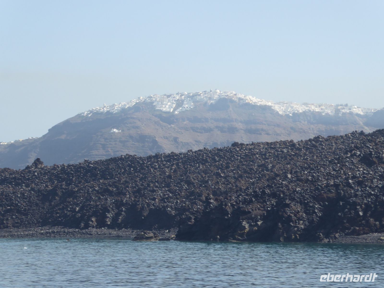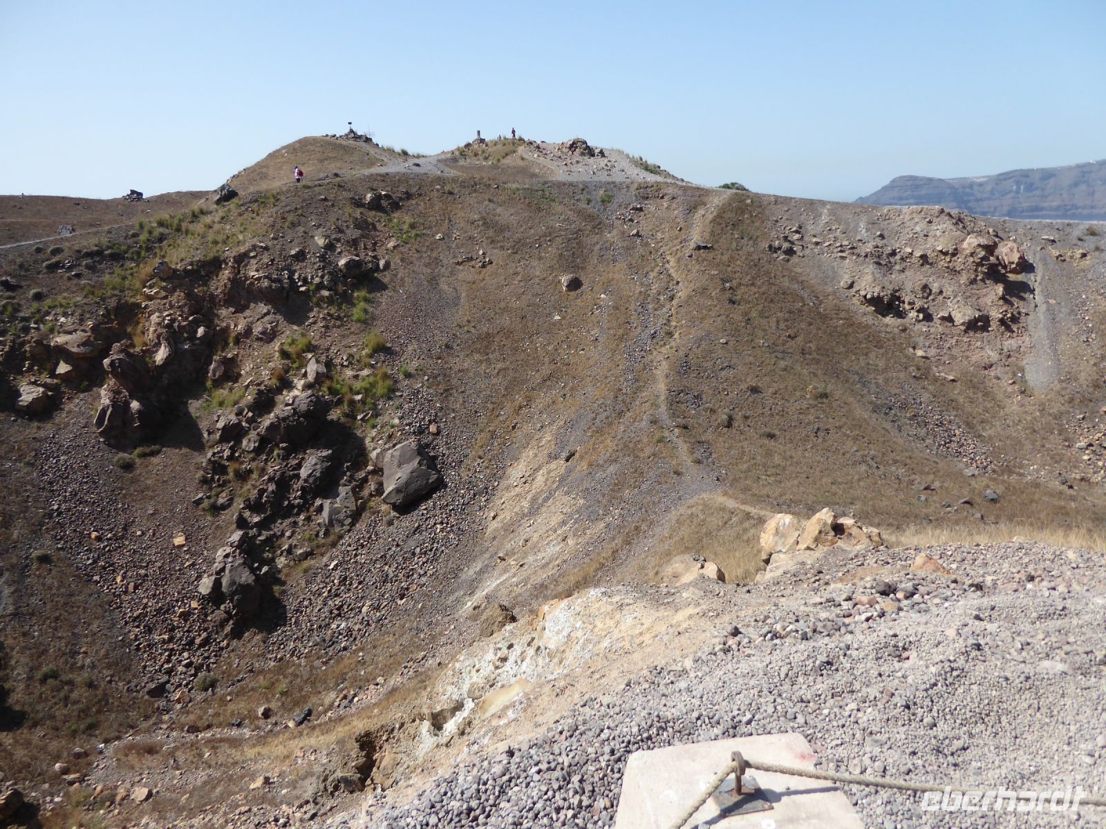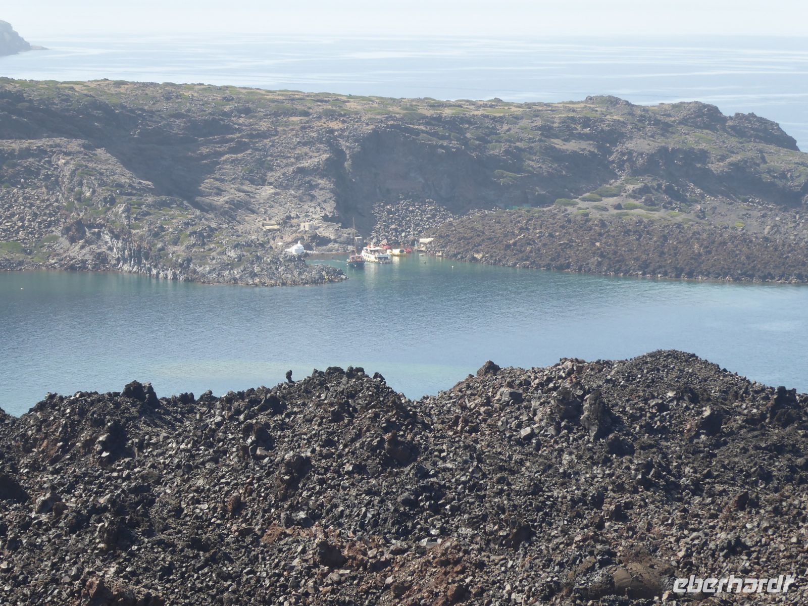 11.45 h Weiterfahrt zum Anleger auf Nea Kameni, Vulkaninsel. Eintritt zahlen und Aufstieg in der Mittagssonne bei 30°C + ! Anfangs gepflasterter Weg, nach 150 m Lava-Schotter und Steine.