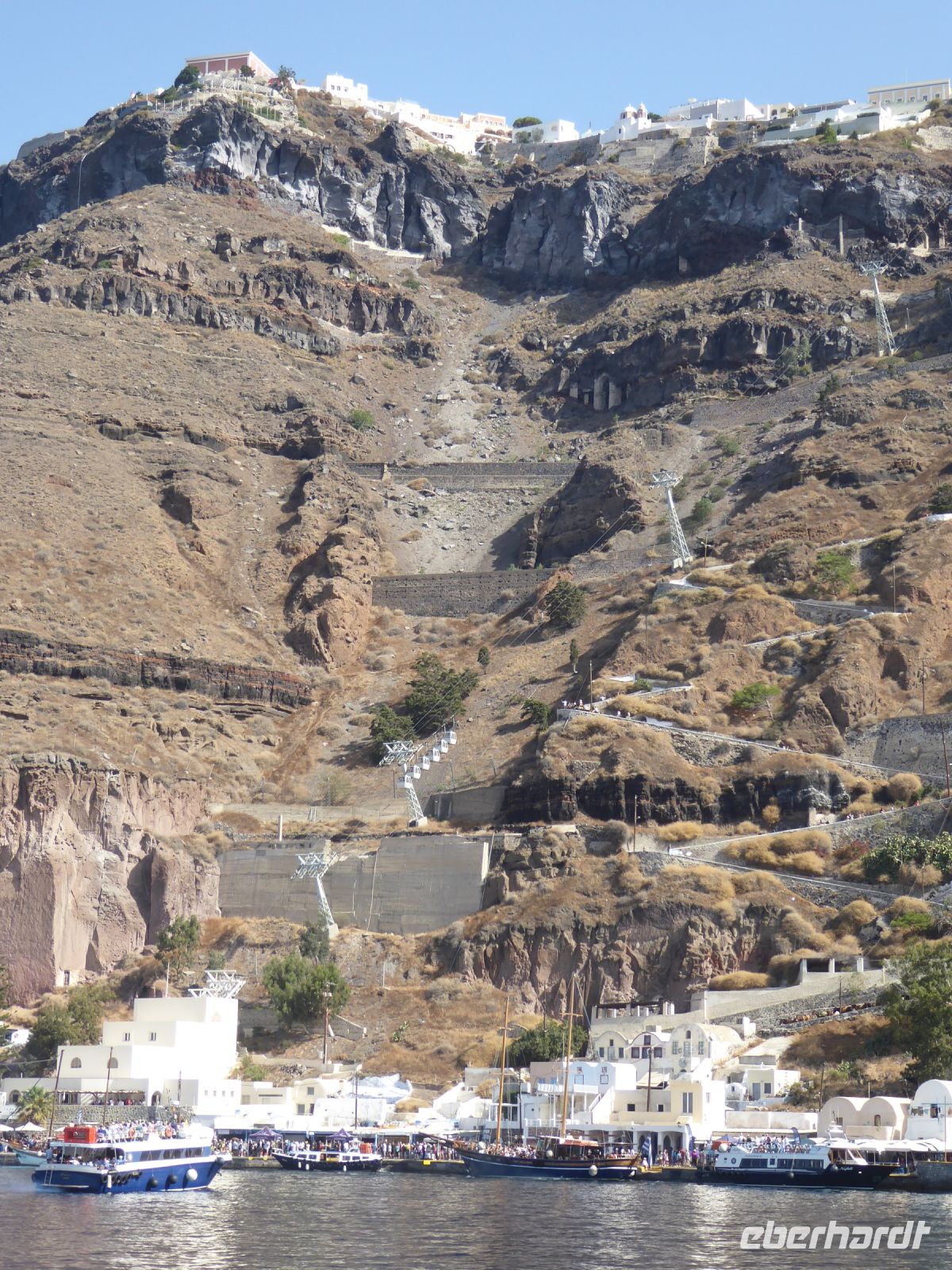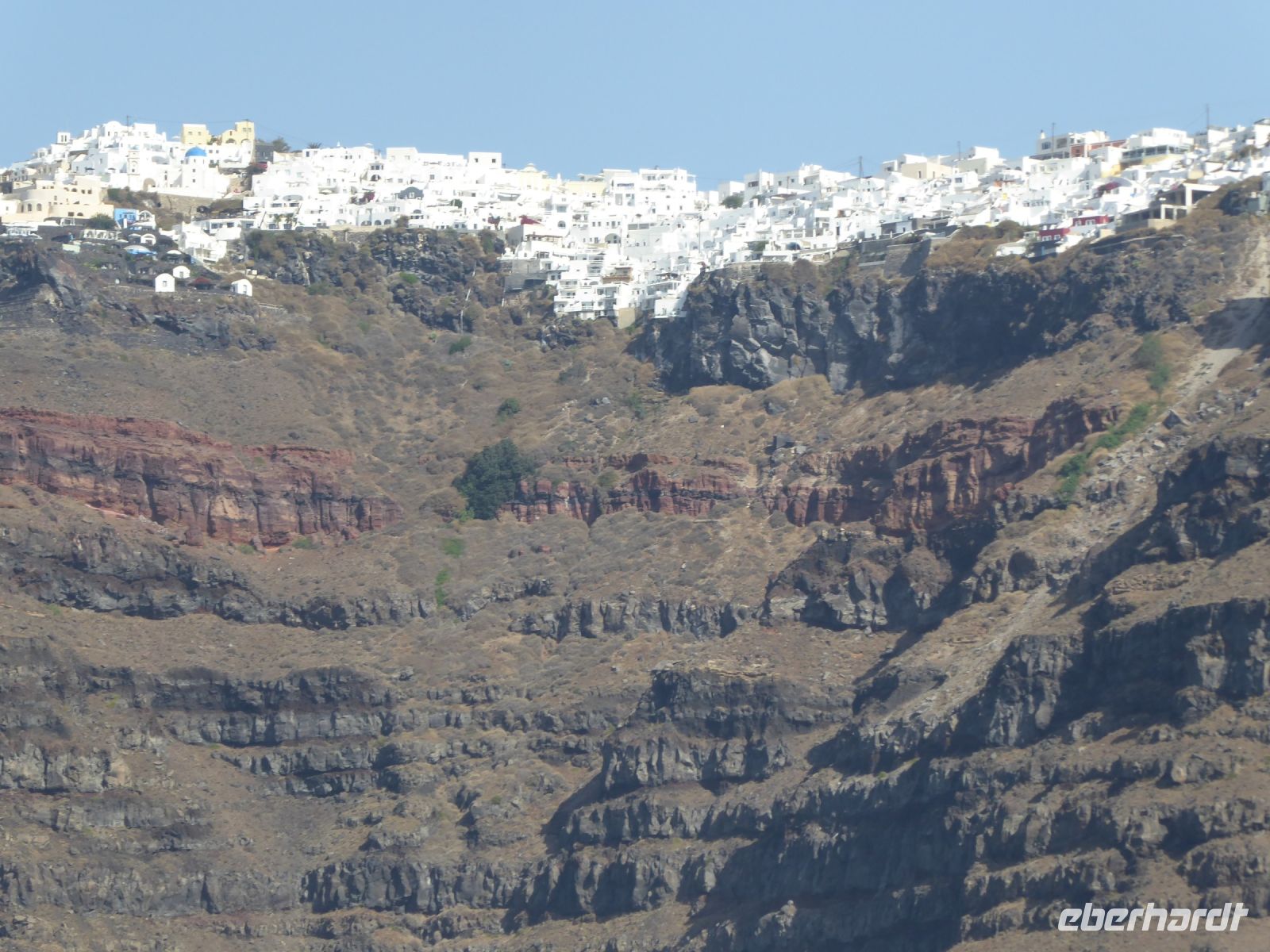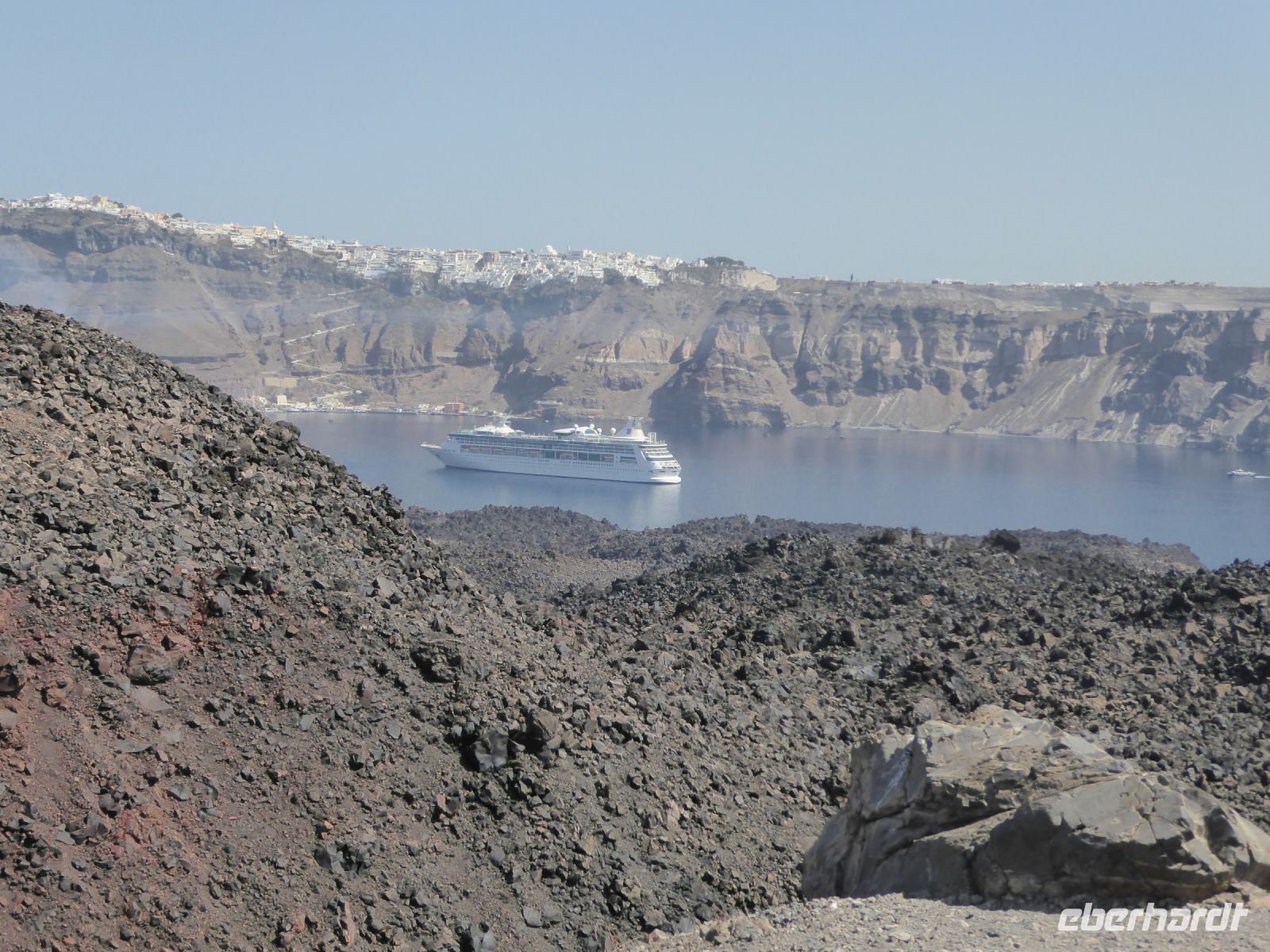 11.45 h Weiterfahrt zum Anleger auf Nea Kameni, Vulkaninsel. Eintritt zahlen und Aufstieg in der Mittagssonne bei 30°C + ! Anfangs gepflasterter Weg, nach 150 m Lava-Schotter und Steine.