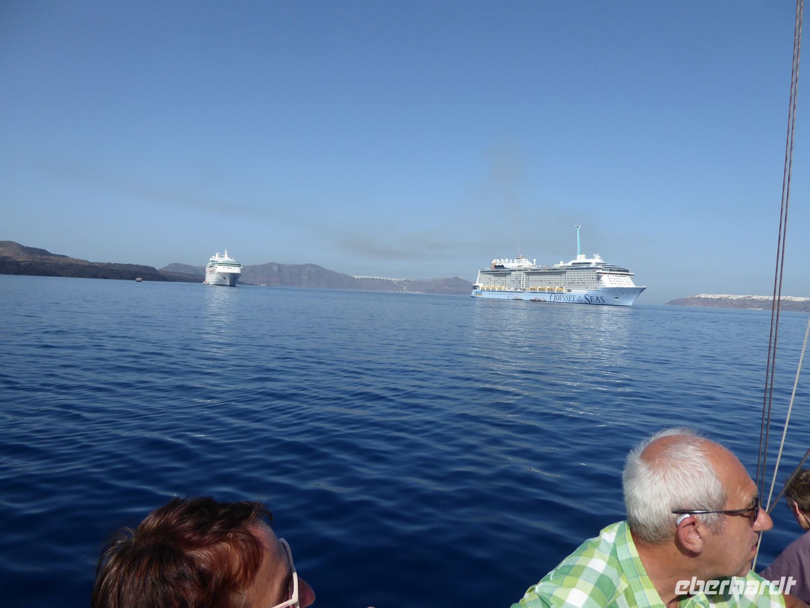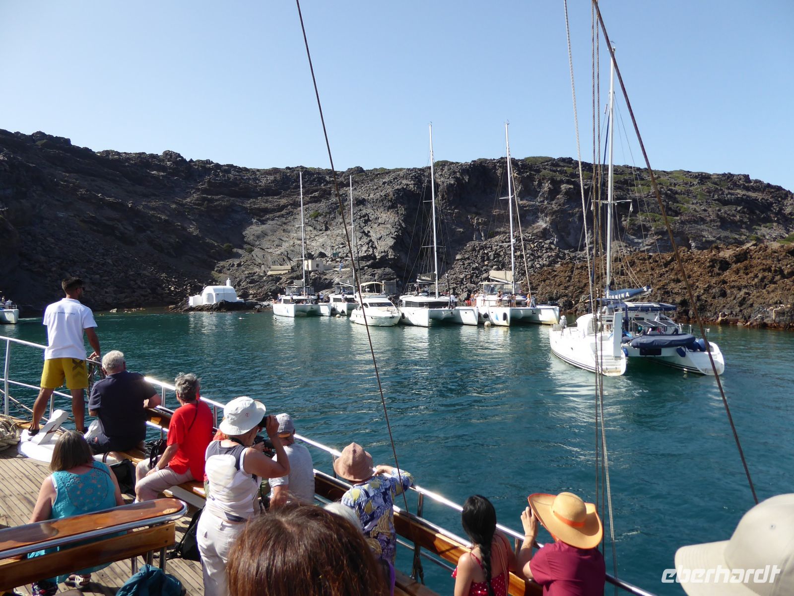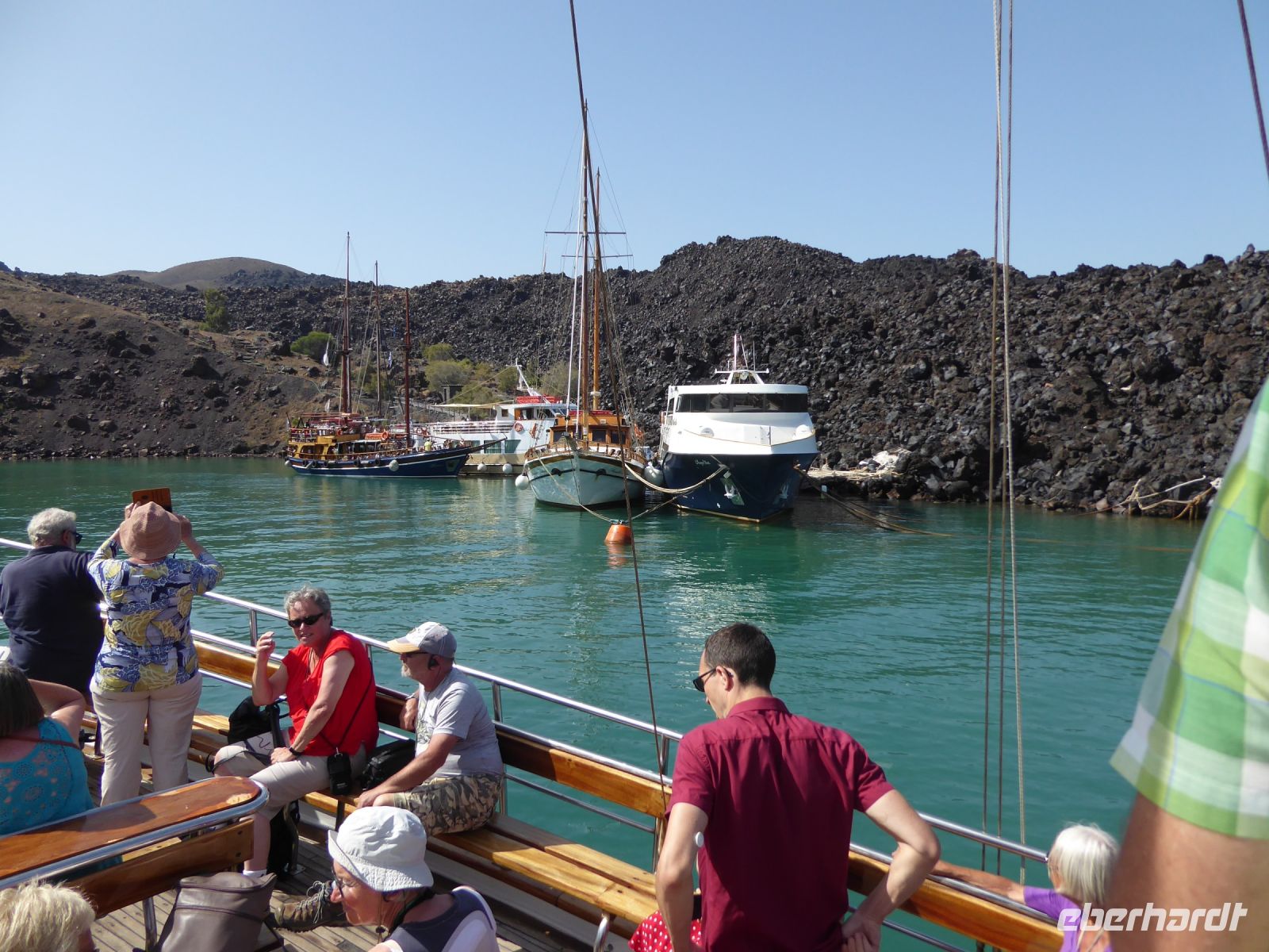 11.00 h Ankunft in Bucht der Insel Palea Kameni mit den heißen Quellen. – die bucht liegt voller Ausflugsschiffe, zum Teil laute Musik, im Wasser wimmelt es von Schwimmern der anderen Boote.