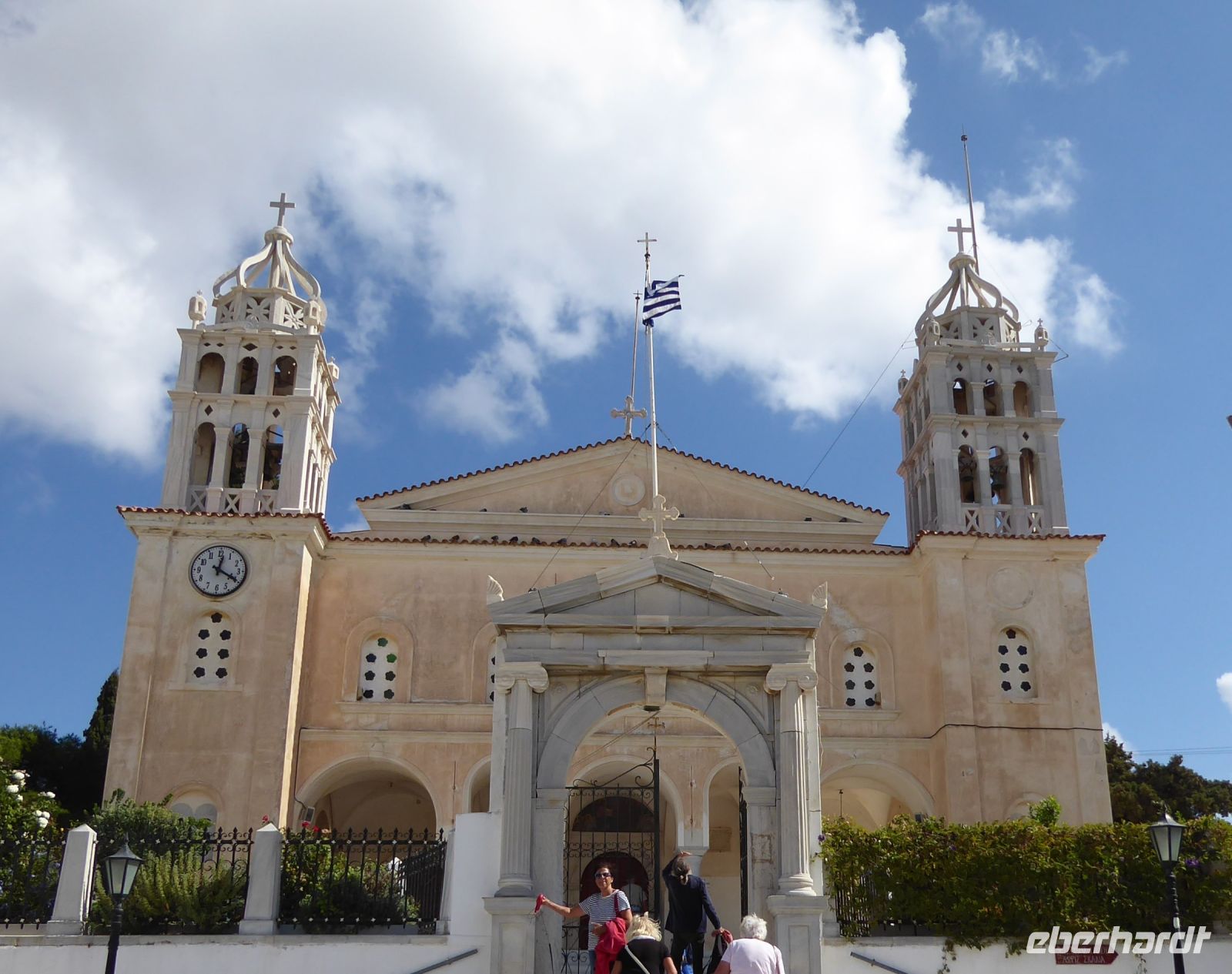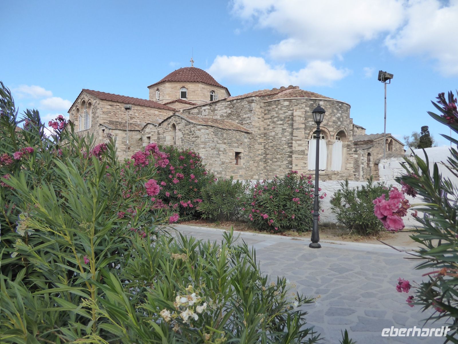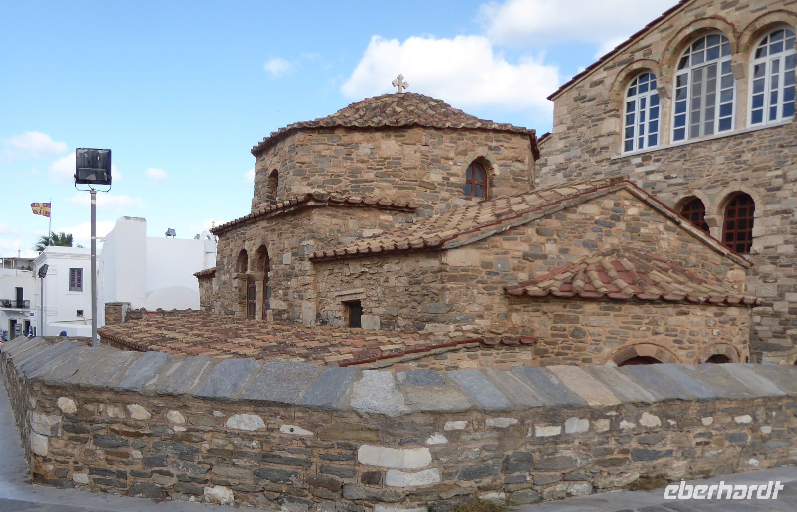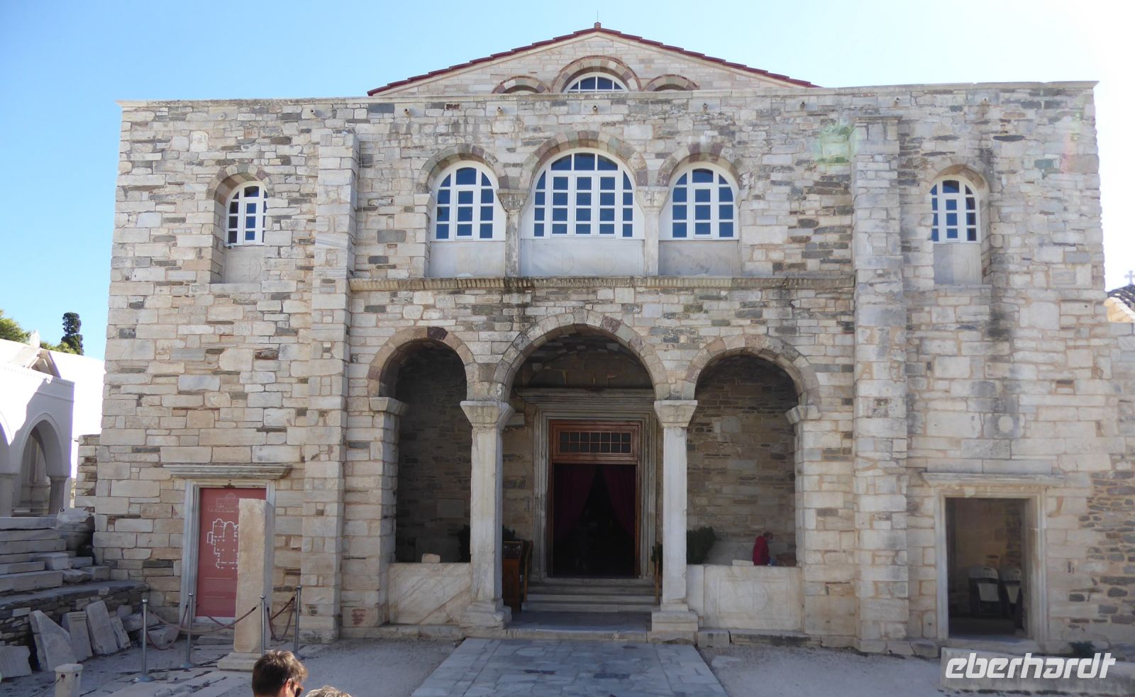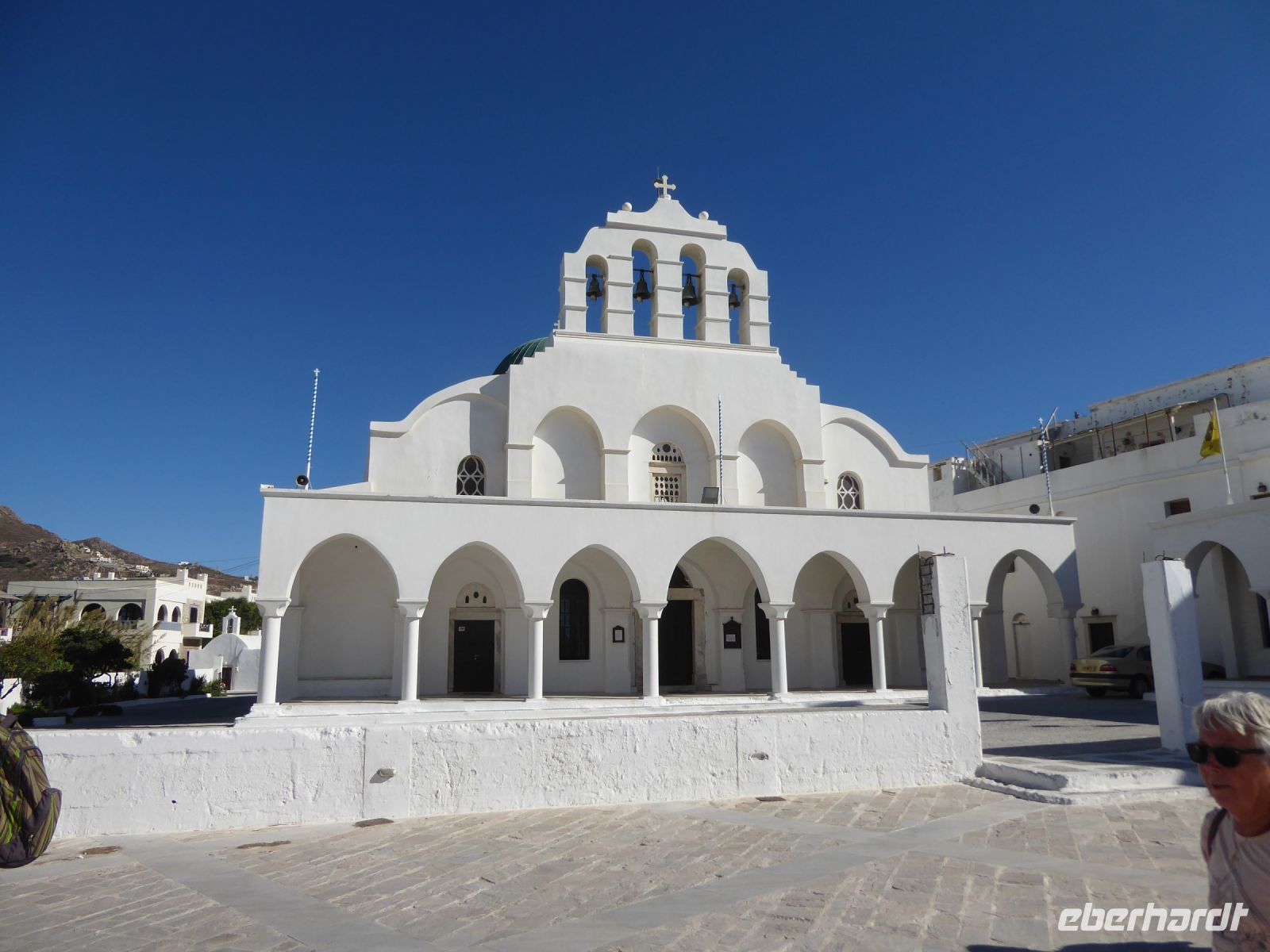 Die Koffer werden in den Bus geladen, und wir starten gleich mit unserem Guide Nikkos einen Rundgang durch den Hauptort der Insel, Parikia. Wir beginnen mit dem Besuch der berühmten „Kirche der 100 Türen“, die Panagia Ekotontapiliani oder auch Katapoliani-Kirche, eine der bedeutendsten byzantinischen Kirchen ganz Griechenlands, viele sagen auch die schönste Kirche des Landes. Nach Überlieferung wurde sie vom gleichen Architekten entworfen, der auch die Hagia Sofia in Istanbul gebaut hat.
