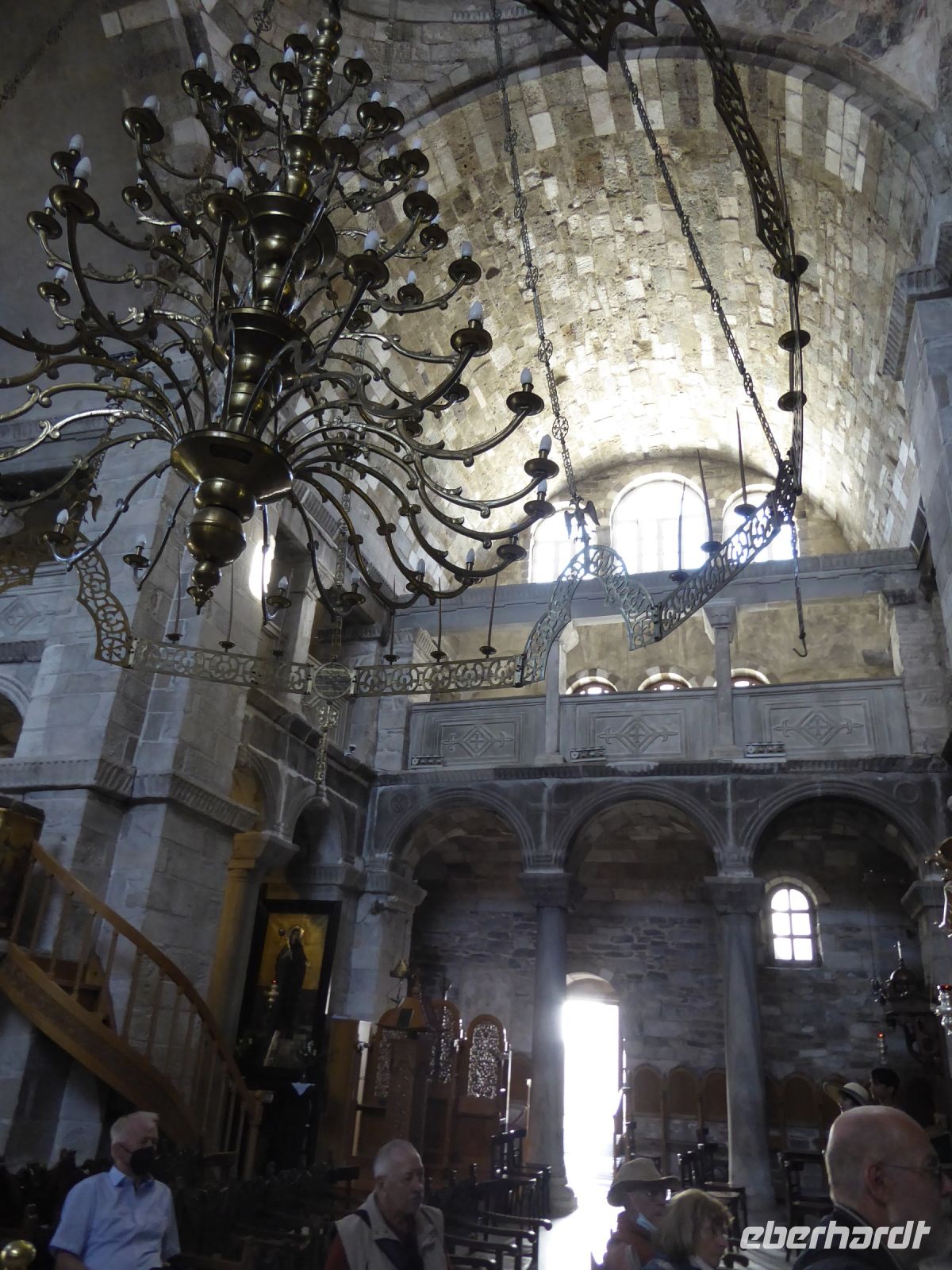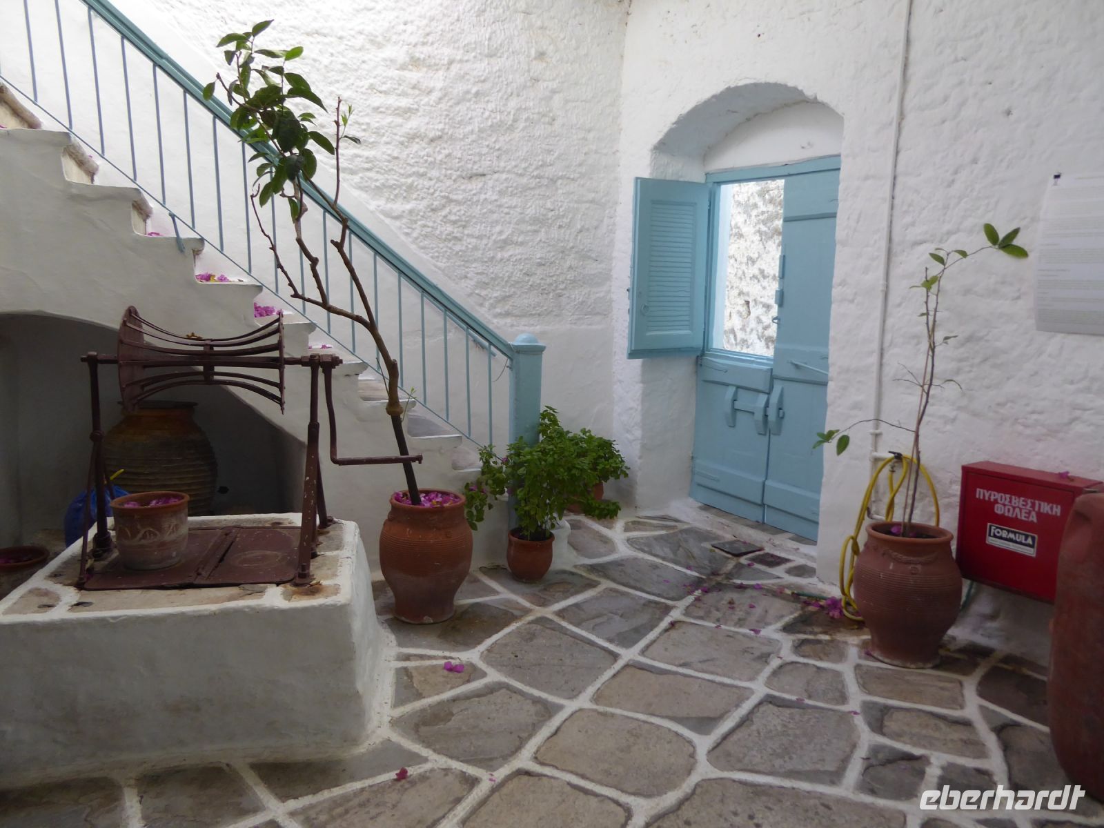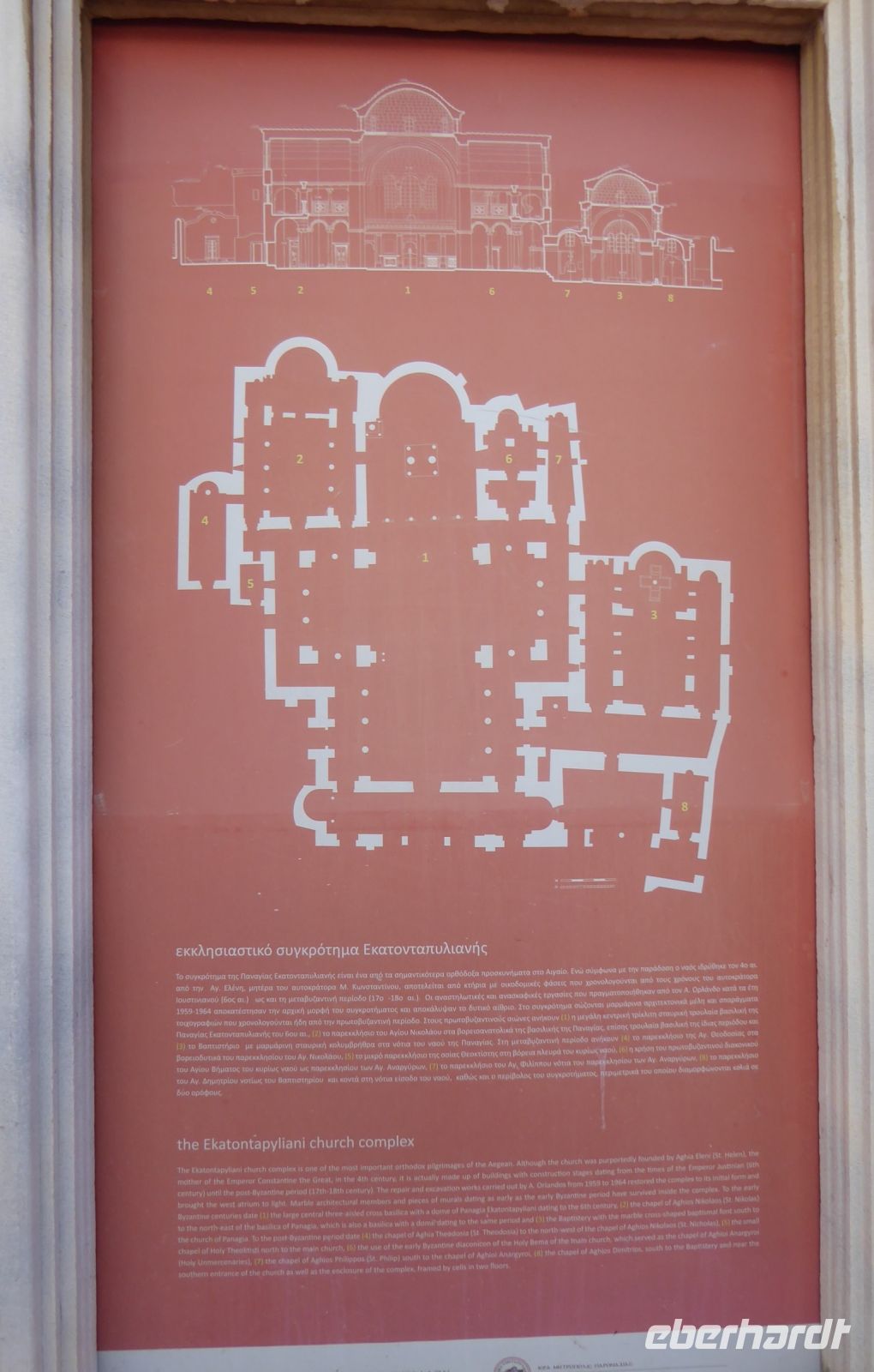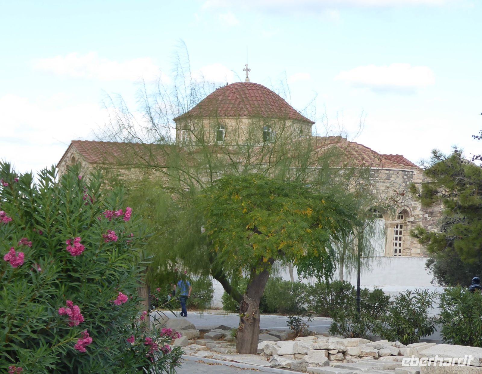 Die Koffer werden in den Bus geladen, und wir starten gleich mit unserem Guide Nikkos einen Rundgang durch den Hauptort der Insel, Parikia. Wir beginnen mit dem Besuch der berühmten „Kirche der 100 Türen“, die Panagia Ekotontapiliani oder auch Katapoliani-Kirche, eine der bedeutendsten byzantinischen Kirchen ganz Griechenlands, viele sagen auch die schönste Kirche des Landes. Nach Überlieferung wurde sie vom gleichen Architekten entworfen, der auch die Hagia Sofia in Istanbul gebaut hat.