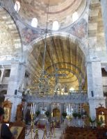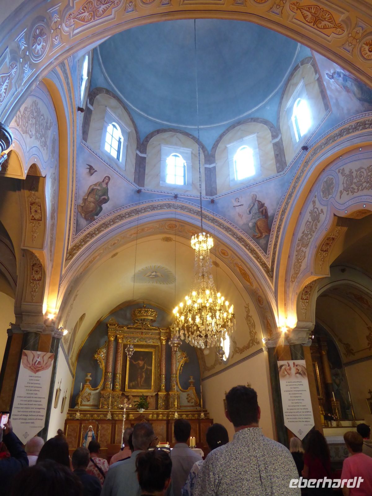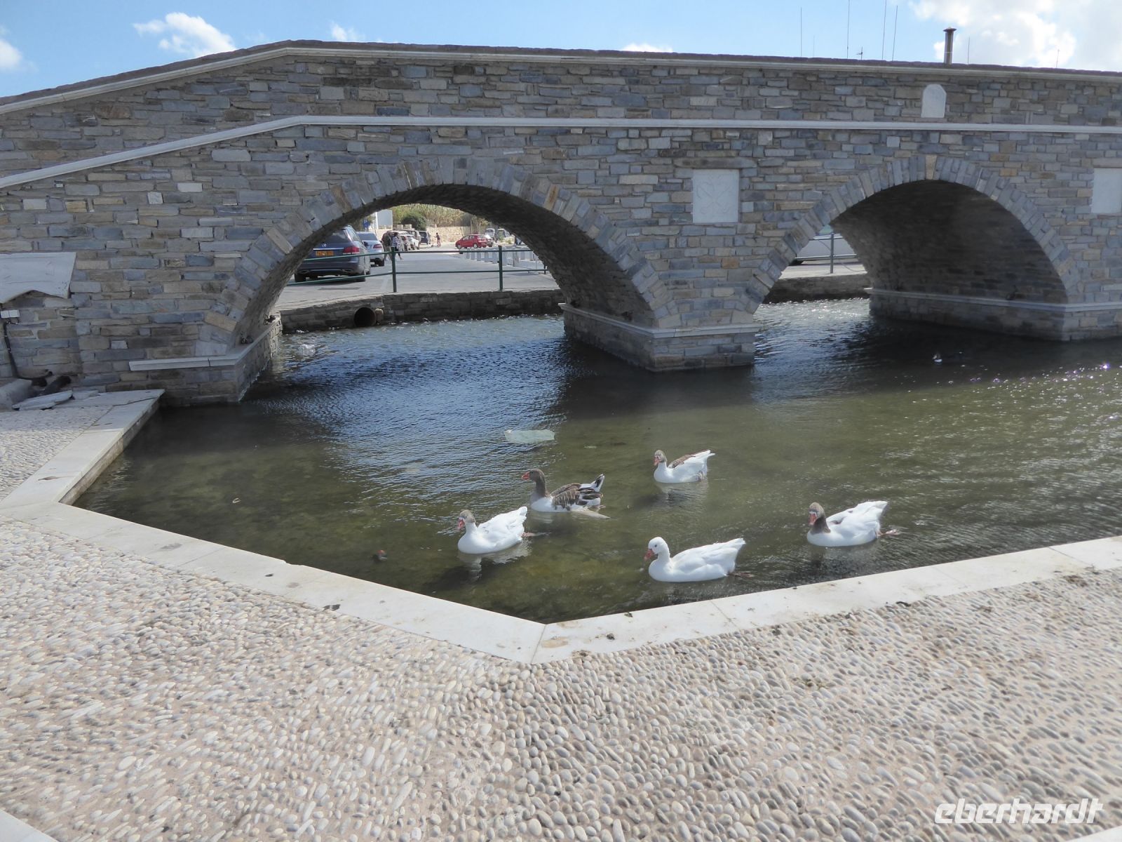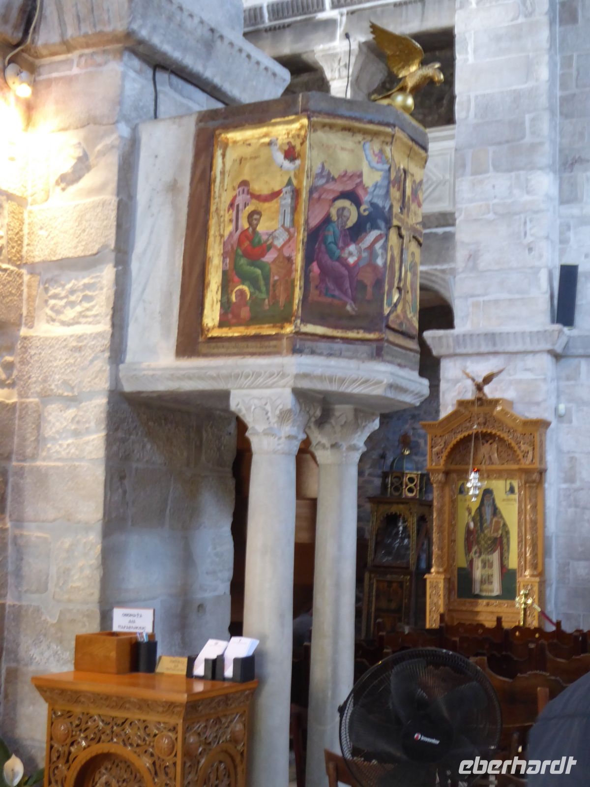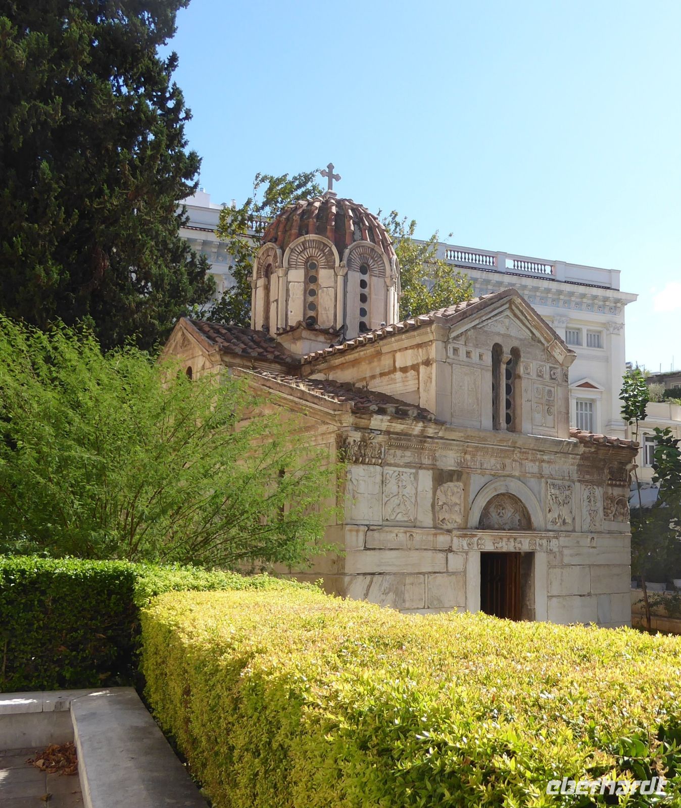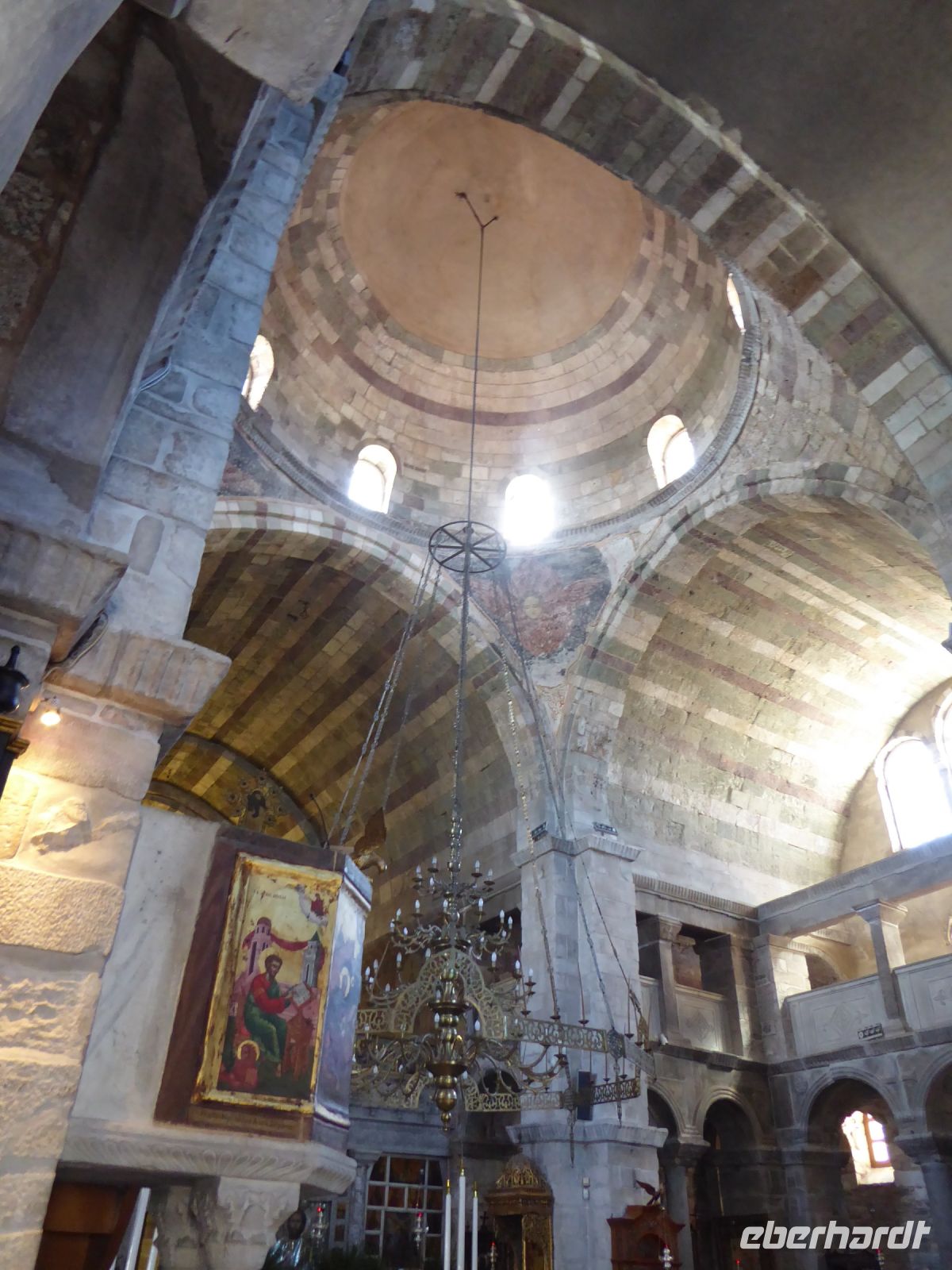 Die Koffer werden in den Bus geladen, und wir starten gleich mit unserem Guide Nikkos einen Rundgang durch den Hauptort der Insel, Parikia. Wir beginnen mit dem Besuch der berühmten „Kirche der 100 Türen“, die Panagia Ekotontapiliani oder auch Katapoliani-Kirche, eine der bedeutendsten byzantinischen Kirchen ganz Griechenlands, viele sagen auch die schönste Kirche des Landes. Nach Überlieferung wurde sie vom gleichen Architekten entworfen, der auch die Hagia Sofia in Istanbul gebaut hat.