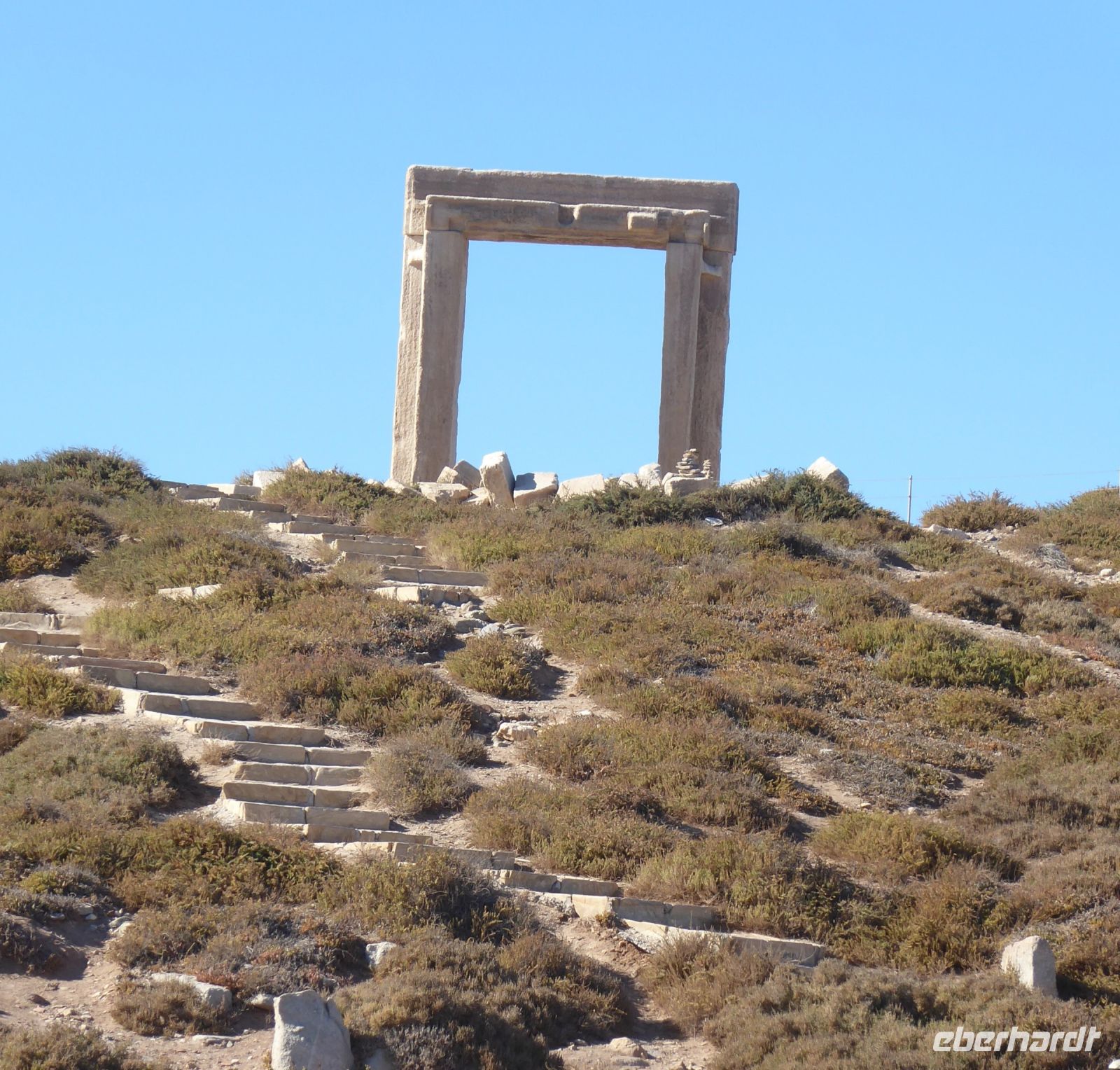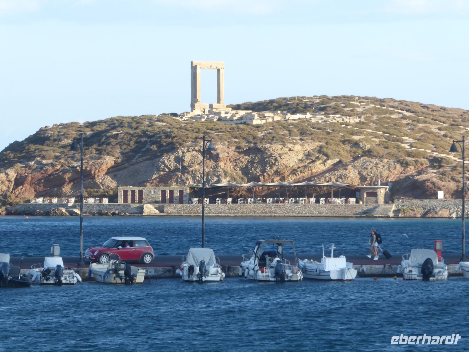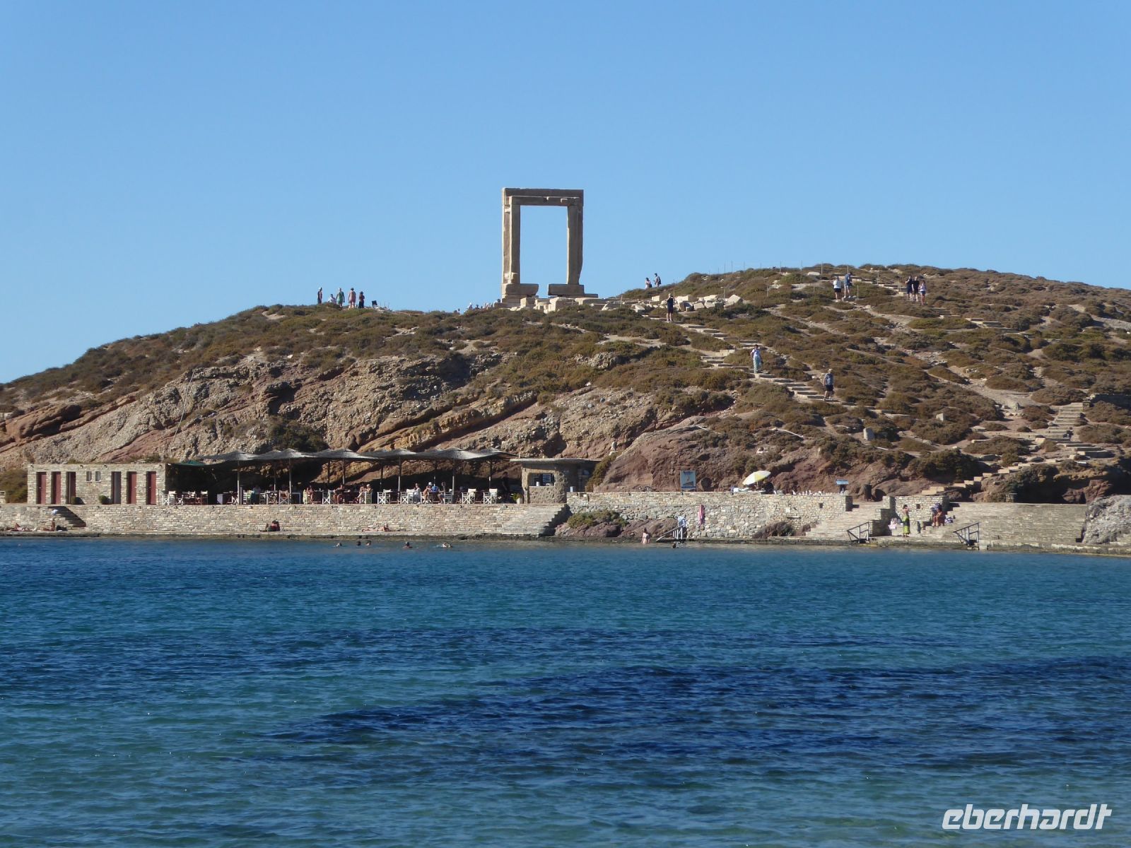 anschließend ging es wieder hinunter durch grüne Landschaft und landwirtschaftlich genutzten Flächen in die „Hauptstadt“ der Insel. Der Ort heißt wie die Insel Naxos, aber auch Chora oder Hora. Wie ein Amphitheater sind die weiß getünchten Häuser am Hügel über dem Hafen gebaut. In diesem Teil, Kastro genannt, gibt es enge, fast labyrinthartige Gassen und Bögen voller Geschäfte, Cafés, Restaurants etc. in denen man sich fast verirren kann. Was immer hilft: unten ist der Hafen und Wasserlinie! Dort findet man nach einem kurzen Spaziergang über einen Damm auch das Wahrzeichen der Stadt, die Portara, das Tempeltor von Naxos, gebaut aus Naxos-Marmor, knapp 6 Meter hoch, 3,65 Meter breit und jede Leibung fast 20 Tonnen schwer. Diese drei Teile wurden von einem etwa 10 km entfernten Steinbruch hierher transportiert, und das im 6. Jahrhundert v.Chr. Der zur Portara gehörigen/geplante Apollon-Tempel wurde allerdings nie fertig gestellt. Heute ist das Tor ein Touristenmagnet und Wahrzeichen der Stadt. Es gab genügend Freizeit in der Stadt, um alle Attraktionen genießen und/oder fotografieren zu können, auch um gemütlich in den Gassen des Kastro oder an der Wasserlinie das griechische Leben zu genießen. Am späten Nachmittag ging es dann zurück ins Hotel, wo es am Abend wieder ein leckeres Abendessen gab und einen individuellen Ausklang des Tages.