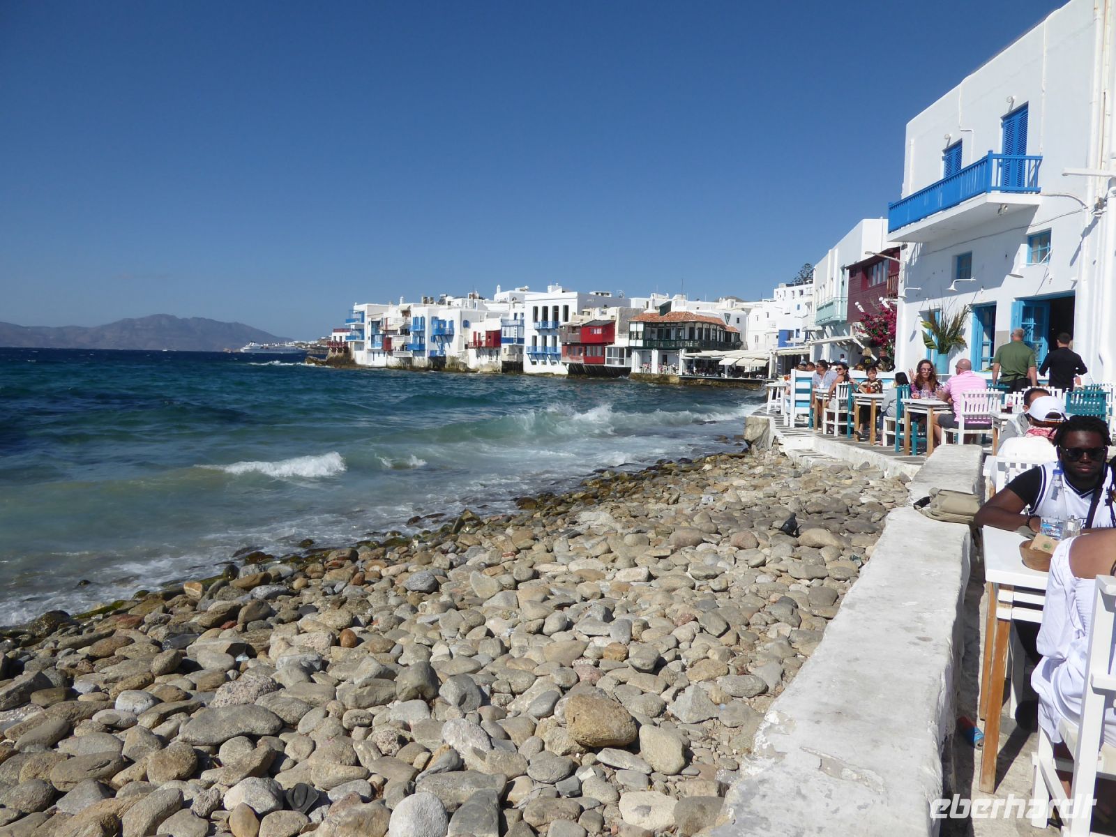 Die Wahrzeichen Mykonos‘ sind die Kato Mili, die sechs Windmühlen am Rand der Stadt. Weiter führte uns dann unser Guide ins Viertel „Klein-Venedig“, im venezianischen Stil gebaute Häuser entlang der Strandpromenade. Nicht nur die Gebäude, auch die Preise in der Gastronomie erinnern an den Markusplatz in Venedig… Mykonos gilt als eine der teuersten Orte in Griechenland, ja am Mittelmeer. Das hält die Besucher jedoch nicht davon ab, Sommer wie Winter auf diese Insel zu kommen; ist sie doch der Inbegriff von Griechenland für viele Ausländer (nicht für Griechen!).