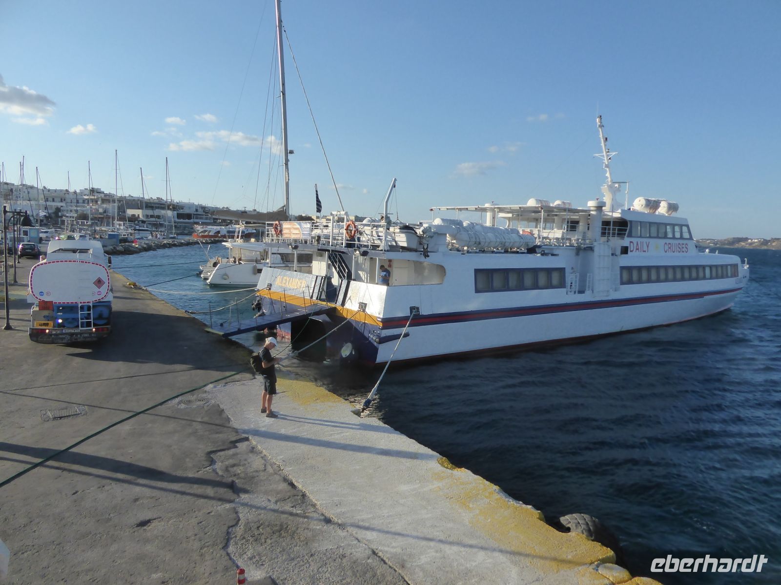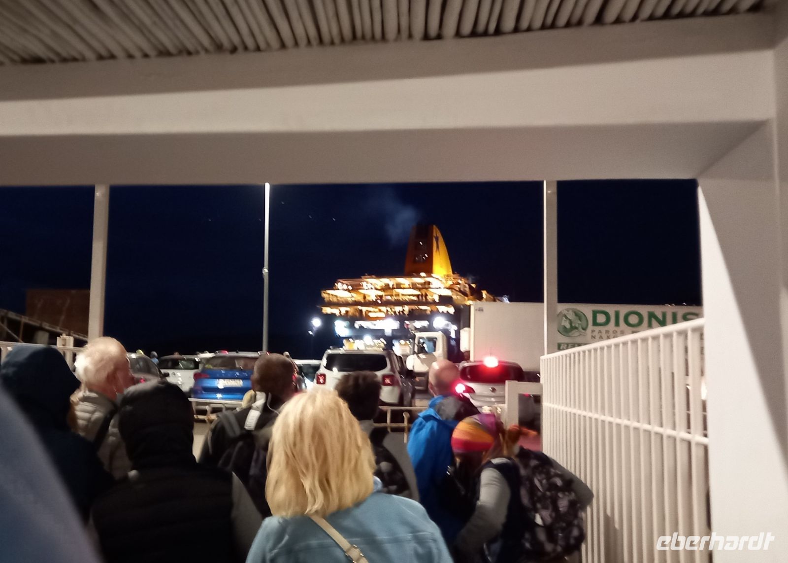 Beim Boarding der Fähre machten wir die erste Erfahrung mit diesen Großfähren, die alle größeren Inseln der Kykladen ansteuern. Alles muss schnell gehen: LKWs fahren von der Fähre, andere auf die Fähre, das gleiche mit PKWs und dann endlich die Fußgänger, die mit ihren Koffern über die Laderampe auf das Schiff strömen. Nervig der laute Alarmton im Laderaum der Fähre, der zu Vorsicht ermahnt, weil überall noch rangiert wird und die Laderampe schon langsam geschlossen wird, obwohl noch nicht alle Fahrzeuge stehen, die Koffer der Passagieren noch keinen Platz haben, etc. man fühlt auch, dass das Schiff schon abgelegt hat mit noch halb offener Rampe. Aber letztlich geht alles gut. Nikkos erklärt, das dies die normale Laderoutine ist, anders können die Fähren ihren engen Zeitplan nicht einhalten.