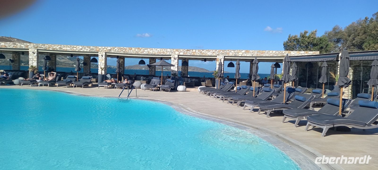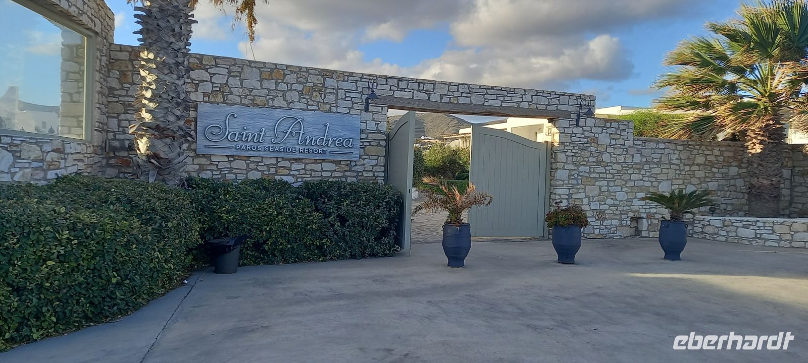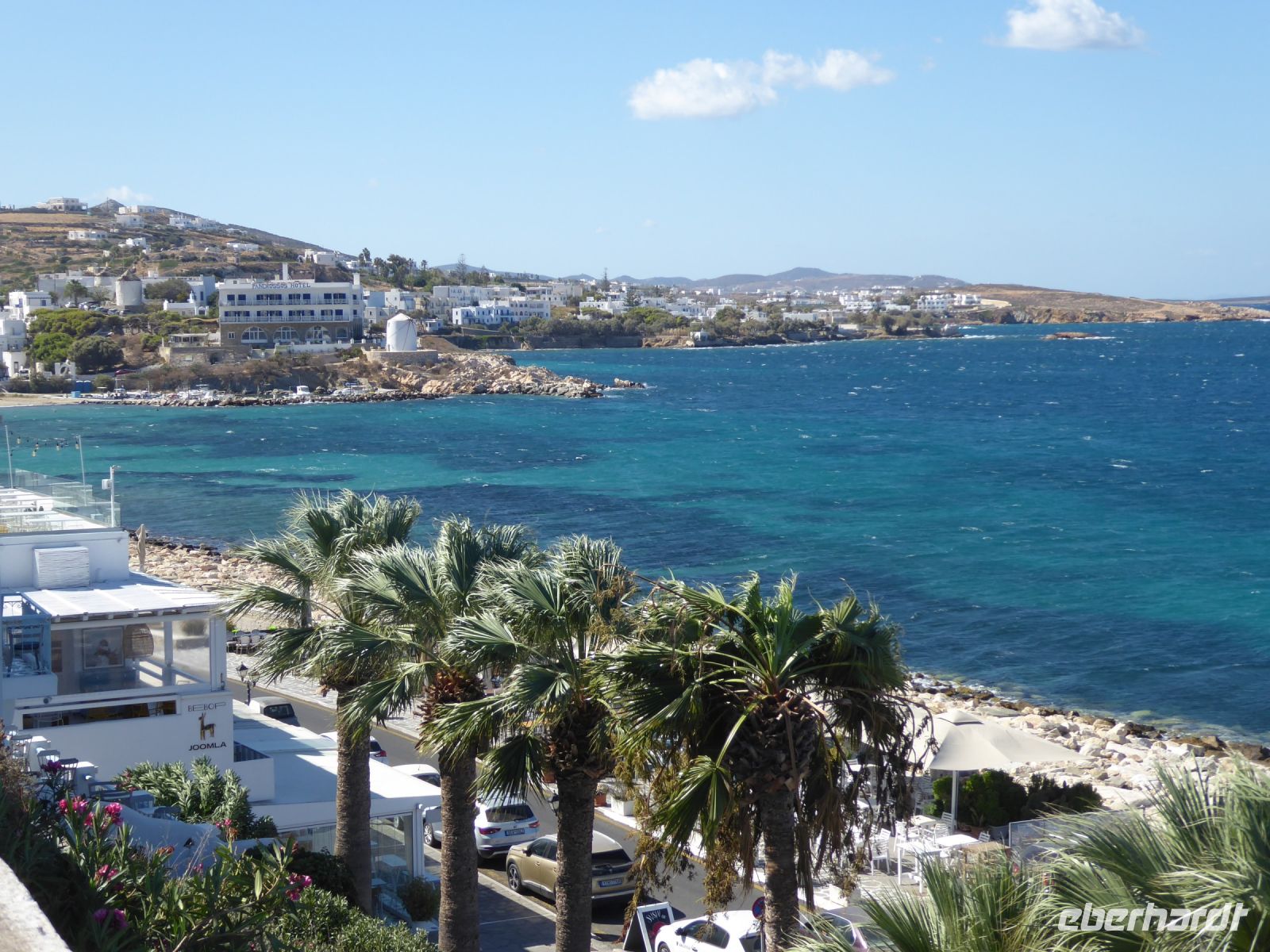 Anschließend ging es in die Altstadt, die wieder mit weiß getünchten Häusern, Gärten, verschlungenen weiß gepflasterten Gassen, Boutiquen und Tavernen begeistert. Der Rundgang endete an der Strandpromenade. Von hier aus konnten wir dann noch für zwei Stunden das Städtchen auf eigene Faust erkunden. Treffpunkt zur Fahrt zu unserem Hotel auf Paros ist wieder der Hafen, wo wir bereits die Koffer in den Bus geladen hatten. Der Bus brachte uns zum Saint Andrea Seaside Resort, direkt am Meer in der Nähe von Naoussa gelegen. Schnell sind wir eingecheckt, das Personal bringt unseren Zimmern in diesem sehr weitläufigen Resort. Dann war Zeit zum Entspannen, am Pool oder bei einem Spaziergang entlang der Wasserlinie, die hier nicht unbedingt zum Baden geeignet ist. Dafür entschädigt der großzügige Poolbereich des Resorts. Um 19.00 h trafen sich dann alle zu einem hervorragenden Abendessen im Restaurant des Hotels. Mit einem Absacker in der Poolbar (windgeschützt!) konnte der Tag ausklingen.