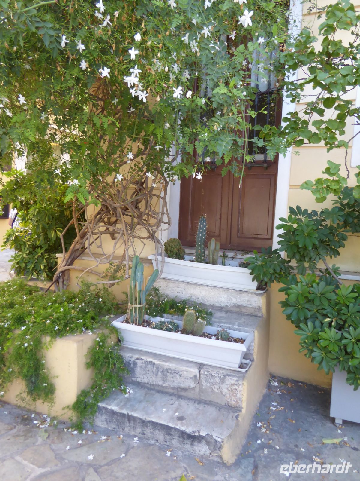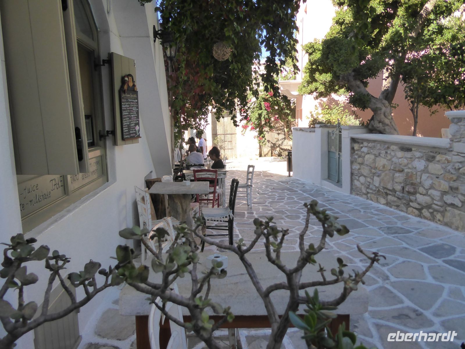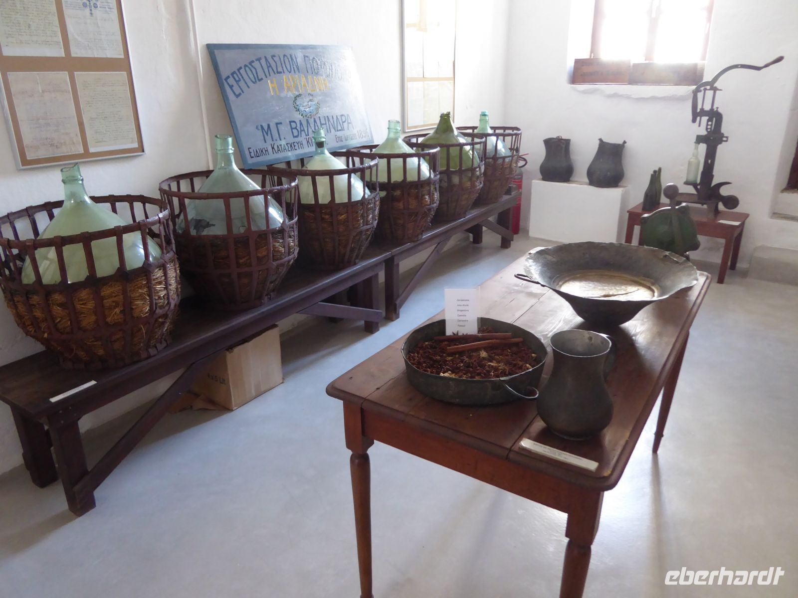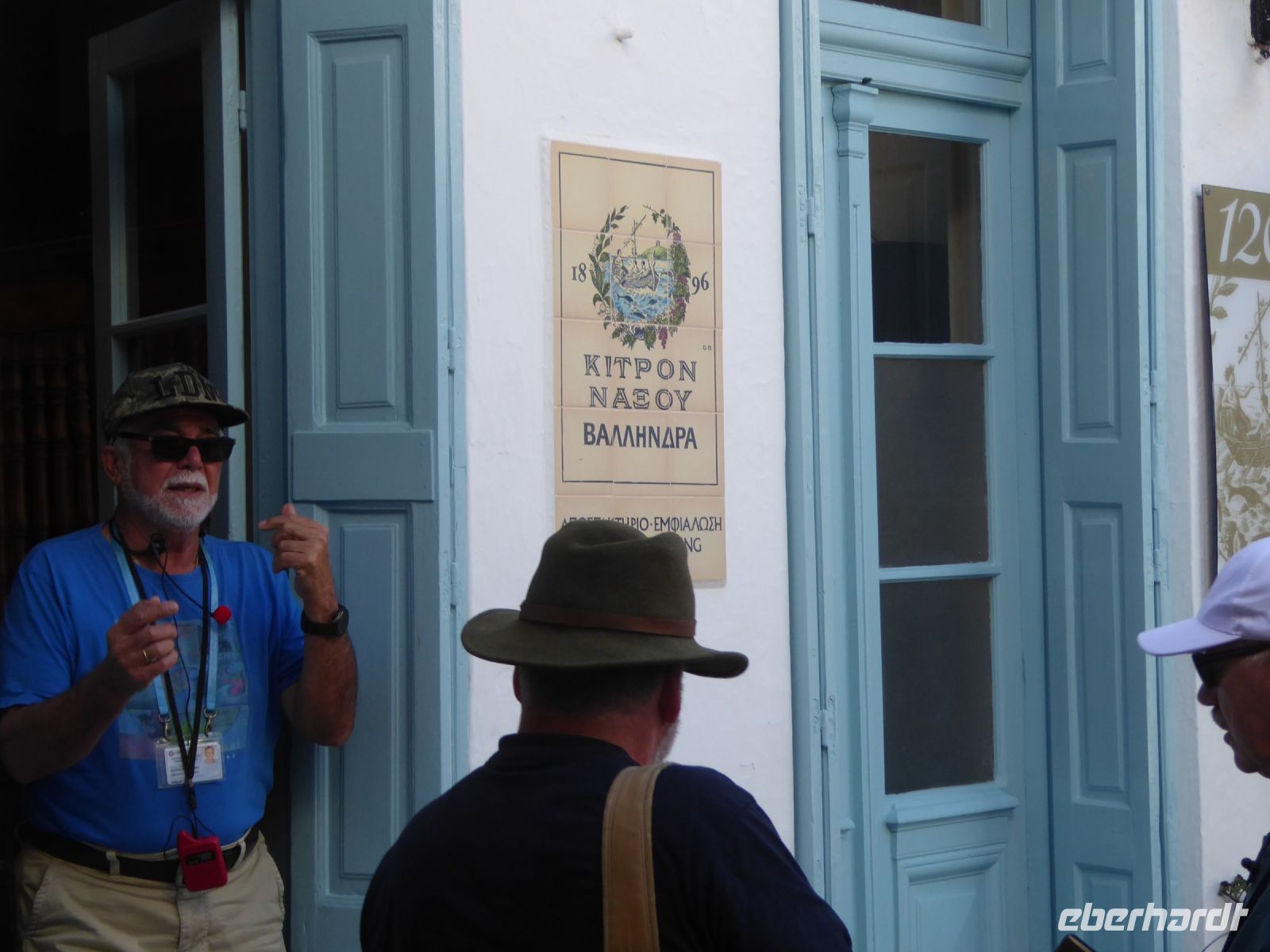 Weiter ging es zum Bergdorf Apiranthos, in 800 m an den Hängen dies Mount Fanari gelegen. Das Dorf ist autofrei, was nicht verwundert, wenn man die engen Sträßchen und Gassen durchwandert, die großenteils mit Marmor gepflastert sind. Nachdem Nikkos uns durch die „Hauptstraße“ des Dorfes geführt hat, gibt es Freizeit zum weiteren Erforschen und Fotografieren der malerischen Gassen und Treppen, aber auch Zeit für einen Kaffee (Frappé) in einem der vielen Cafés an den der Straße. Weiter fuhren wir nach Chalki, gelegen auf der Targea Hochebene der Insel. Ein idyller Ort mit kleinen Gassen, mit gut renovierten, alten Häusern. Man sitzt unter Bäumen und blühenden Rankern in Tavernen und Cafés an den Straßen. Hier gibt es die Destillerie „Vallindra“, die aus den Blättern des Zedratbaumes den Insellikör „Kitro“ herstellt. Diesen Likör gibt es nur auf Naxos – und wir durften dieses seltene, alkoholische Getränk kosten.