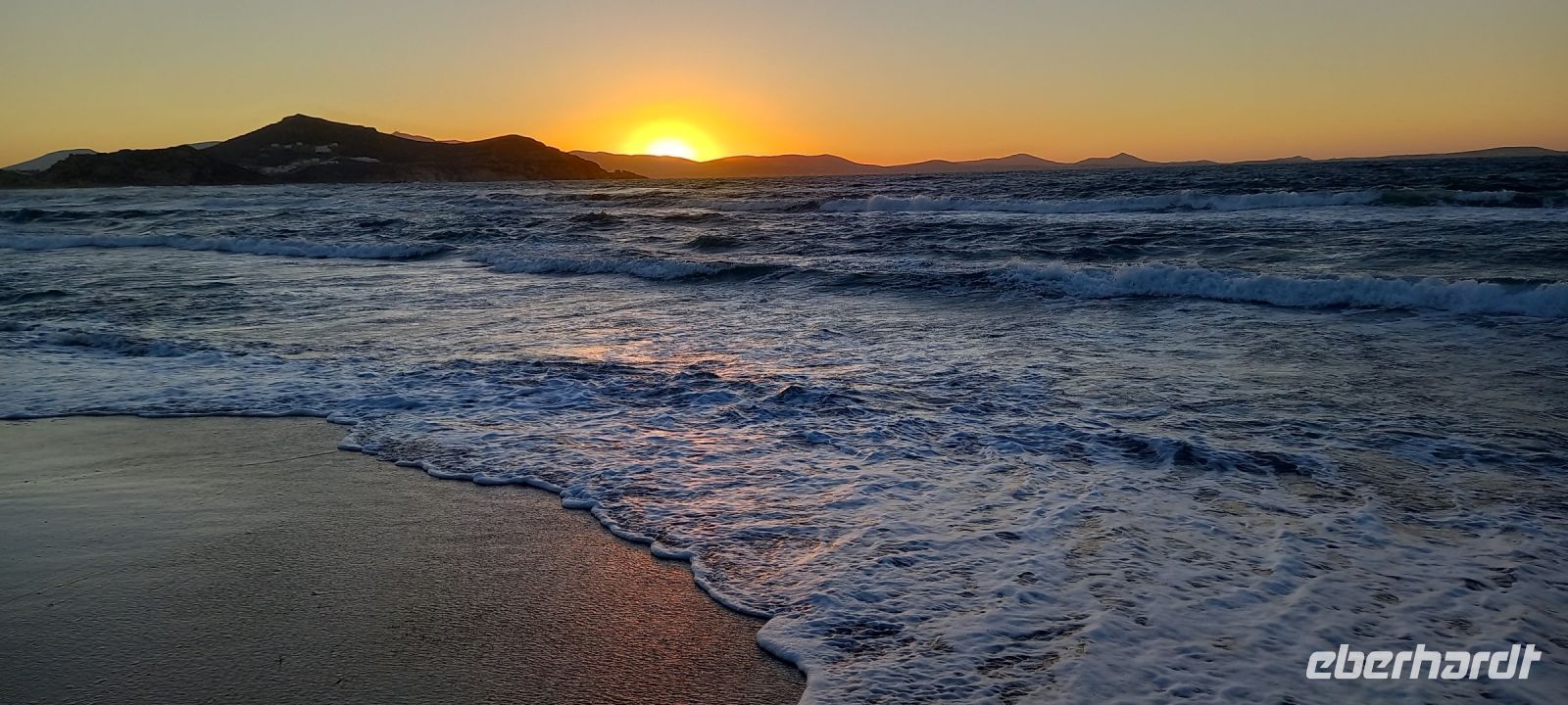 Nach 1 ½ stündiger Überfahrt erreichen wir die Insel Naxos. Alle wundern sich, dass jeder seinen Koffer wieder gefunden hat. Dann geht es mit dem bereitstehenden Bus zu unserem sehr schönen Hotel etwas außerhalb der Inselhauptstadt Chora. Das Alkyoni Beach Hotel liegt direkt in den Dünen am Strand. Das Einchecken geht schnell und einfach, die Zimmer werden bezogen, und wer gleich anschließend zum Strand geht, erlebt einen wunderbaren Sonnenuntergang über dem Meer. Der abendliche Wind hat Wellen aufgebaut, wie brechend auf den Strand laufen, dazu der Sonnenuntergang…! Traumhaft!