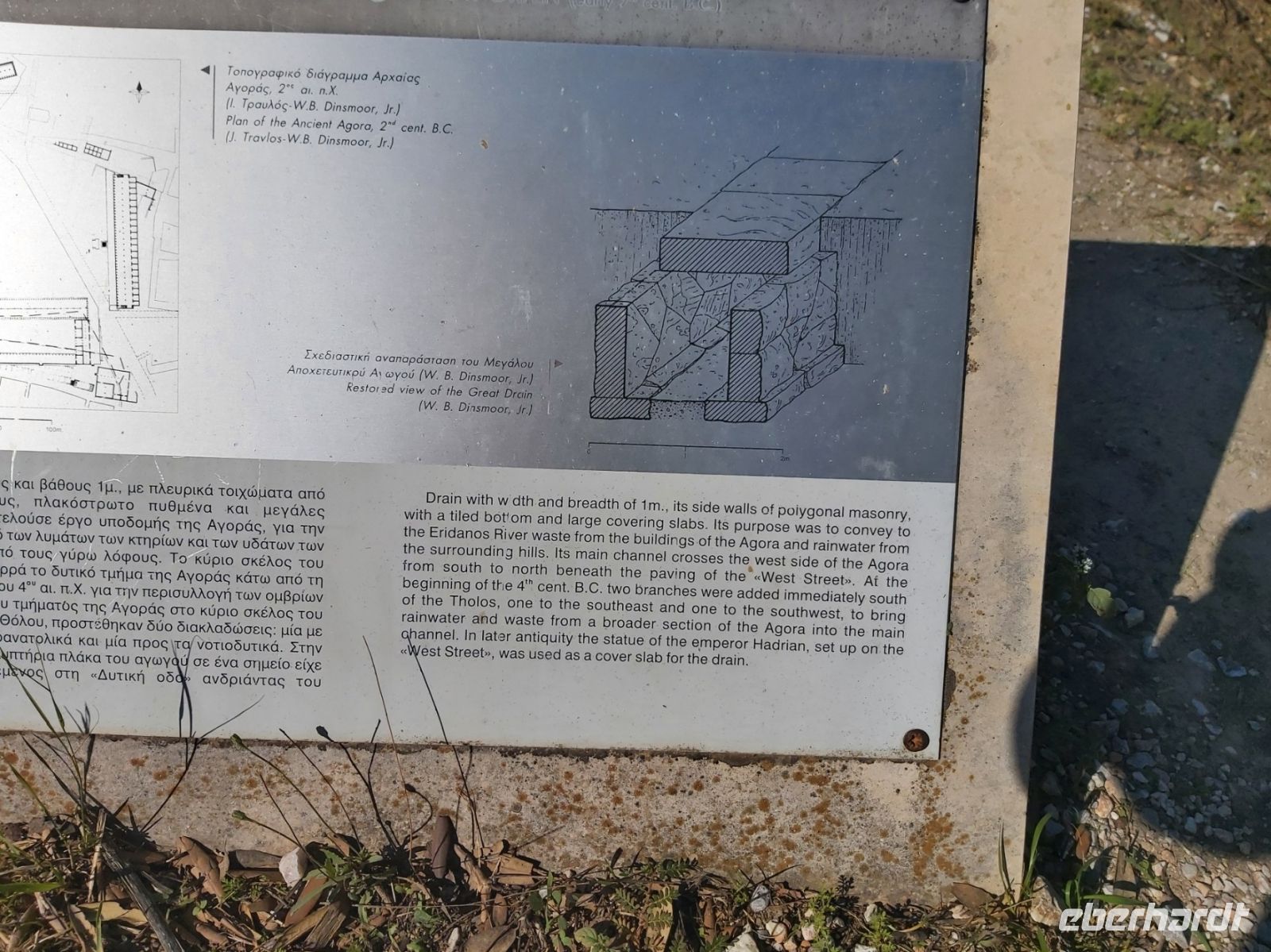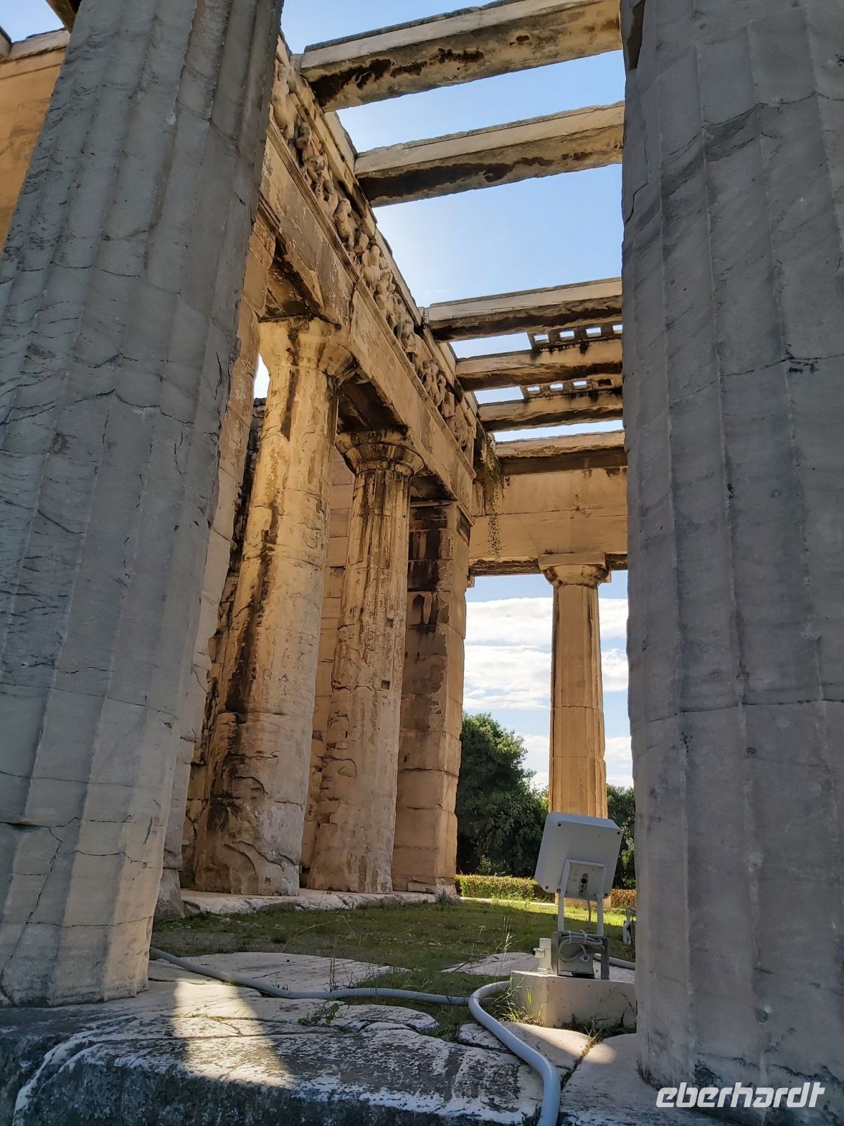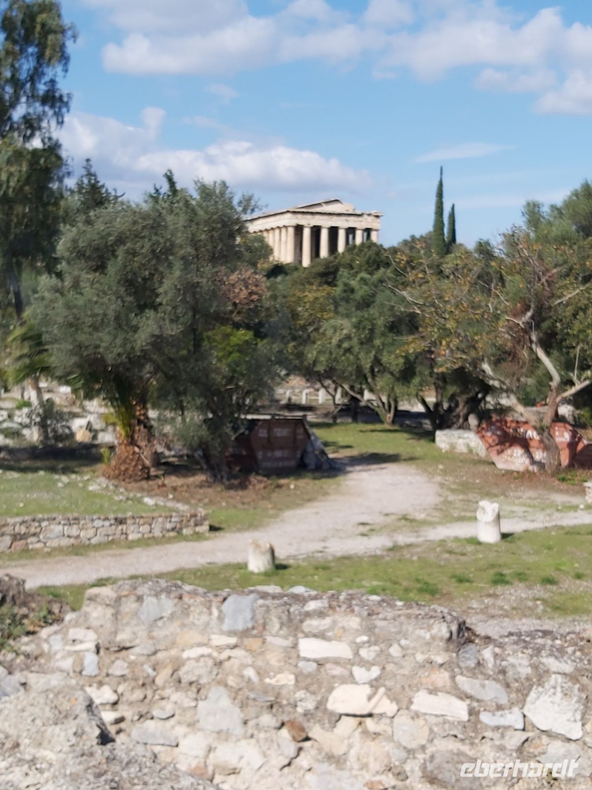 Wir besuchen zunächst das Museum der Agora und verschaffen uns einen Überblick über die Funktion der Gebäude und Plätze. Dann durchschreiten wir die Aussenanlagen bis zum Tempel des Hephaistos. An den Resten der Kanalisation kann man den Fortschritt der technischen Infrastruktur zur Organisation des Lebensraumes erkennen. Bildung hat in der Antike Priorität. Davon zeugt ein Gymnasium unterhalb des Tempels.