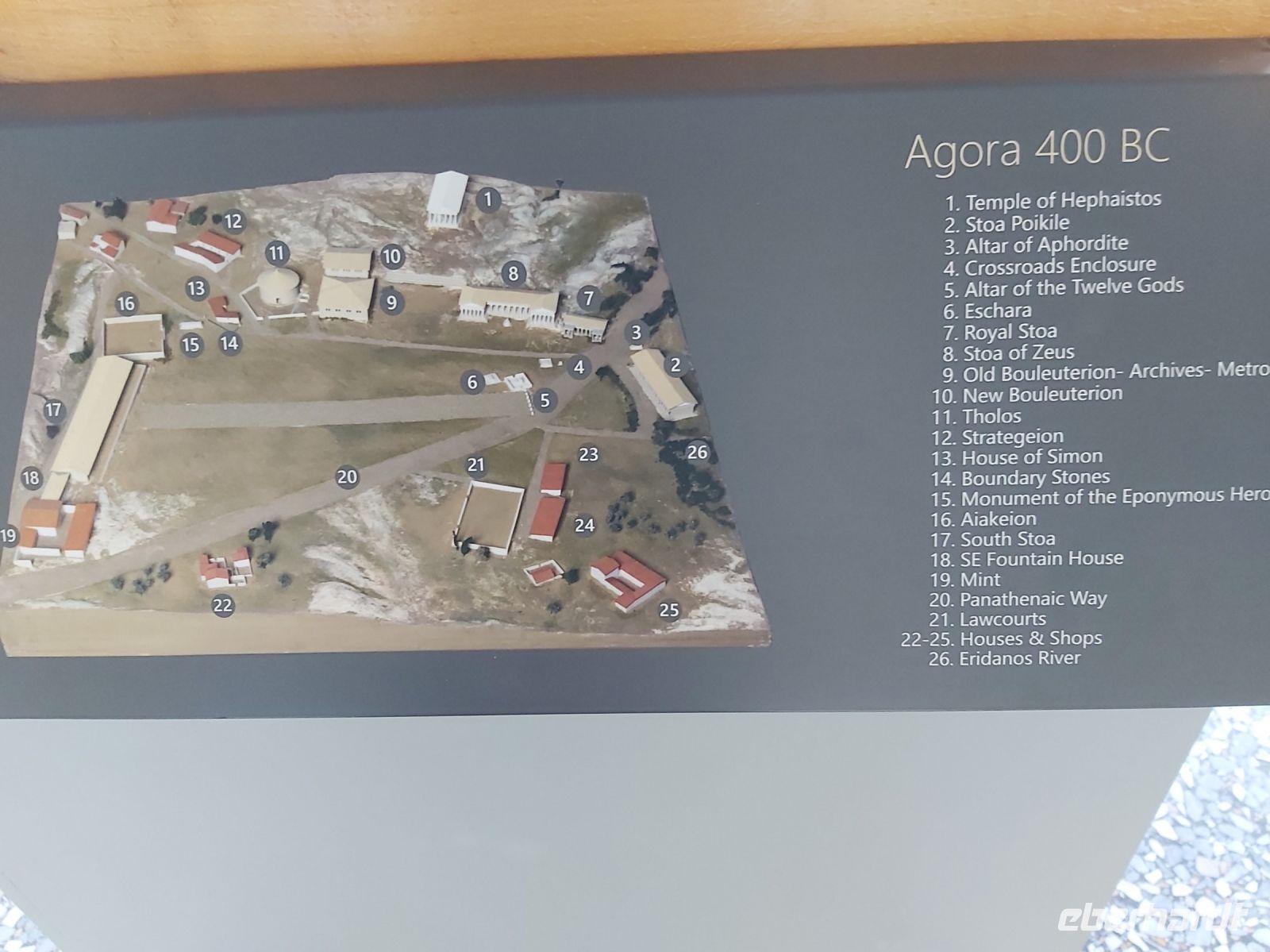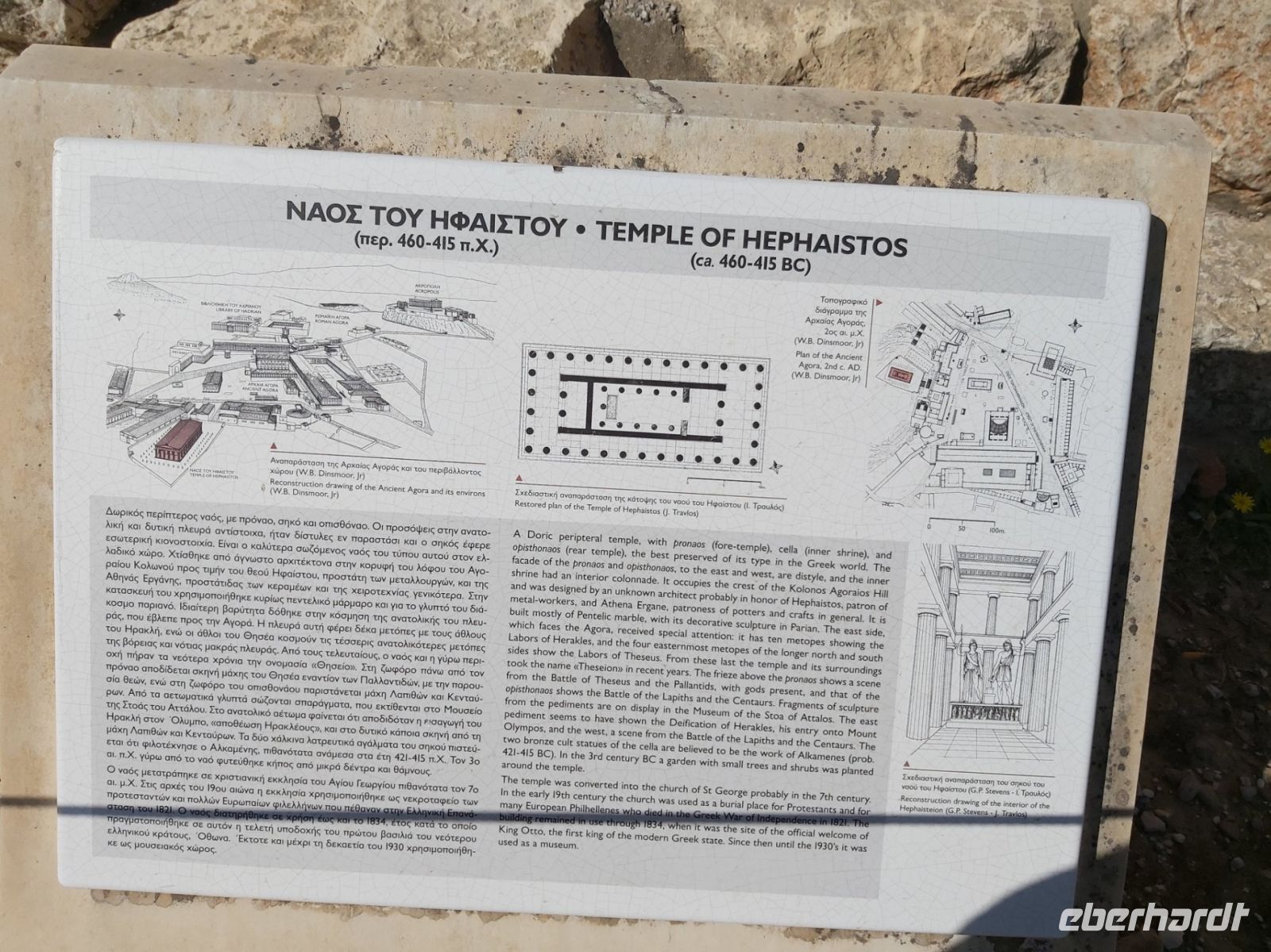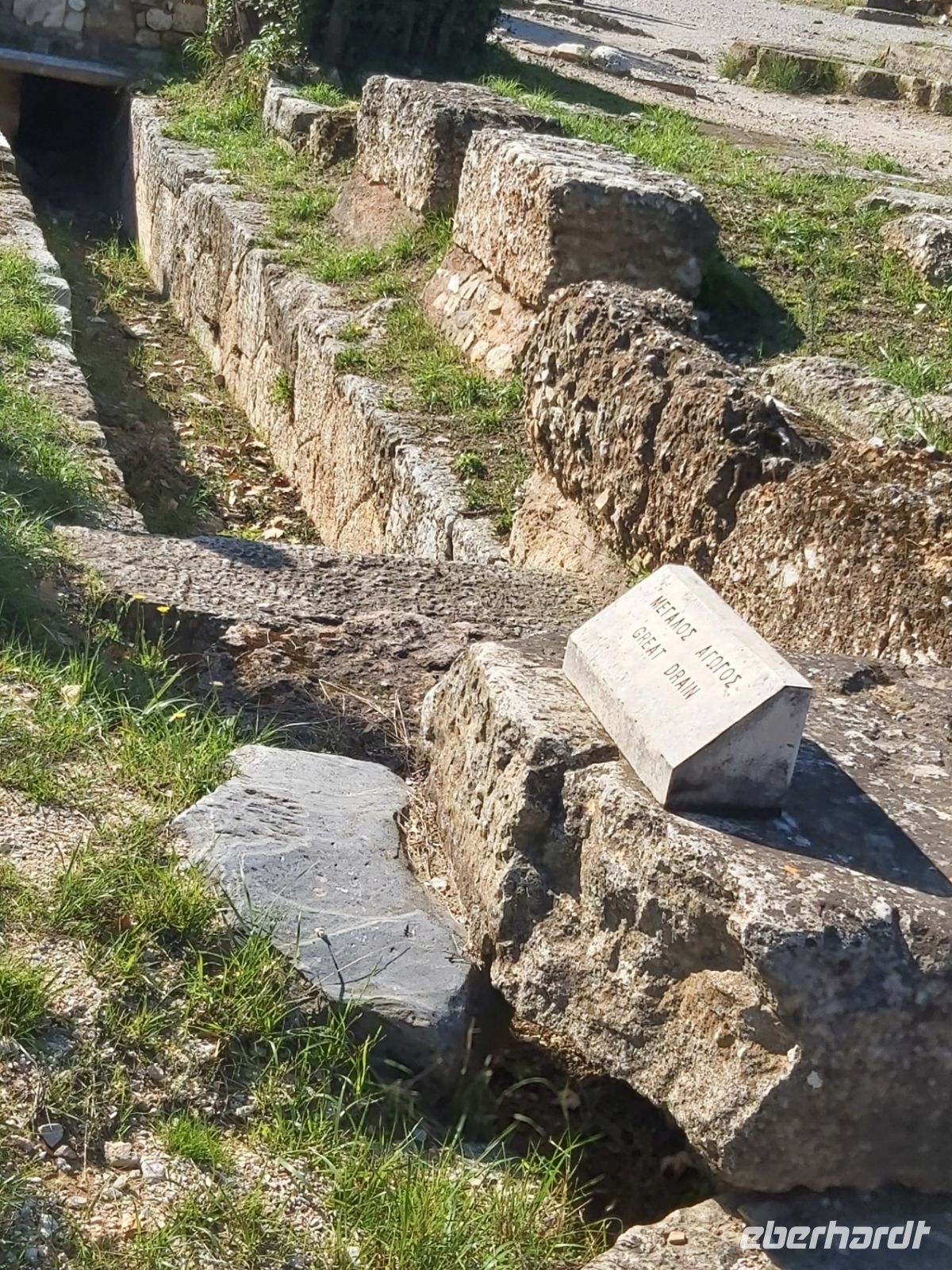 Wir besuchen zunächst das Museum der Agora und verschaffen uns einen Überblick über die Funktion der Gebäude und Plätze. Dann durchschreiten wir die Aussenanlagen bis zum Tempel des Hephaistos. An den Resten der Kanalisation kann man den Fortschritt der technischen Infrastruktur zur Organisation des Lebensraumes erkennen. Bildung hat in der Antike Priorität. Davon zeugt ein Gymnasium unterhalb des Tempels.