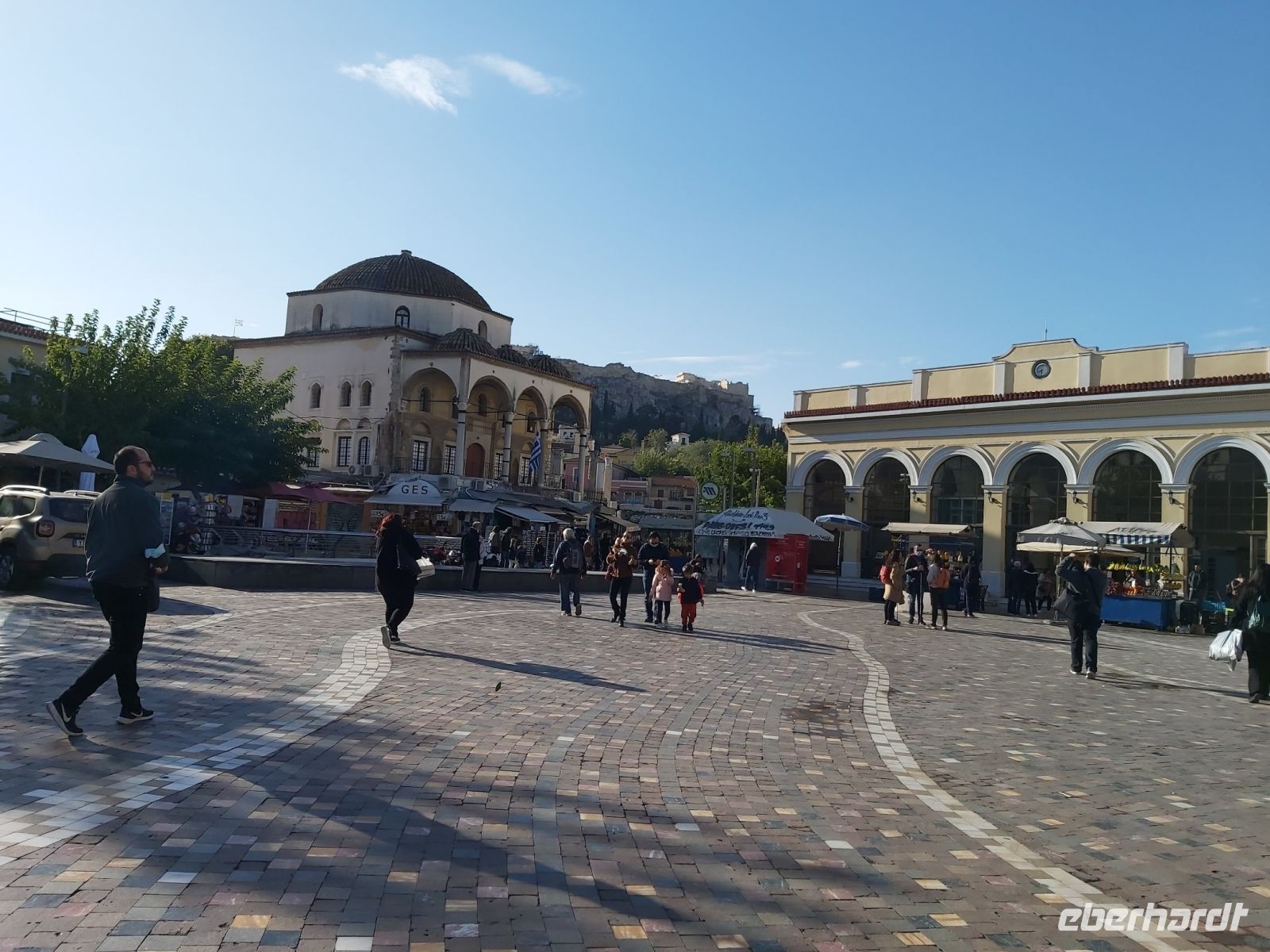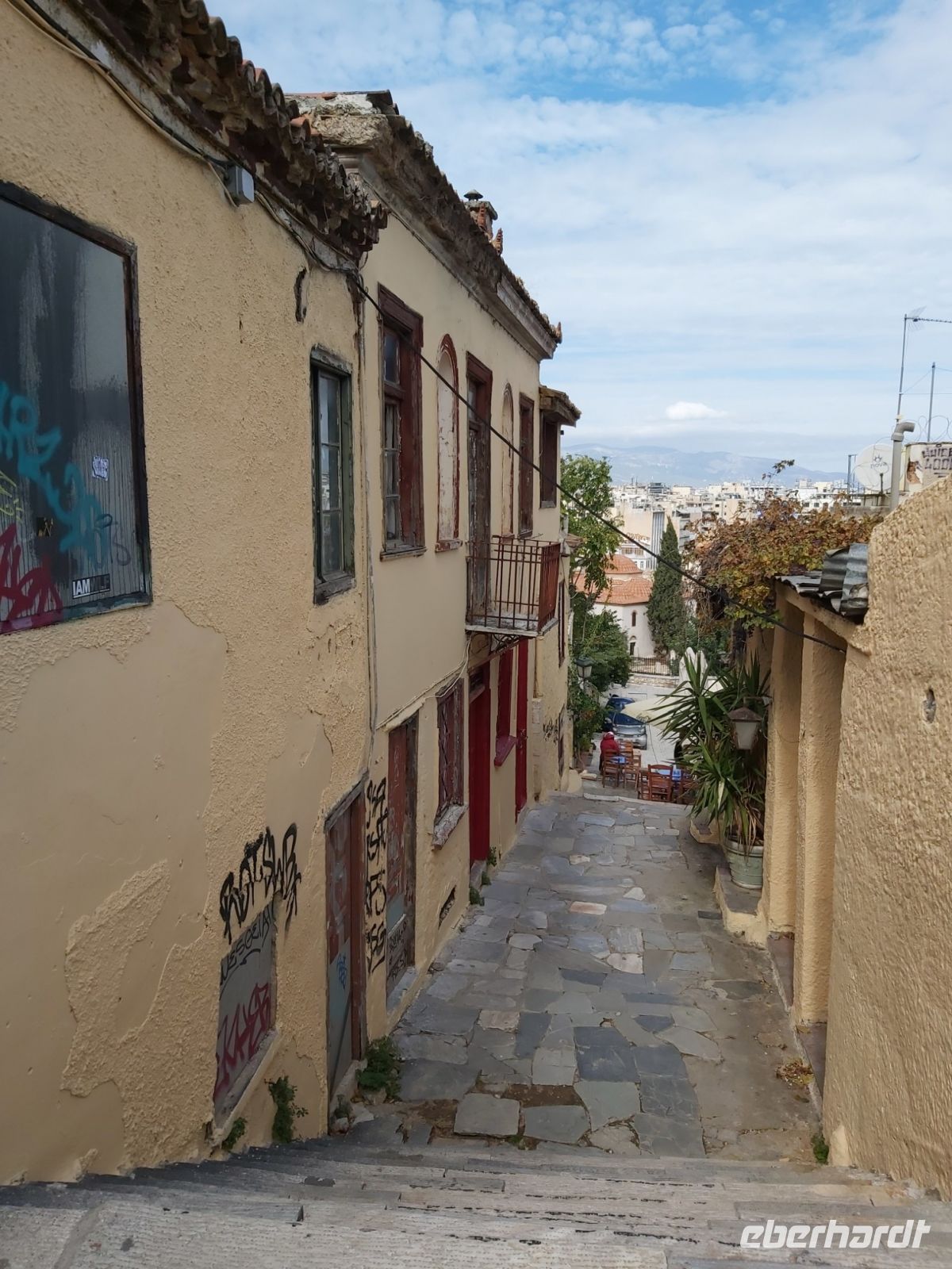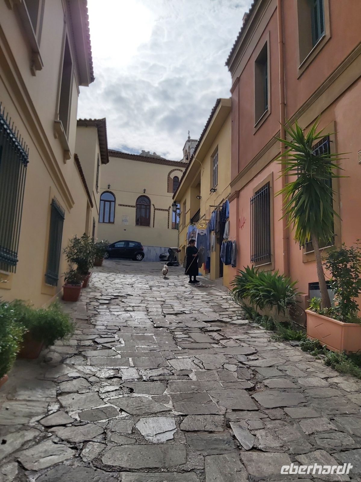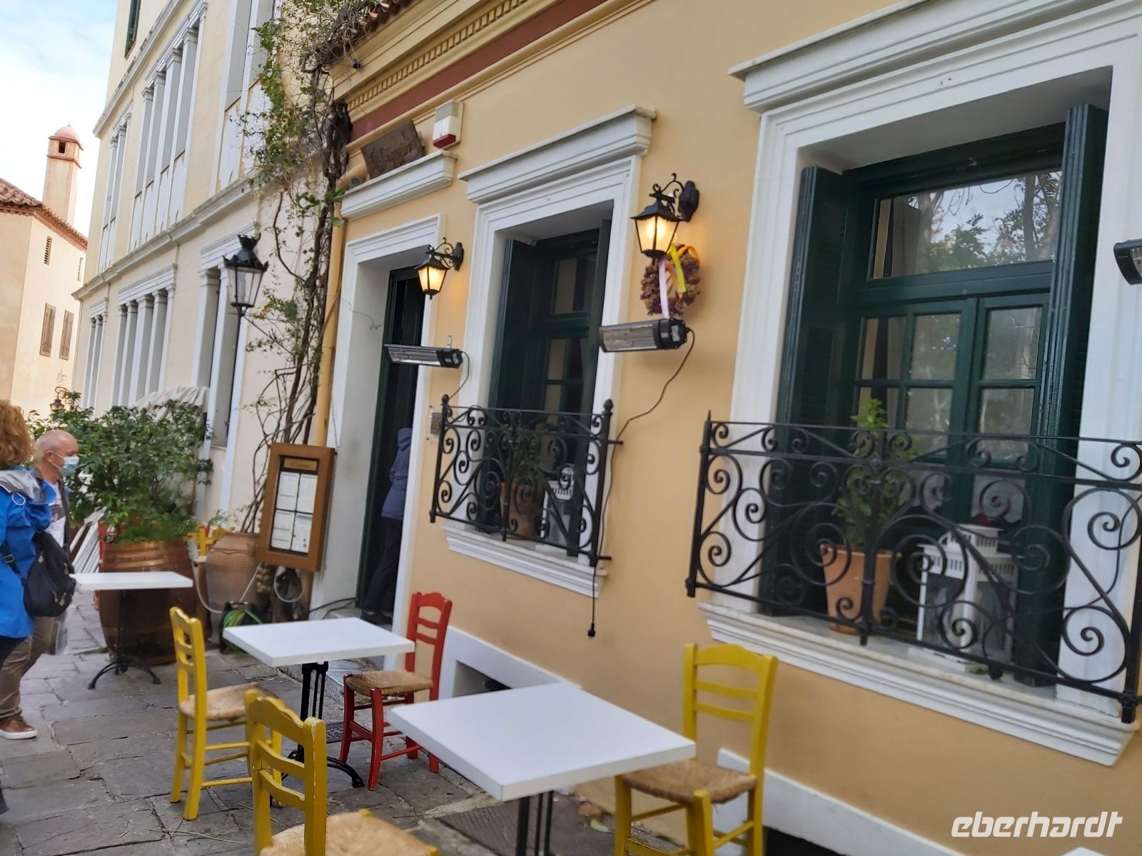 Wer in Athen übernachtet und nicht mit einem Kreuzfahrtschiff für einen Athen Stopp unterwegs ist, kann die Gunst des zeitigen Aufstieges nutzen. So genießt man das Glück, fast allein auf der Akropolis zu sein. Natürlich profitierten wir hier auch von dem coronabedingten Rückgang der Besucher. Die Gebäude der Akropolis sind in vielen Reiseberichten ausführlich beschrieben worden. Daher konzentrieren wir uns auf Eindrücke, die in Verbindung mit Zeit, Raum u. Individualität der Gruppe besonders waren. Das Wetter zeigt sich gegen Mittag von der Sonnenseite. Wir erkundeten nach dem Abstieg die Gassen der Plaka. Die meisten Häuser sind schön restauriert. Wegen der Beschränktheit der Parkflächen werden die Autos in gegenseitigem Einvernehmen zugeparkt. Der, der zuletzt am Tag rausfahren muss, darf zugeparkt werden. Offensichtlich kennt man die Zeitgewohnheiten der Nachbarn.