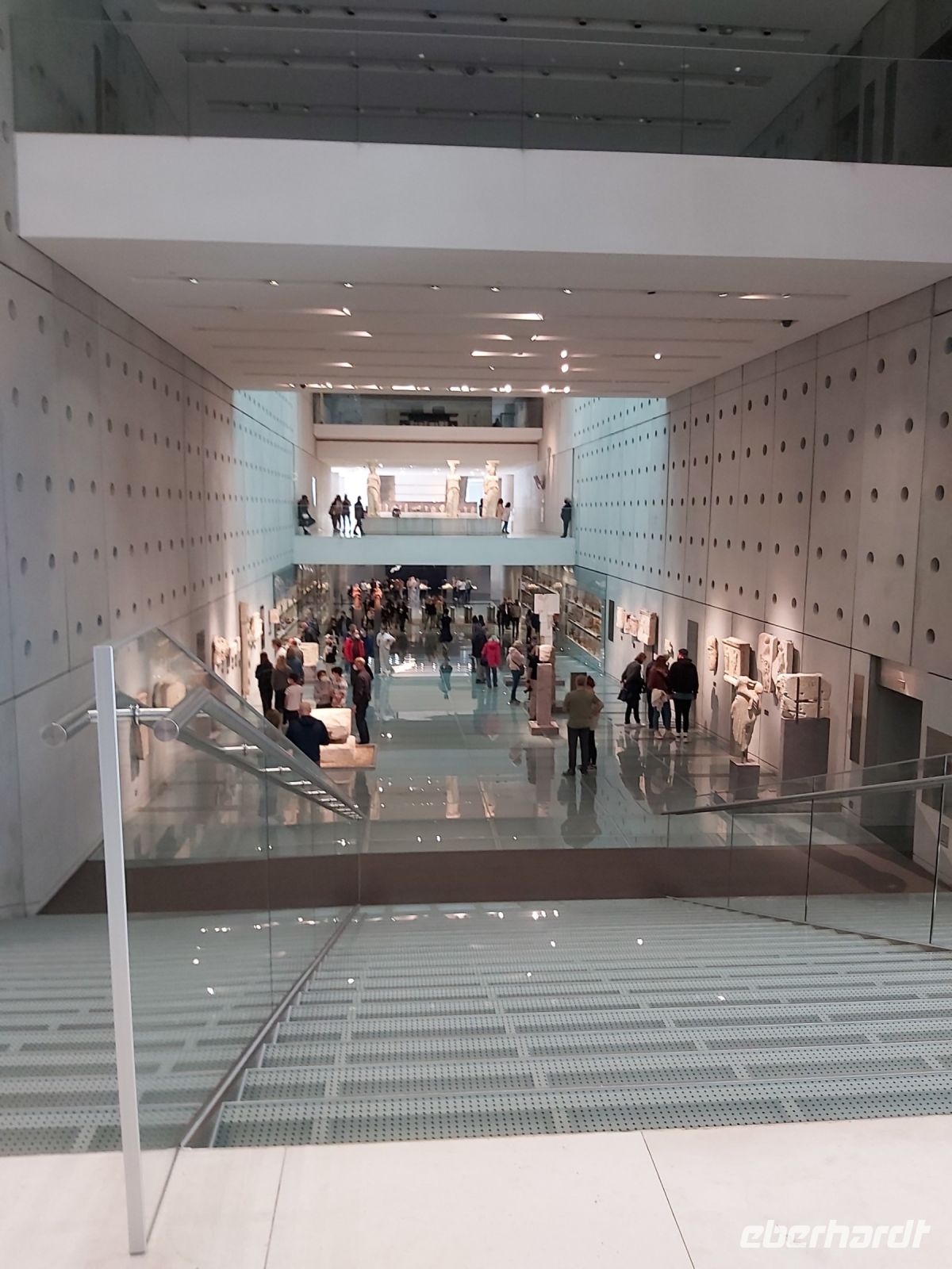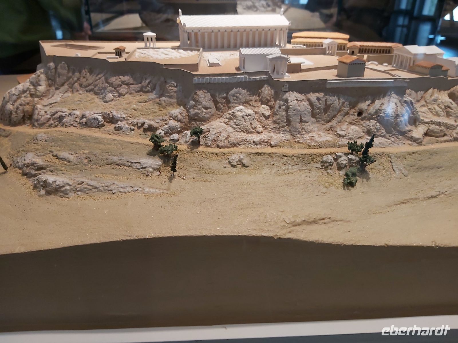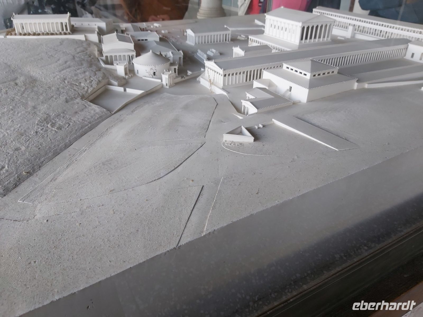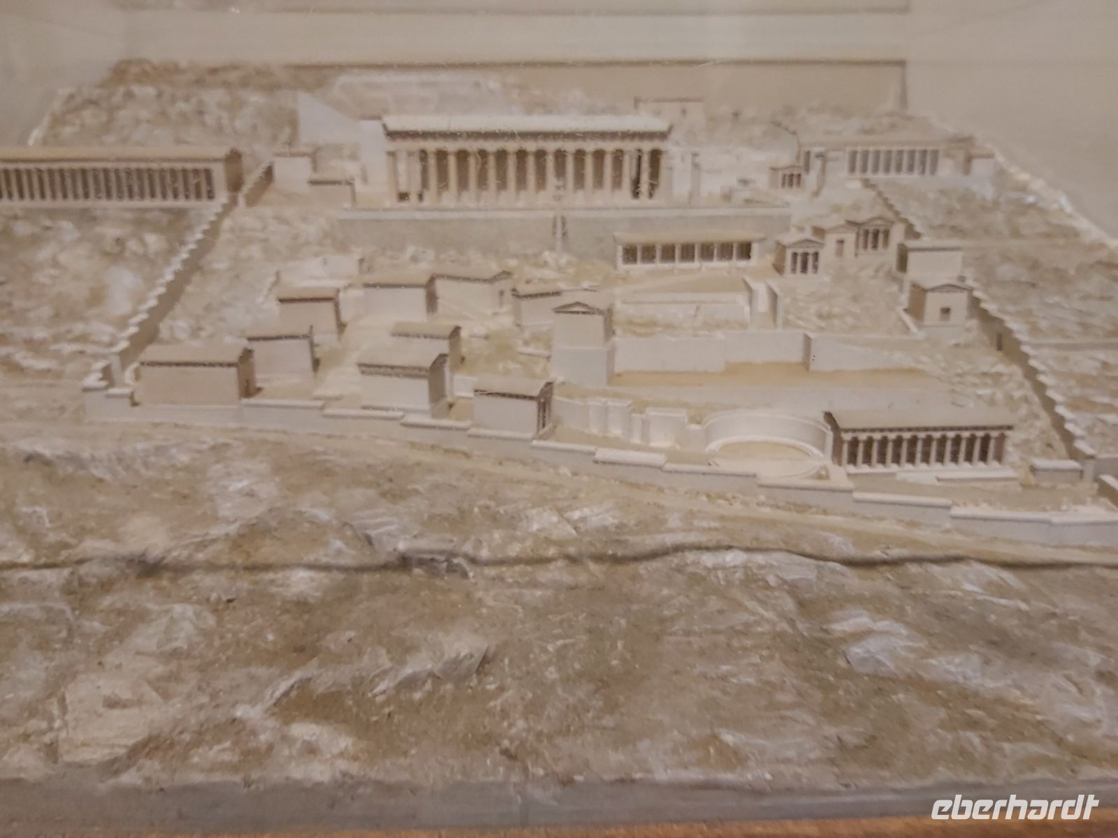 Hoffend, dass der Wind für den Aufstieg zur Akropolis im Verlaufe des Vormittages nachlässt, nahmen wir nach einer kurzen Busrundfahrt mit ausführlichen Erläuterungen zu den Sehenswürdigkeiten im Stadtzentrum spontan das Akropolismuseum zusätzlich ins Programm auf. Die Eberhardt-Reisebegleitung fand den kleinen Sonderfonds für ein Wow (Überraschung) gut angelegt. Das 2009 eröffnete Museum ist von der Außen -bzw. Innenarchitektur imposant: es steht auf tragenden Säulen über archäologischen Ausgrabungen, die über archäologische Fenster fußläufig betrachtet werden und Teil des Museums sind. Neben zahlreichen Ausgrabungstücken, wie Mensch-u. Tierskulpturen, Vasen u. Schmuck sind für die bildhafte Vorstellung der Gebäude auf der Akropolis die vier Modelle aus verschiedenen Zeitepochen hervorzuheben. Das hat sich auch für andere Tempelbesichtigungen bestätigt: Die Kombination von Besichtigung der Ausgrabungstätten mit dem dazugehörigen Museum ermöglicht die Vorstellung der Gebäude u. hinterlässt einen nachhaltigen Eindruck über die Zeitgeschichte. Die besichtigten Museen -dies an der Stelle vorweg erwähnt- sind konzeptionell sehr gut aufgebaut, sind anregend, mit einem guten Lerneffekt. Die örtliche Reiseleitung unterstreicht durch Wissen und die Wiedergabe von Überlieferungen die historischen Zusammenhänge und lässt historische Einzelpersönlichkeiten und Götter lebendig erscheinen.