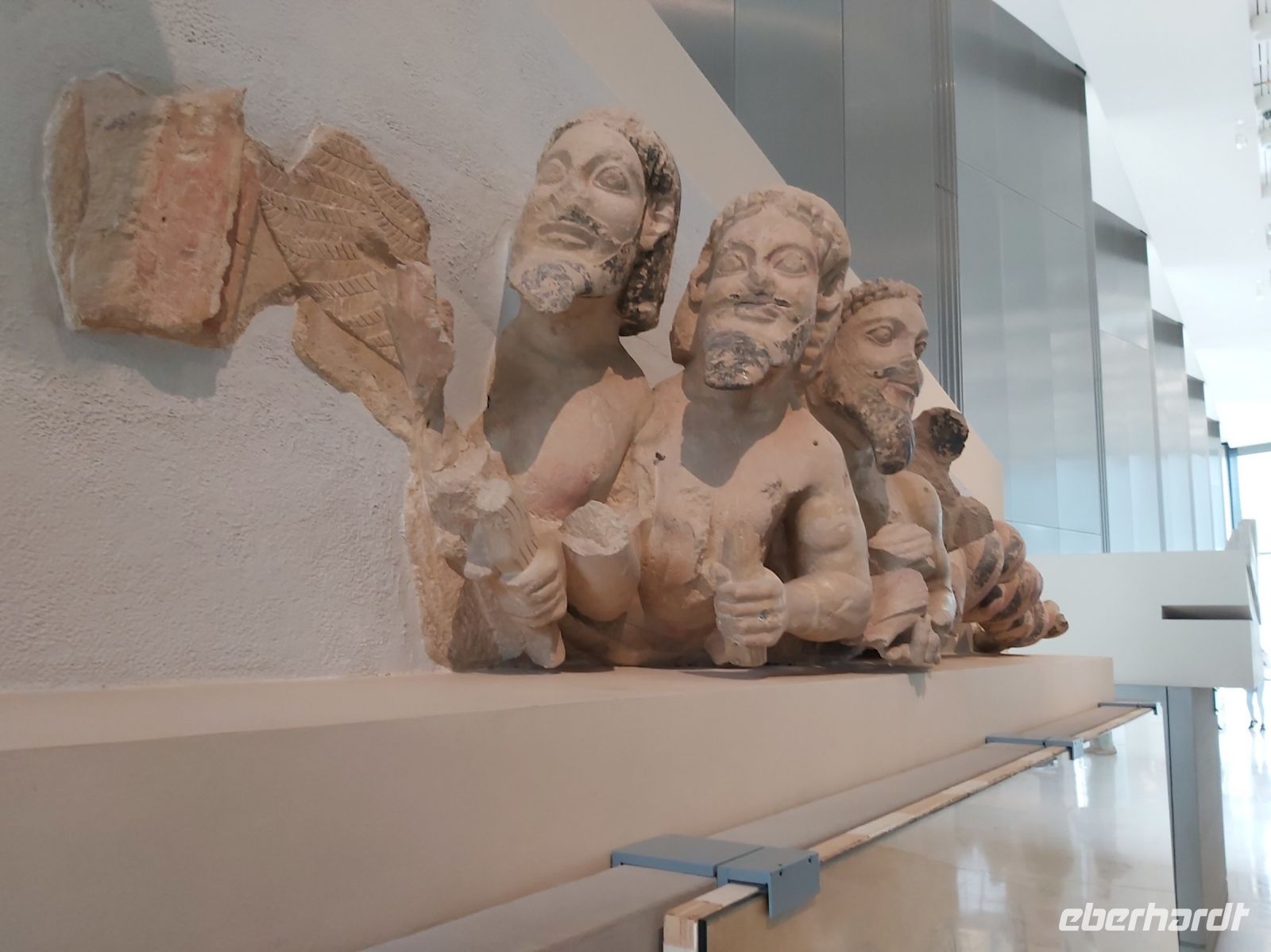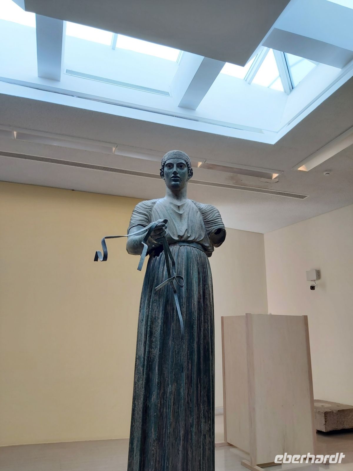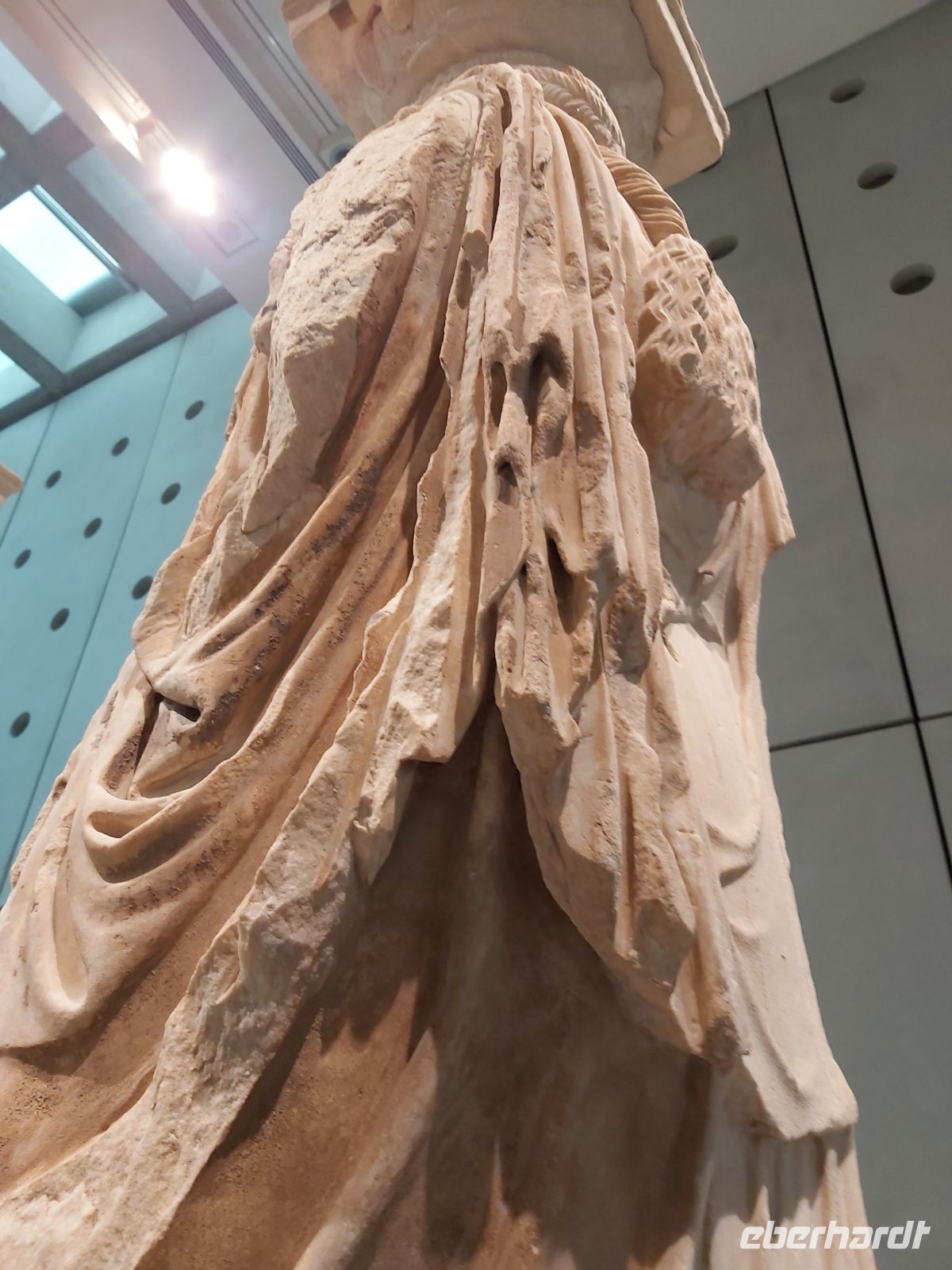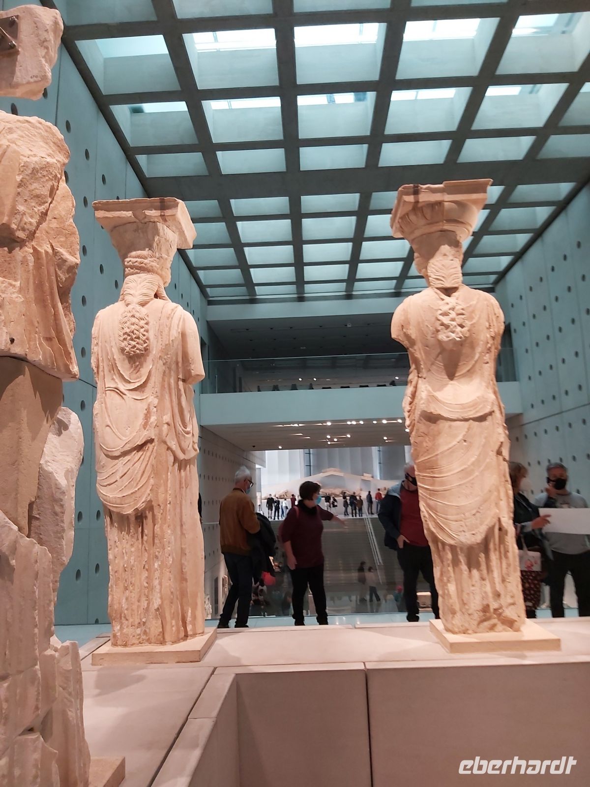 Hoffend, dass der Wind für den Aufstieg zur Akropolis im Verlaufe des Vormittages nachlässt, nahmen wir nach einer kurzen Busrundfahrt mit ausführlichen Erläuterungen zu den Sehenswürdigkeiten im Stadtzentrum spontan das Akropolismuseum zusätzlich ins Programm auf. Die Eberhardt-Reisebegleitung fand den kleinen Sonderfonds für ein Wow (Überraschung) gut angelegt. Das 2009 eröffnete Museum ist von der Außen -bzw. Innenarchitektur imposant: es steht auf tragenden Säulen über archäologischen Ausgrabungen, die über archäologische Fenster fußläufig betrachtet werden und Teil des Museums sind. Neben zahlreichen Ausgrabungstücken, wie Mensch-u. Tierskulpturen, Vasen u. Schmuck sind für die bildhafte Vorstellung der Gebäude auf der Akropolis die vier Modelle aus verschiedenen Zeitepochen hervorzuheben. Das hat sich auch für andere Tempelbesichtigungen bestätigt: Die Kombination von Besichtigung der Ausgrabungstätten mit dem dazugehörigen Museum ermöglicht die Vorstellung der Gebäude u. hinterlässt einen nachhaltigen Eindruck über die Zeitgeschichte. Die besichtigten Museen -dies an der Stelle vorweg erwähnt- sind konzeptionell sehr gut aufgebaut, sind anregend, mit einem guten Lerneffekt. Die örtliche Reiseleitung unterstreicht durch Wissen und die Wiedergabe von Überlieferungen die historischen Zusammenhänge und lässt historische Einzelpersönlichkeiten und Götter lebendig erscheinen.