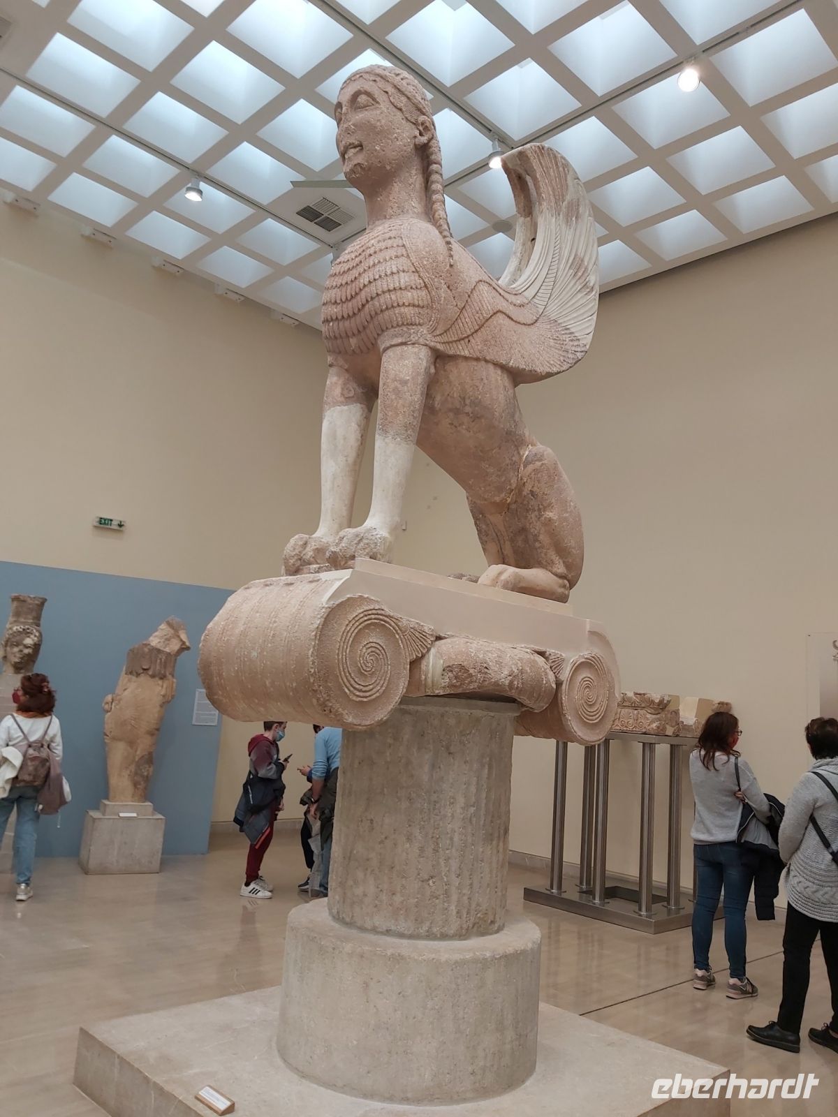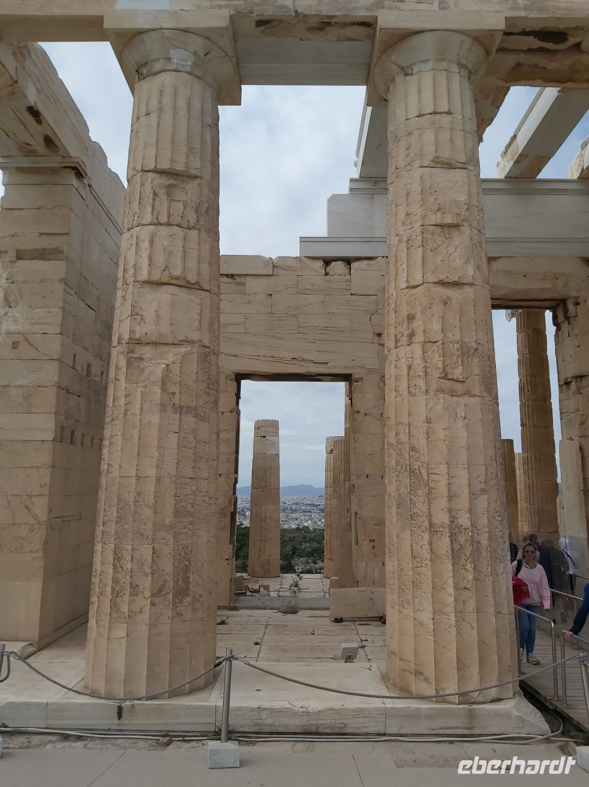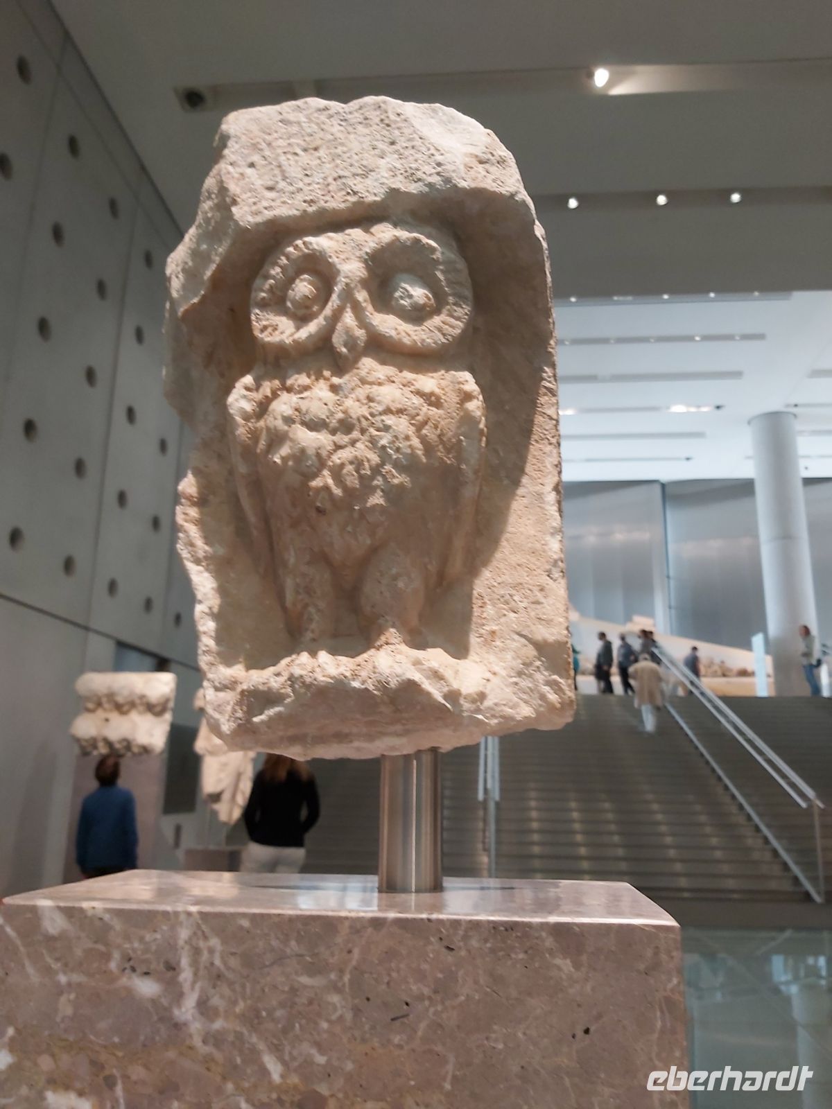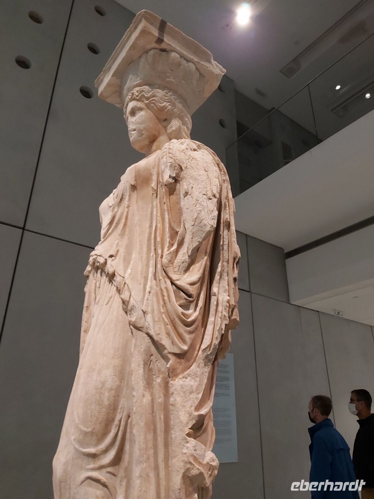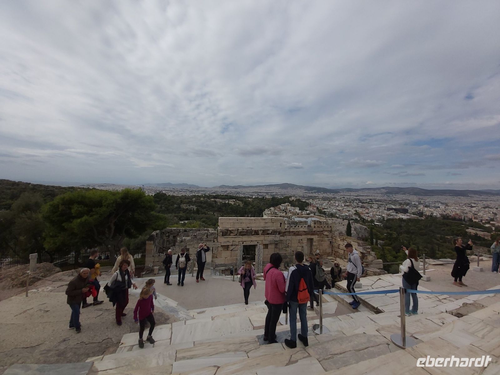 Hoffend, dass der Wind für den Aufstieg zur Akropolis im Verlaufe des Vormittages nachlässt, nahmen wir nach einer kurzen Busrundfahrt mit ausführlichen Erläuterungen zu den Sehenswürdigkeiten im Stadtzentrum spontan das Akropolismuseum zusätzlich ins Programm auf. Die Eberhardt-Reisebegleitung fand den kleinen Sonderfonds für ein Wow (Überraschung) gut angelegt. Das 2009 eröffnete Museum ist von der Außen -bzw. Innenarchitektur imposant: es steht auf tragenden Säulen über archäologischen Ausgrabungen, die über archäologische Fenster fußläufig betrachtet werden und Teil des Museums sind. Neben zahlreichen Ausgrabungstücken, wie Mensch-u. Tierskulpturen, Vasen u. Schmuck sind für die bildhafte Vorstellung der Gebäude auf der Akropolis die vier Modelle aus verschiedenen Zeitepochen hervorzuheben. Das hat sich auch für andere Tempelbesichtigungen bestätigt: Die Kombination von Besichtigung der Ausgrabungstätten mit dem dazugehörigen Museum ermöglicht die Vorstellung der Gebäude u. hinterlässt einen nachhaltigen Eindruck über die Zeitgeschichte. Die besichtigten Museen -dies an der Stelle vorweg erwähnt- sind konzeptionell sehr gut aufgebaut, sind anregend, mit einem guten Lerneffekt. Die örtliche Reiseleitung unterstreicht durch Wissen und die Wiedergabe von Überlieferungen die historischen Zusammenhänge und lässt historische Einzelpersönlichkeiten und Götter lebendig erscheinen.
