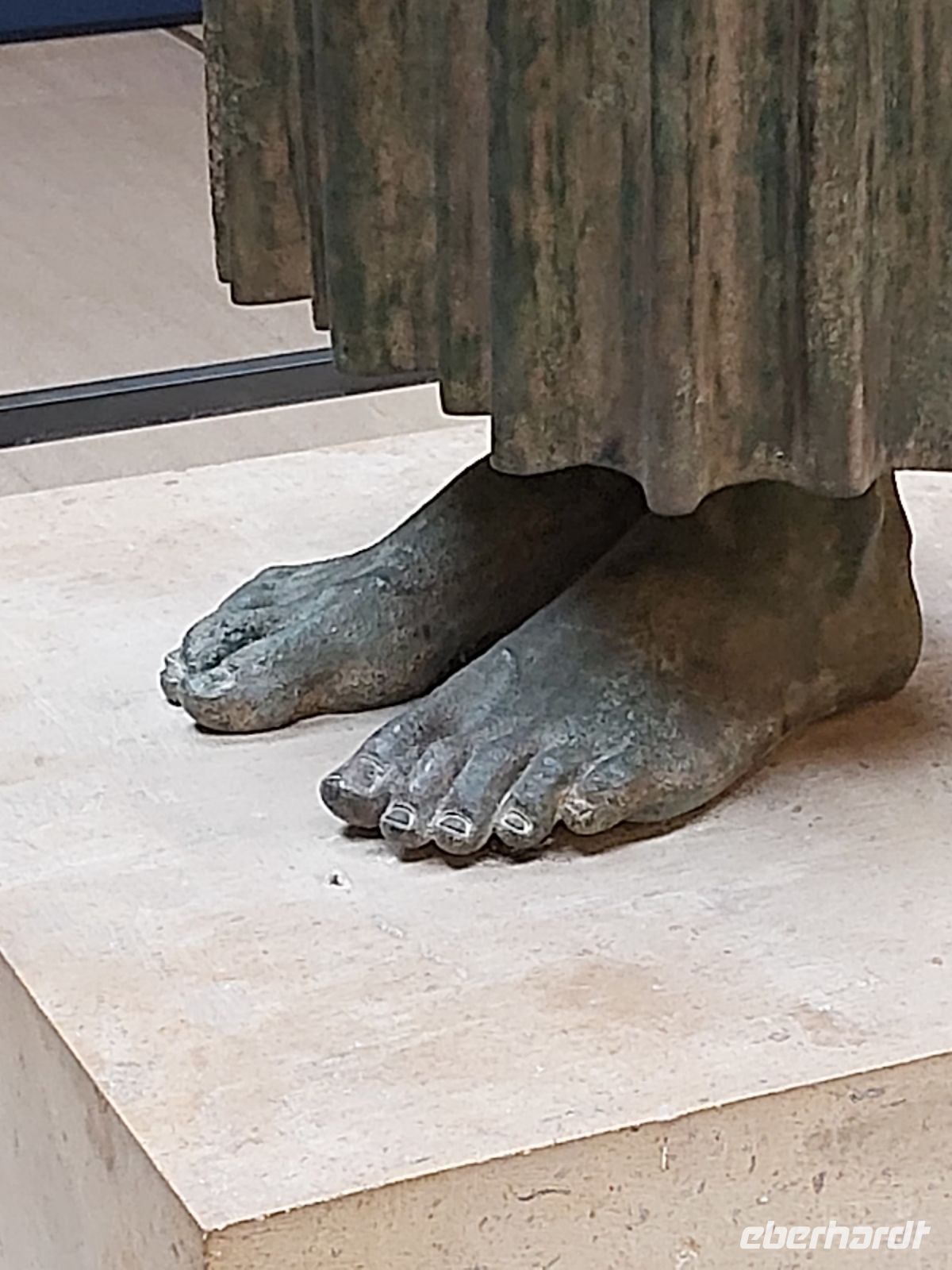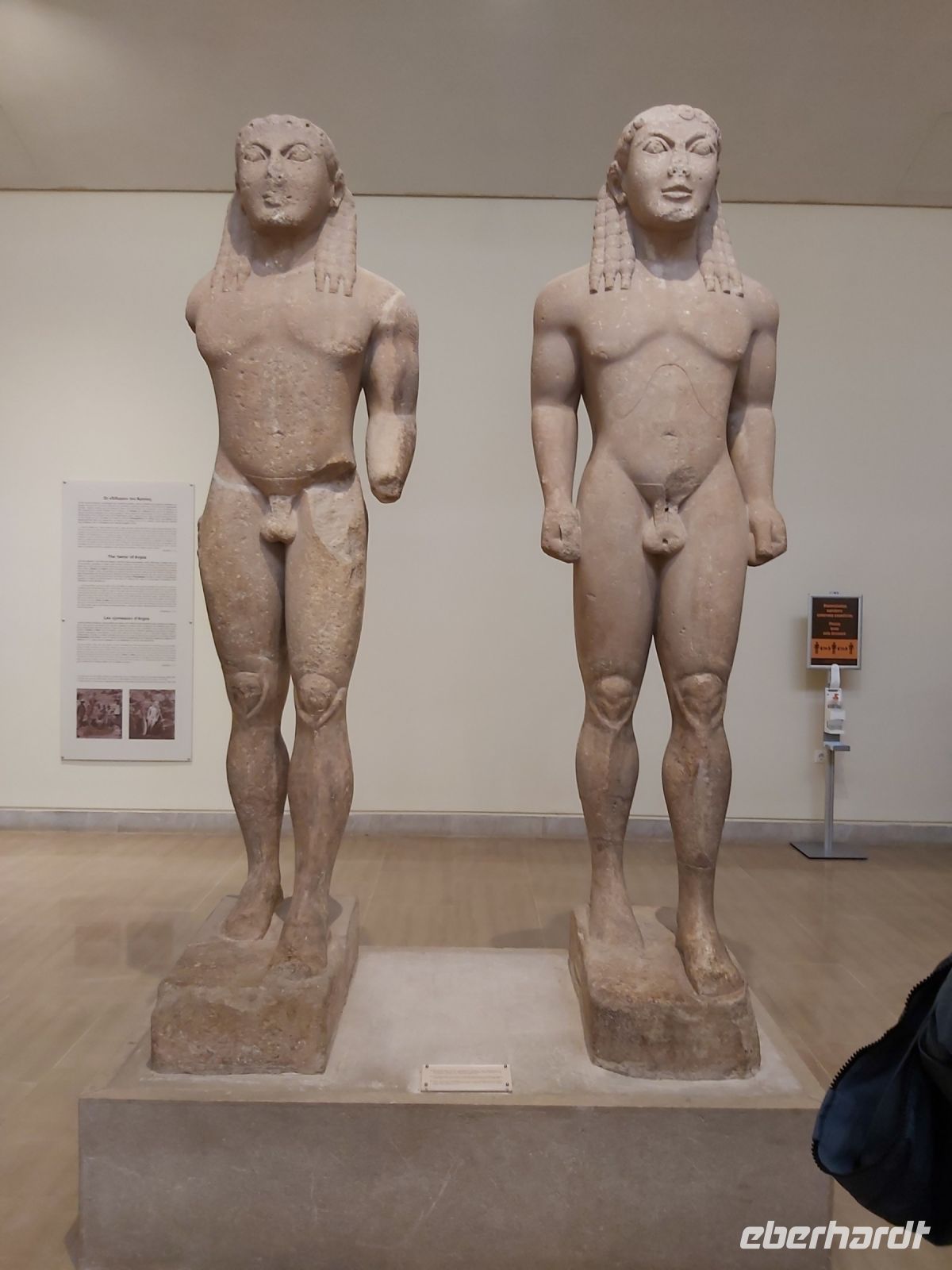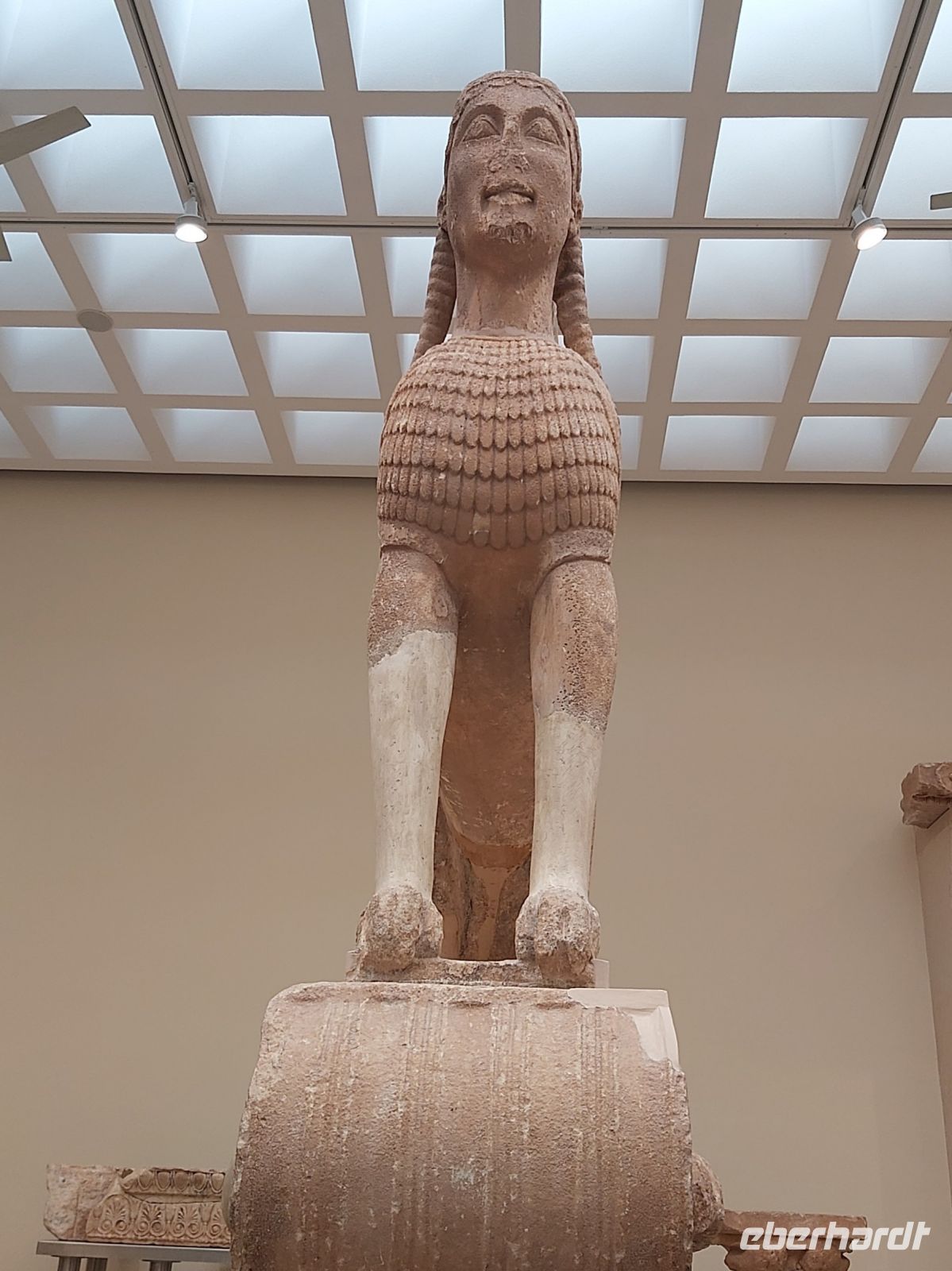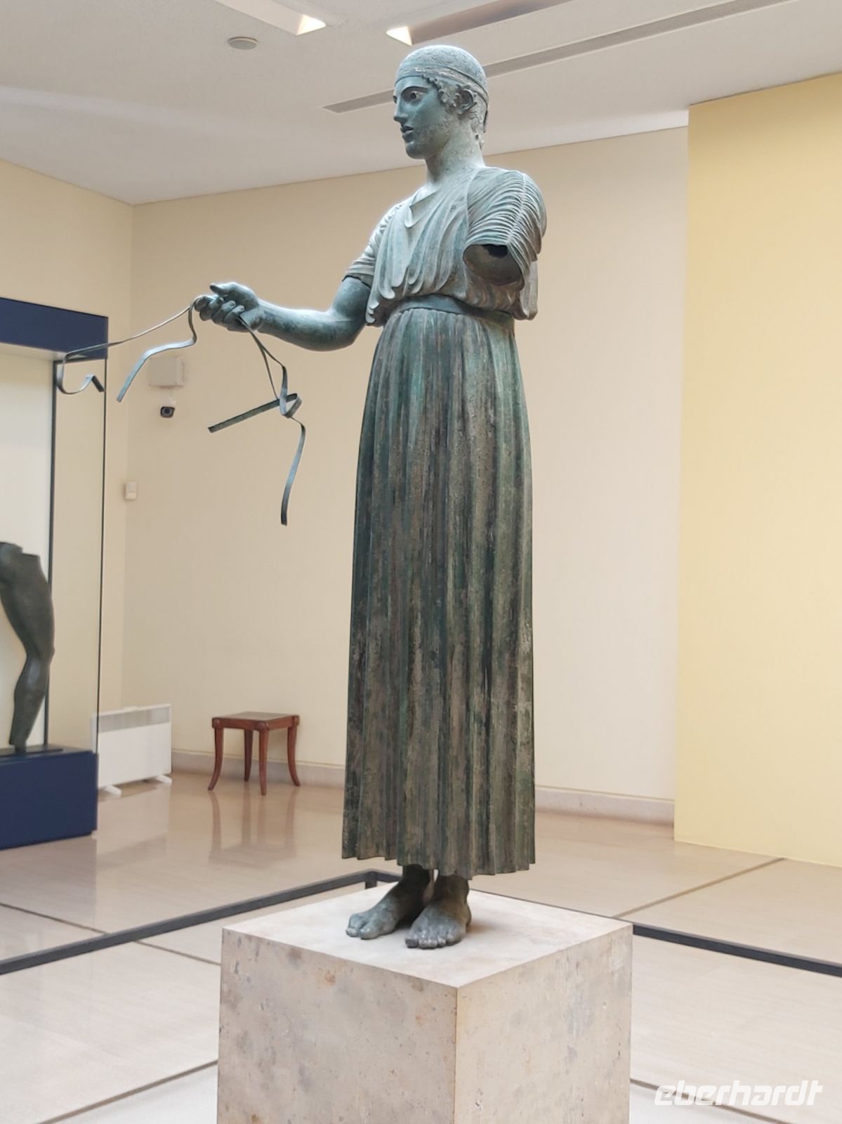 Hoffend, dass der Wind für den Aufstieg zur Akropolis im Verlaufe des Vormittages nachlässt, nahmen wir nach einer kurzen Busrundfahrt mit ausführlichen Erläuterungen zu den Sehenswürdigkeiten im Stadtzentrum spontan das Akropolismuseum zusätzlich ins Programm auf. Die Eberhardt-Reisebegleitung fand den kleinen Sonderfonds für ein Wow (Überraschung) gut angelegt. Das 2009 eröffnete Museum ist von der Außen -bzw. Innenarchitektur imposant: es steht auf tragenden Säulen über archäologischen Ausgrabungen, die über archäologische Fenster fußläufig betrachtet werden und Teil des Museums sind. Neben zahlreichen Ausgrabungstücken, wie Mensch-u. Tierskulpturen, Vasen u. Schmuck sind für die bildhafte Vorstellung der Gebäude auf der Akropolis die vier Modelle aus verschiedenen Zeitepochen hervorzuheben. Das hat sich auch für andere Tempelbesichtigungen bestätigt: Die Kombination von Besichtigung der Ausgrabungstätten mit dem dazugehörigen Museum ermöglicht die Vorstellung der Gebäude u. hinterlässt einen nachhaltigen Eindruck über die Zeitgeschichte. Die besichtigten Museen -dies an der Stelle vorweg erwähnt- sind konzeptionell sehr gut aufgebaut, sind anregend, mit einem guten Lerneffekt. Die örtliche Reiseleitung unterstreicht durch Wissen und die Wiedergabe von Überlieferungen die historischen Zusammenhänge und lässt historische Einzelpersönlichkeiten und Götter lebendig erscheinen.