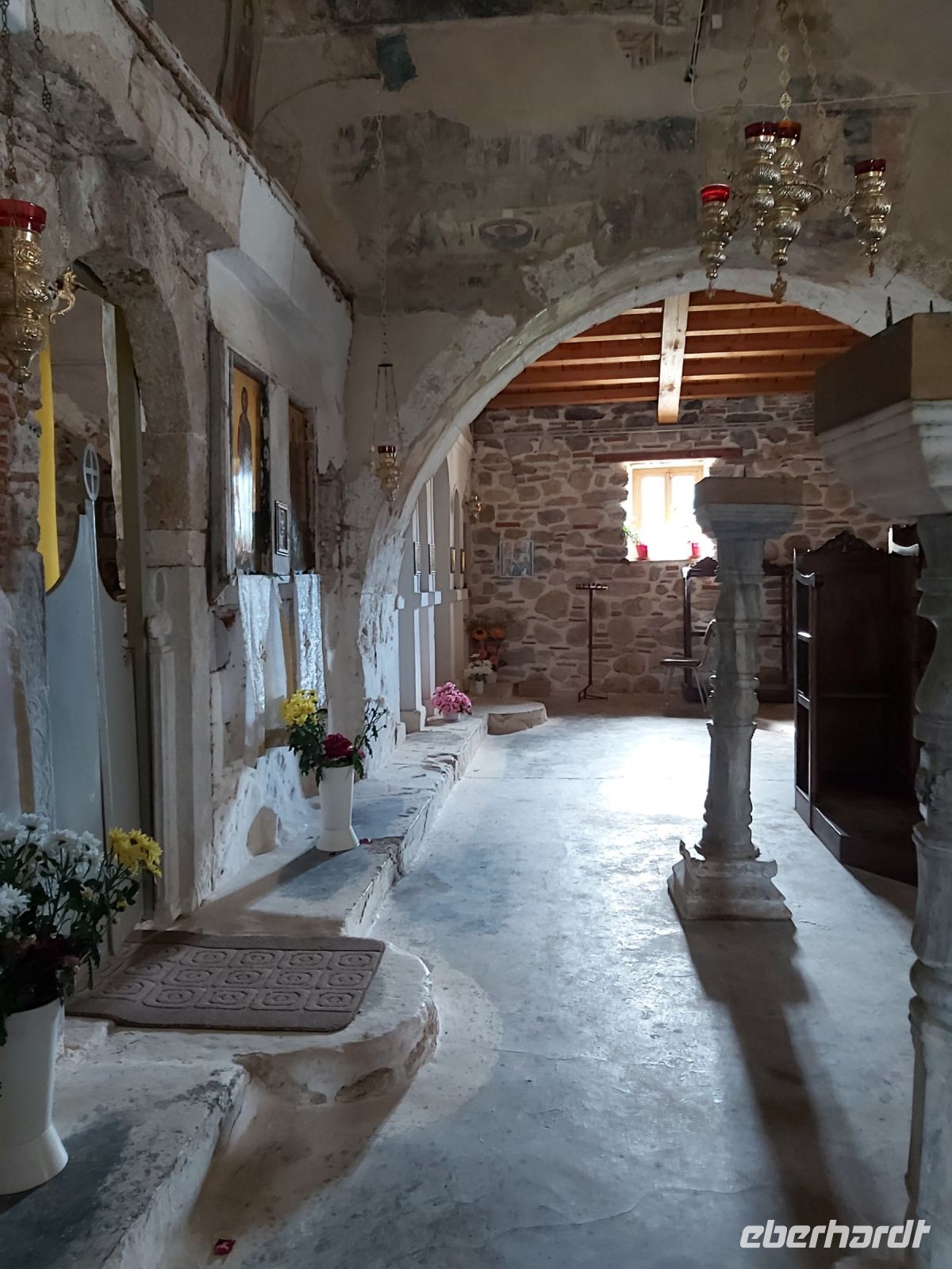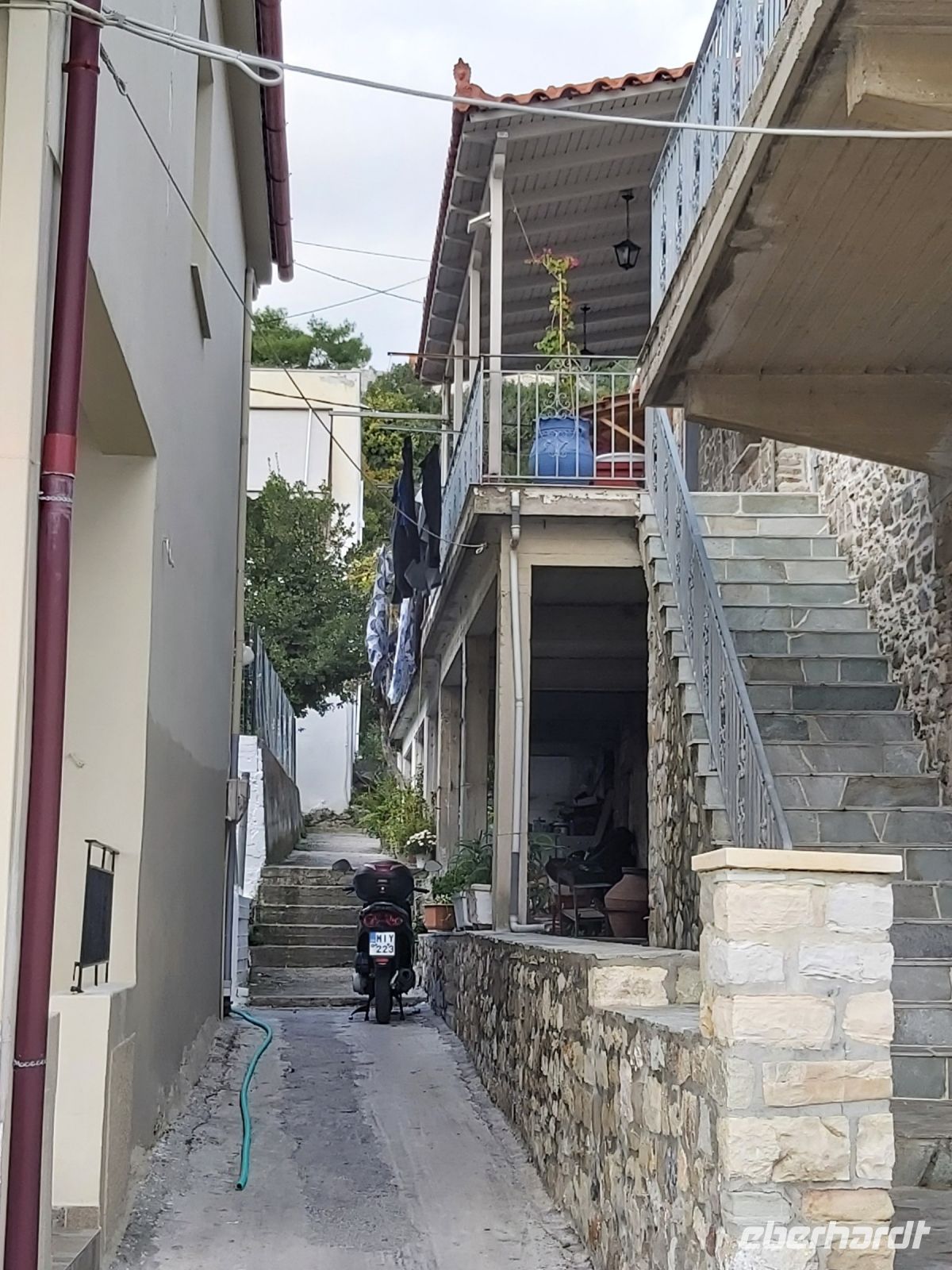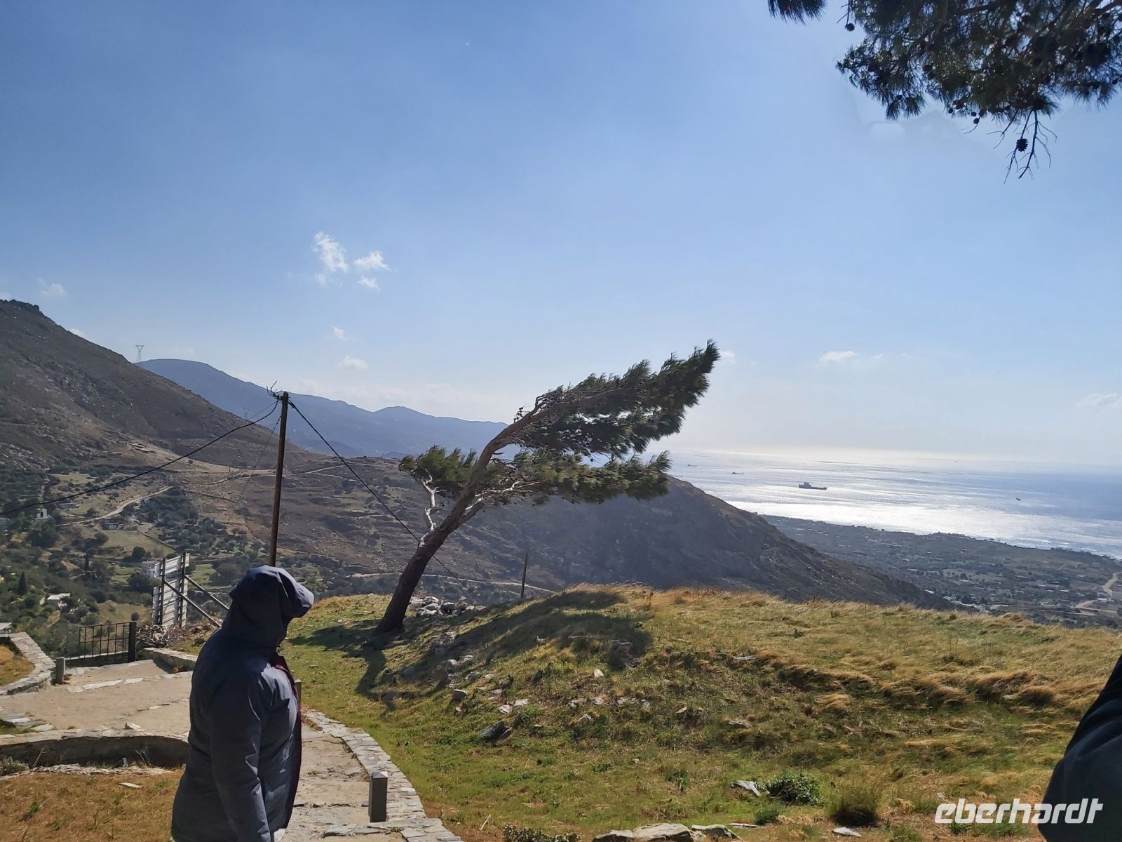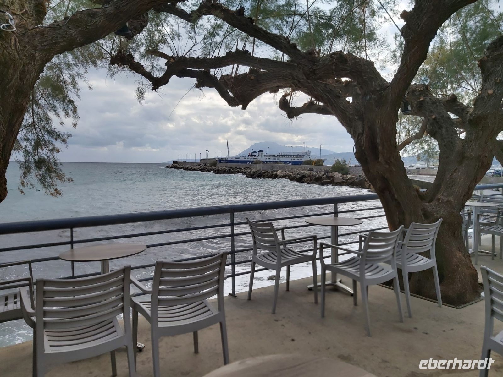 Unser nächster Halt ist der kleine Ort Avionari, Hier steht die älteste byzantinische Kirche der Insel. Den Schlüssel kann man sich in einem Laden gegenüber holen. Anastasia erklärt uns den Kirchenbau, die Deutung der verblassten Wandmalereien und die Ikonenmalerei. Anstelle einer Bestuhlung waren seitlich Stehbänke üblich zum Anlehnen. Durch kleine enge Fensteröffnungen dringt Sonnenlicht in den dunklen Raum und verleiht der Kirche eine ehrwürdige Aura. Wir sind sehr beindruckt. Genießen noch die dörfliche Atmosphäre bei einem griechischen Eis am Straßenrand. Weiter geht es zum Seefahrerort Kymi. Hier gibt es eine Seefahrtshandelsschule. Wir nutzen das Sonnenwetter für einen gemeinsamen Spaziergang bis zu den Klippen. Das schäumende Wasser bricht sich in den kleinen Strandsteinen und beim Wellenschlag schwingen die Steine und erzeugen einen zarten Ton. Es ist Zeit für unsere Mittagspause. Der Wirt deckt für uns draußen im Zelt auf der Promenade. Er führt die Taverne mit seiner Frau und seinem Bruder und lässt sich stolz vor dem Restaurant fotografieren. Geöffnet ist das ganze Jahr, 16 Jahre hat er keinen Urlaub gehabt. Im Stillen denke ich an die Gastronomie meiner Landsleute in meinem Heimatort: 3 Wochen geschlossen wegen Urlaub in den Herbstferien, dies nach einer Dauerschließung während der Coronazeit. Es geht uns doch gut!!