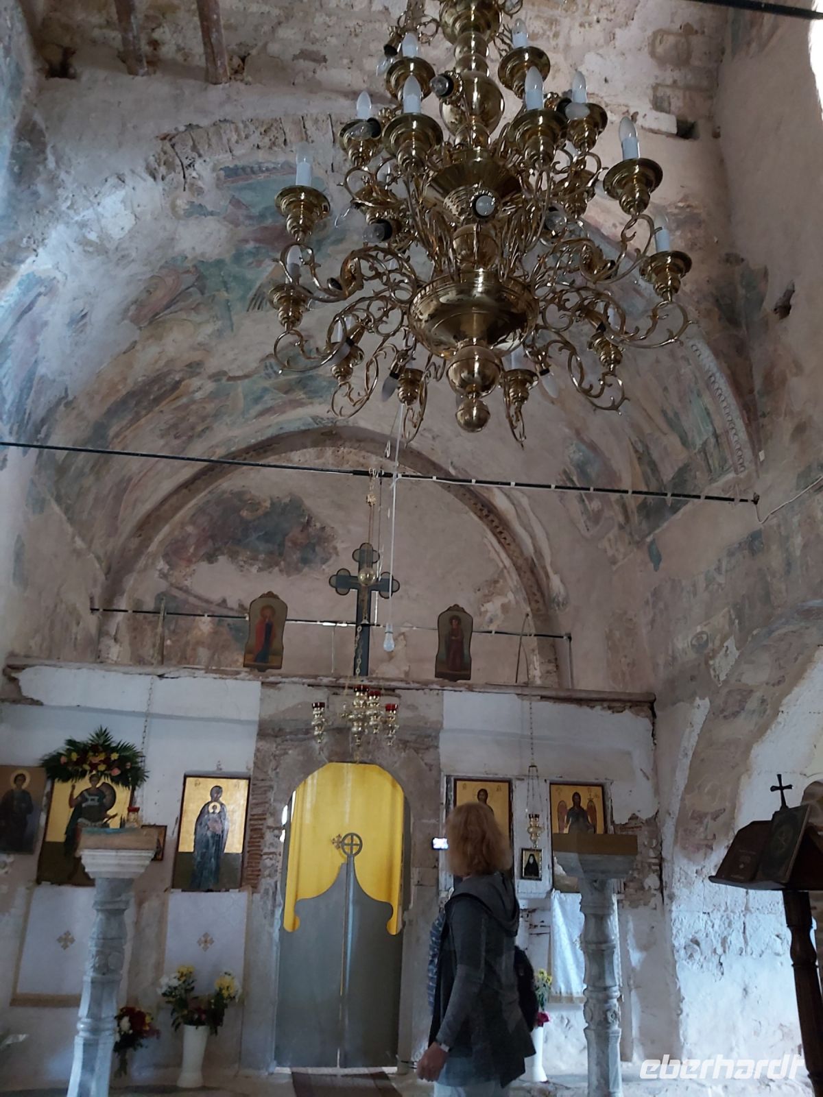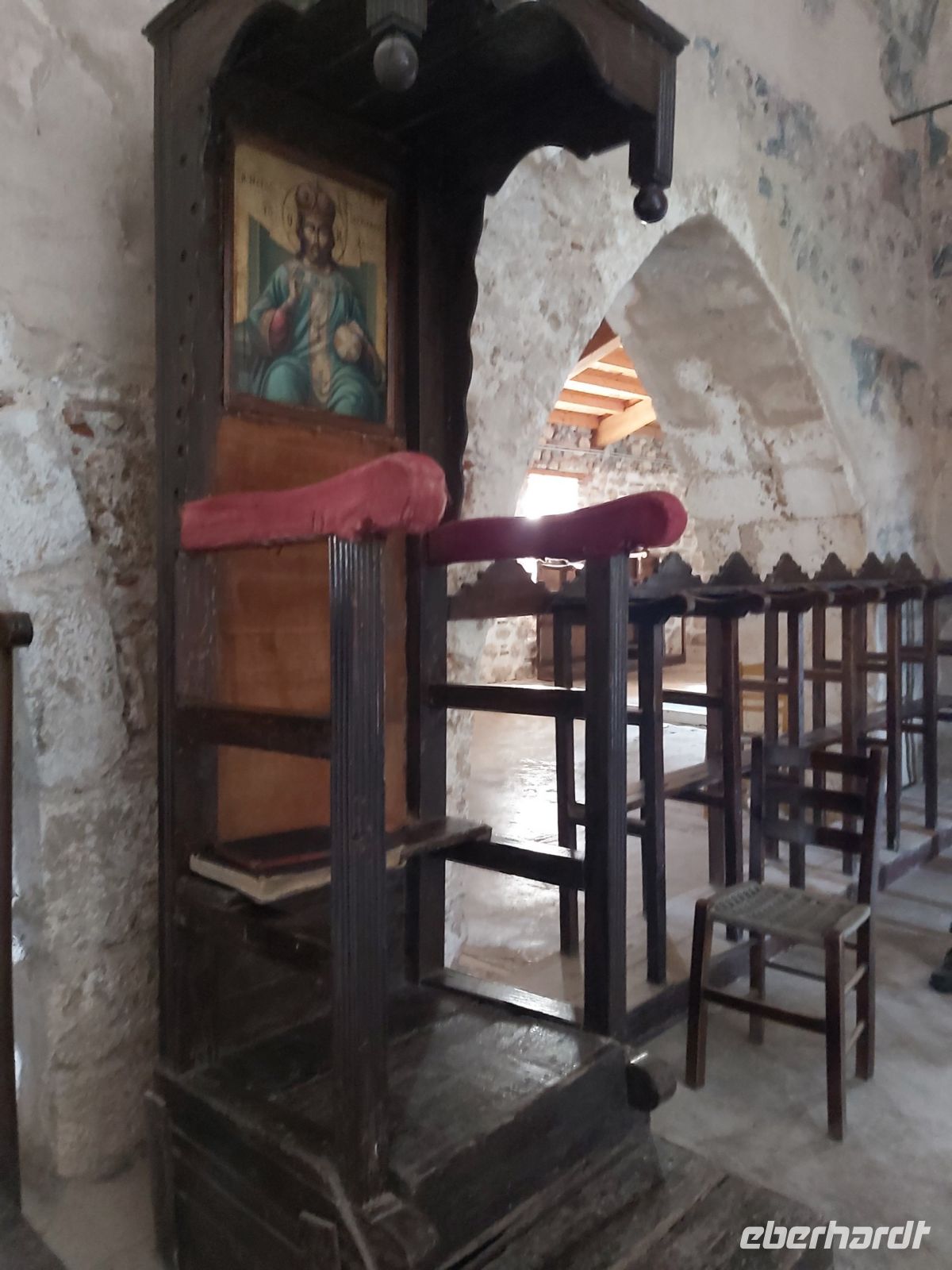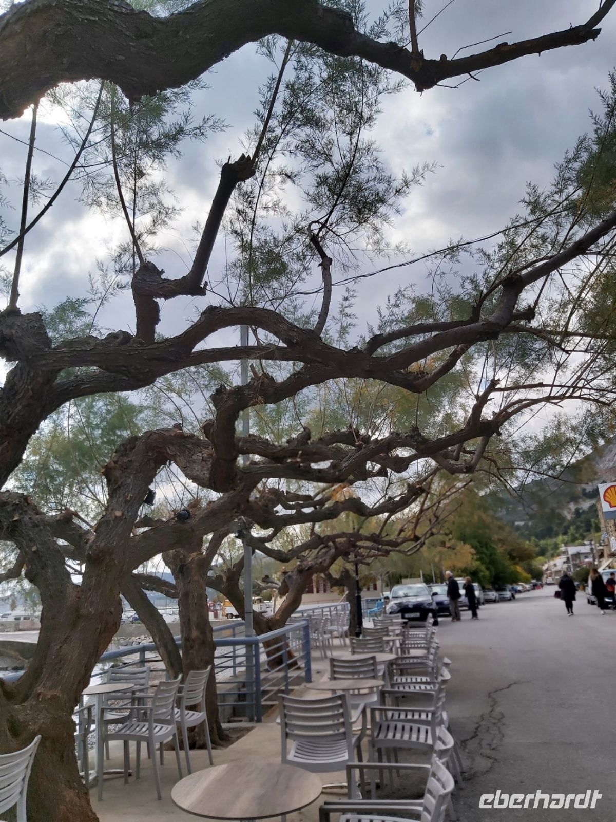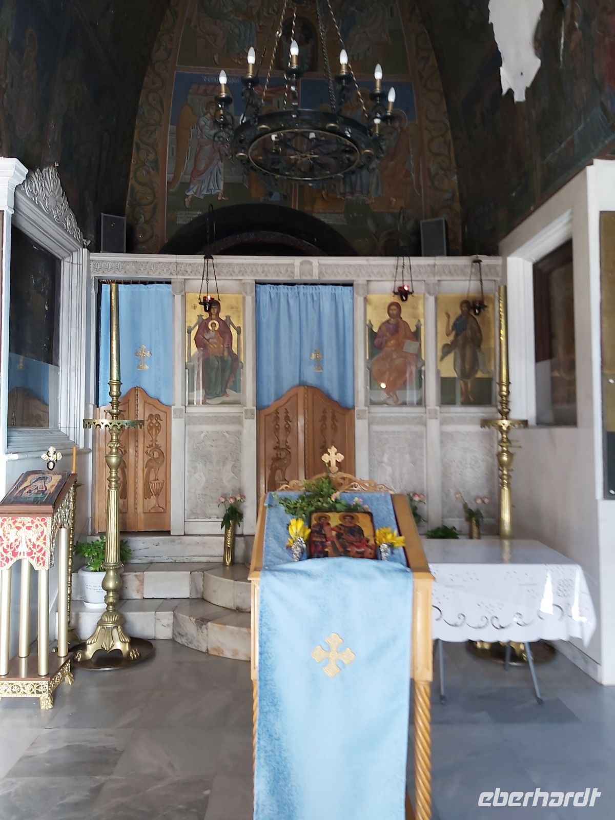 Unser nächster Halt ist der kleine Ort Avionari, Hier steht die älteste byzantinische Kirche der Insel. Den Schlüssel kann man sich in einem Laden gegenüber holen. Anastasia erklärt uns den Kirchenbau, die Deutung der verblassten Wandmalereien und die Ikonenmalerei. Anstelle einer Bestuhlung waren seitlich Stehbänke üblich zum Anlehnen. Durch kleine enge Fensteröffnungen dringt Sonnenlicht in den dunklen Raum und verleiht der Kirche eine ehrwürdige Aura. Wir sind sehr beindruckt. Genießen noch die dörfliche Atmosphäre bei einem griechischen Eis am Straßenrand. Weiter geht es zum Seefahrerort Kymi. Hier gibt es eine Seefahrtshandelsschule. Wir nutzen das Sonnenwetter für einen gemeinsamen Spaziergang bis zu den Klippen. Das schäumende Wasser bricht sich in den kleinen Strandsteinen und beim Wellenschlag schwingen die Steine und erzeugen einen zarten Ton. Es ist Zeit für unsere Mittagspause. Der Wirt deckt für uns draußen im Zelt auf der Promenade. Er führt die Taverne mit seiner Frau und seinem Bruder und lässt sich stolz vor dem Restaurant fotografieren. Geöffnet ist das ganze Jahr, 16 Jahre hat er keinen Urlaub gehabt. Im Stillen denke ich an die Gastronomie meiner Landsleute in meinem Heimatort: 3 Wochen geschlossen wegen Urlaub in den Herbstferien, dies nach einer Dauerschließung während der Coronazeit. Es geht uns doch gut!!