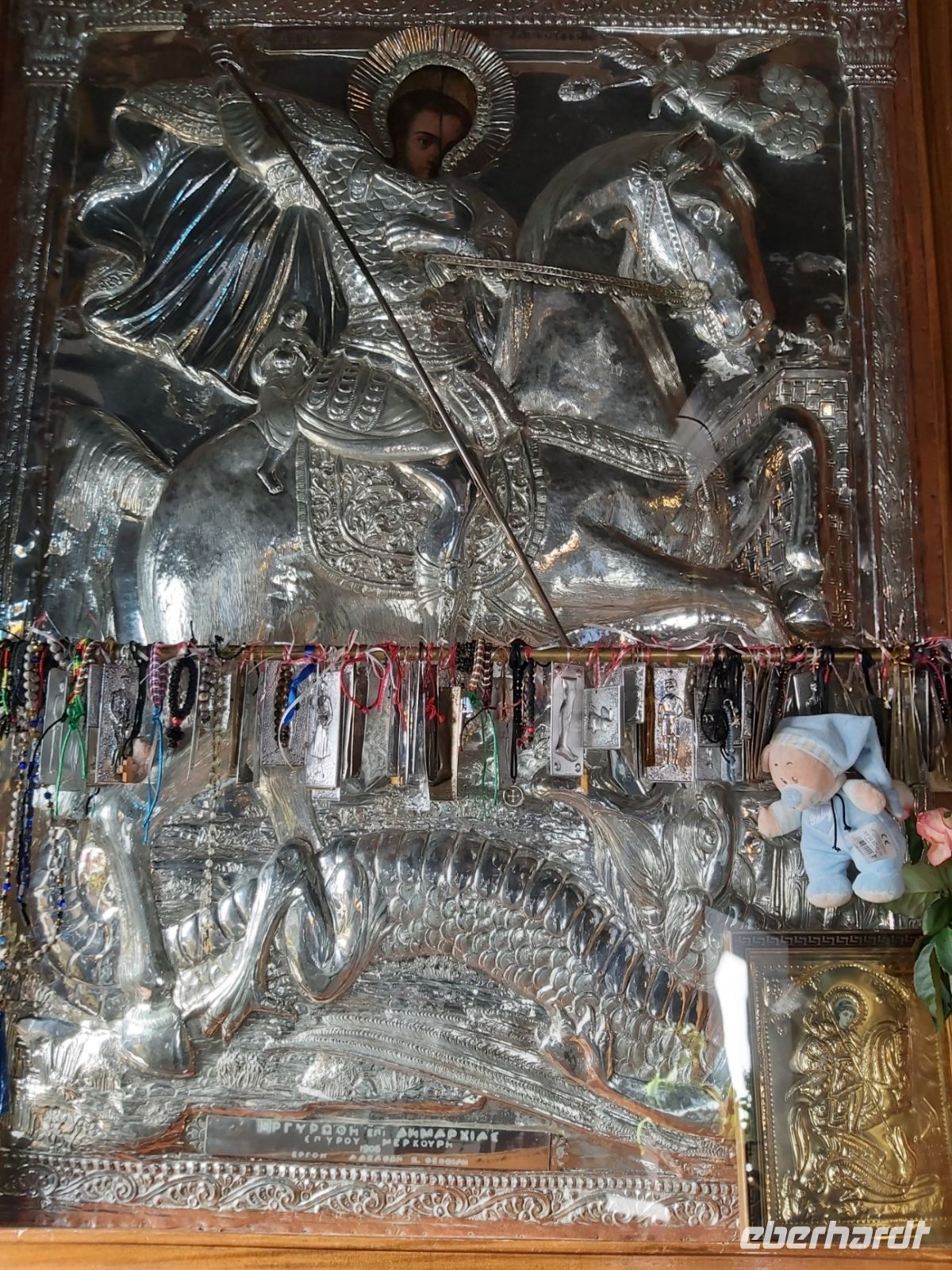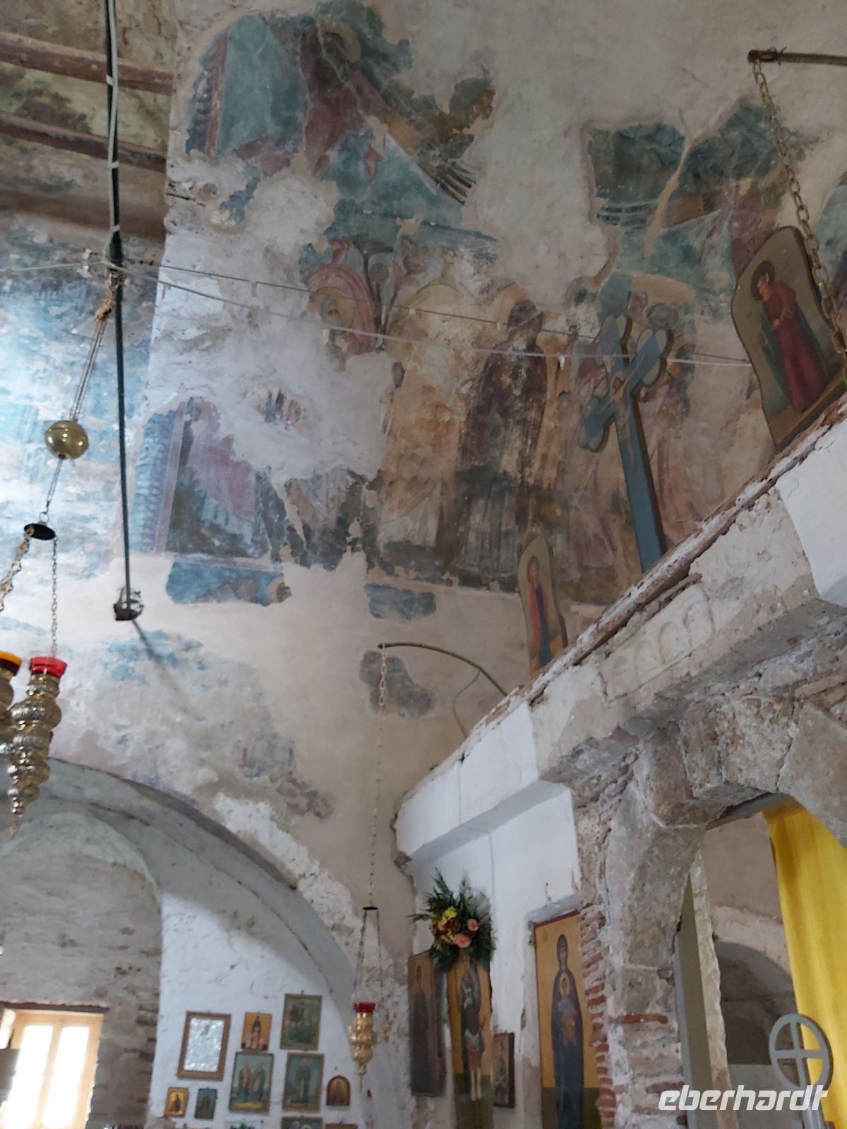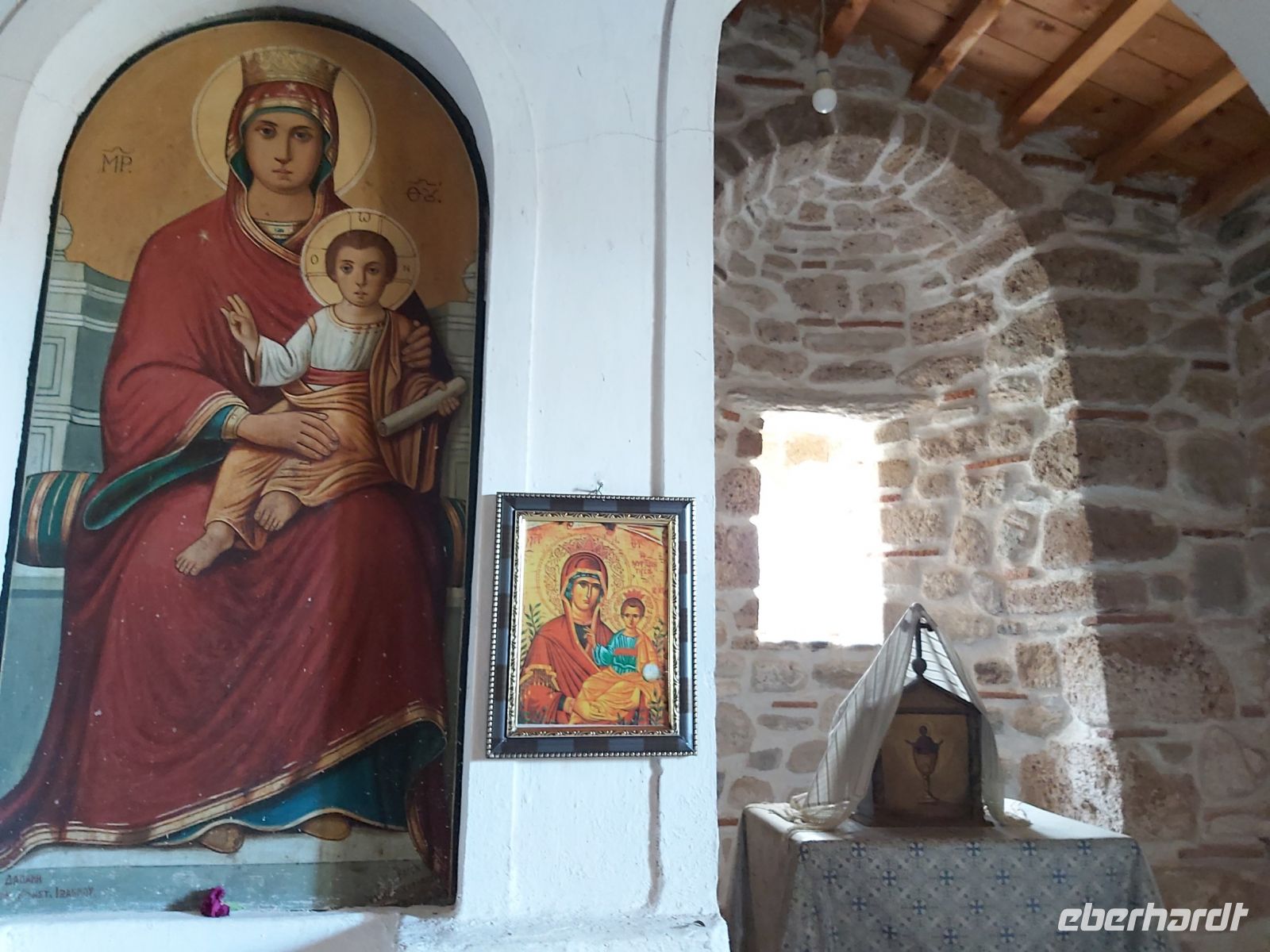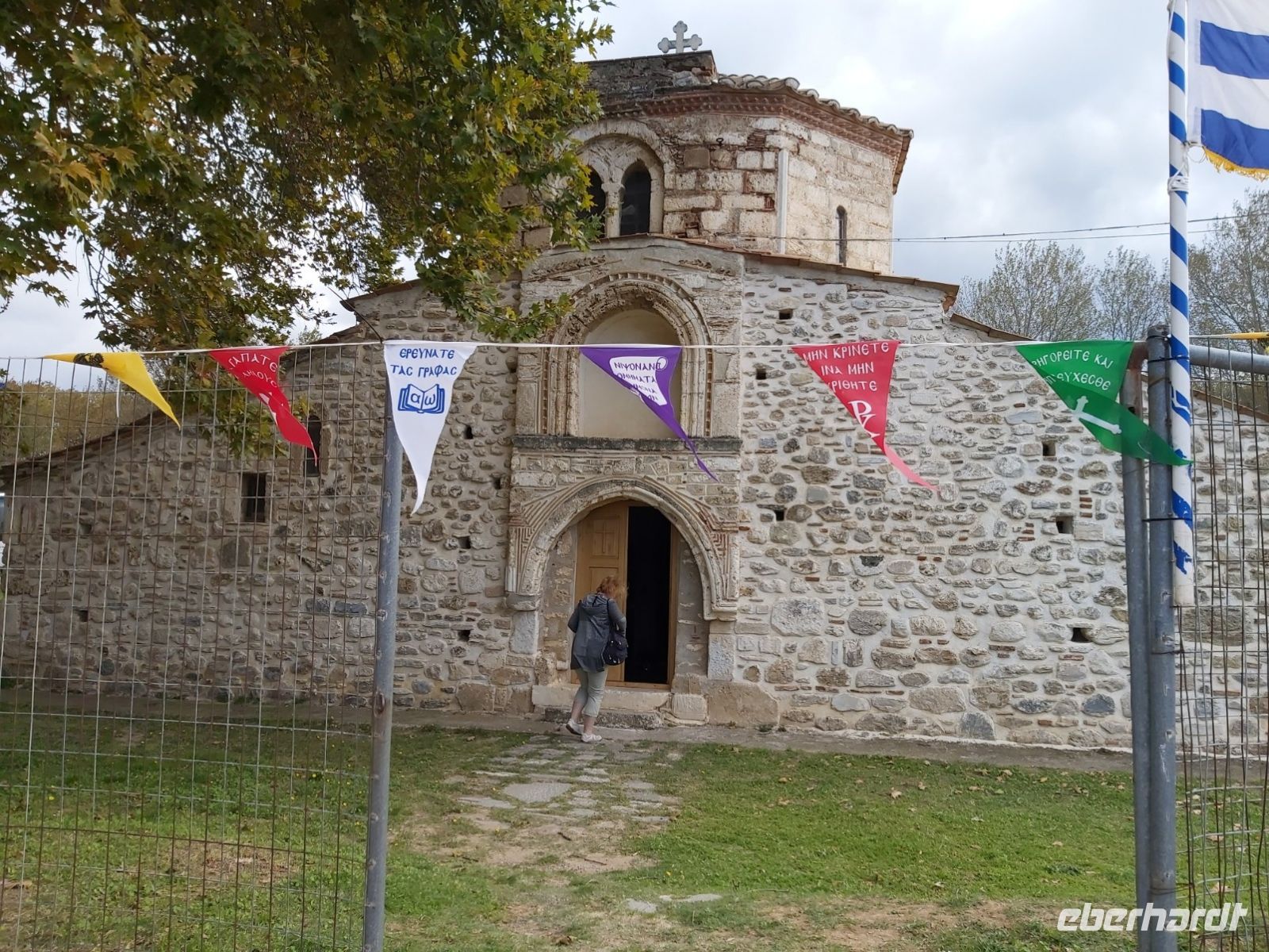Unser nächster Halt ist der kleine Ort Avionari, Hier steht die älteste byzantinische Kirche der Insel. Den Schlüssel kann man sich in einem Laden gegenüber holen. Anastasia erklärt uns den Kirchenbau, die Deutung der verblassten Wandmalereien und die Ikonenmalerei. Anstelle einer Bestuhlung waren seitlich Stehbänke üblich zum Anlehnen. Durch kleine enge Fensteröffnungen dringt Sonnenlicht in den dunklen Raum und verleiht der Kirche eine ehrwürdige Aura. Wir sind sehr beindruckt. Genießen noch die dörfliche Atmosphäre bei einem griechischen Eis am Straßenrand. Weiter geht es zum Seefahrerort Kymi. Hier gibt es eine Seefahrtshandelsschule. Wir nutzen das Sonnenwetter für einen gemeinsamen Spaziergang bis zu den Klippen. Das schäumende Wasser bricht sich in den kleinen Strandsteinen und beim Wellenschlag schwingen die Steine und erzeugen einen zarten Ton. Es ist Zeit für unsere Mittagspause. Der Wirt deckt für uns draußen im Zelt auf der Promenade. Er führt die Taverne mit seiner Frau und seinem Bruder und lässt sich stolz vor dem Restaurant fotografieren. Geöffnet ist das ganze Jahr, 16 Jahre hat er keinen Urlaub gehabt. Im Stillen denke ich an die Gastronomie meiner Landsleute in meinem Heimatort: 3 Wochen geschlossen wegen Urlaub in den Herbstferien, dies nach einer Dauerschließung während der Coronazeit. Es geht uns doch gut!!