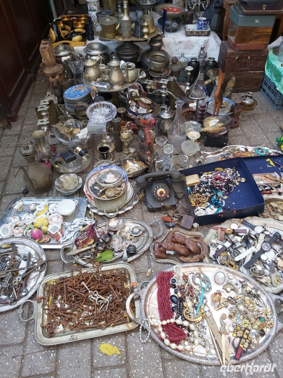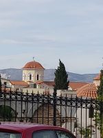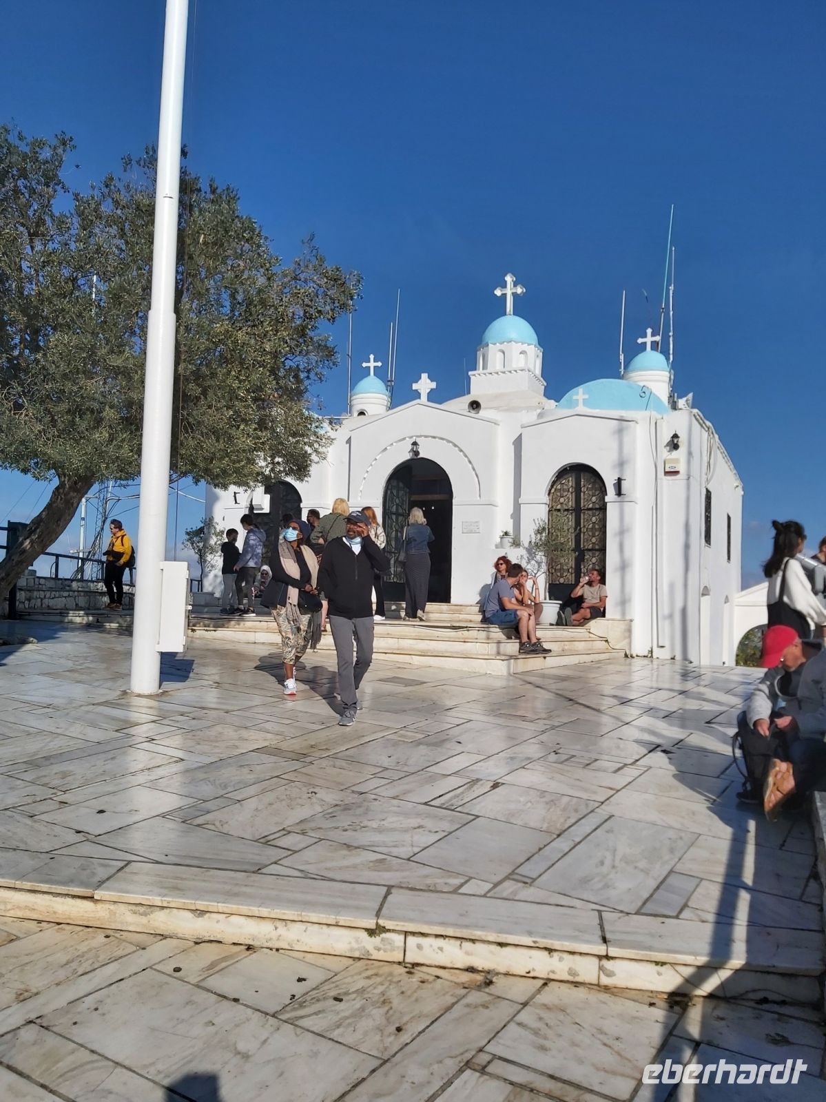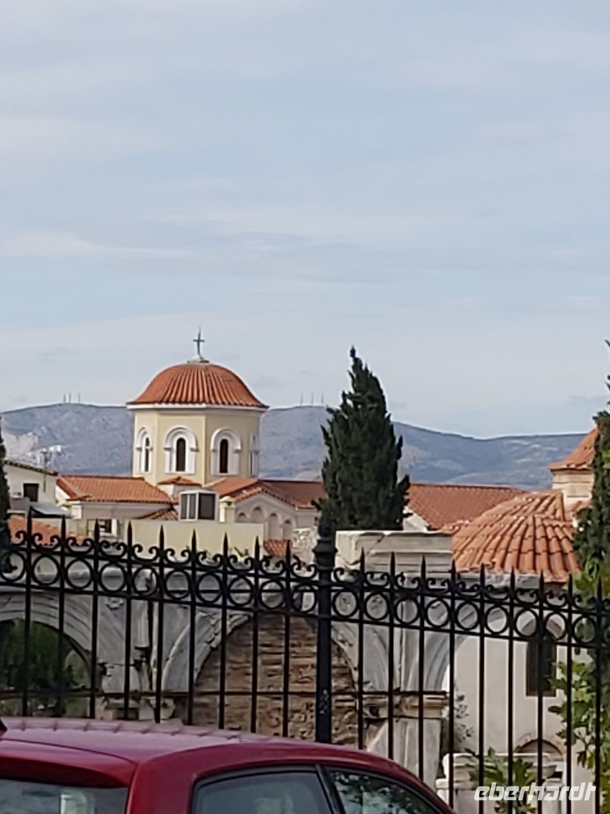 Nach unserer Bildung haben wir uns eine Mittagspause verdient bevor wir die heute geführte Erkundung mit dem Flohmarkt beschließen. Kein Gedränge an den Ständen: wir haben Zeit die Fülle der Auslagen zu bestaunen, niemand will uns etwas aufdrängen, sehr angenehm. Dann begeben wir uns in die Freizeit: Gruppe 1 schließt sich zu fünft zusammen in Richtung Lykabettushügel mit der U-Bahn. Gruppe 2 schlendert noch einmal durch die Geschäfte und nimmt mit der Reisebegleiterin ein Taxi bis zur Seilbahn. Auf dem Hügel erwartet uns eine phantastische Sicht bei Sonnenschein. Wir sehen die Akropolis und in der Ferne das Meer. sowie die gebirgige Landschaft, die Athen umgibt. Wir besichtigen die kleine Kirche. Doch wo ist Gruppe 1 geblieben, die vor uns das Bergziel vor Augen hatte? Sie hat den Weg zur Seilbahn nicht gefunden, war auch nicht ausgeschildert an der U-Bahn. Daher ist die Gruppe "bergsteigerisch" aktiv gewesen und hat den sanften Berghügel erklommen, unterwegs gestärkt bei einem Glas Wein in einer Taverne. Wir haben die Gruppe auf der Spitze begrüßt und sind gemeinsam mit der Seilbahn zurückgekehrt.