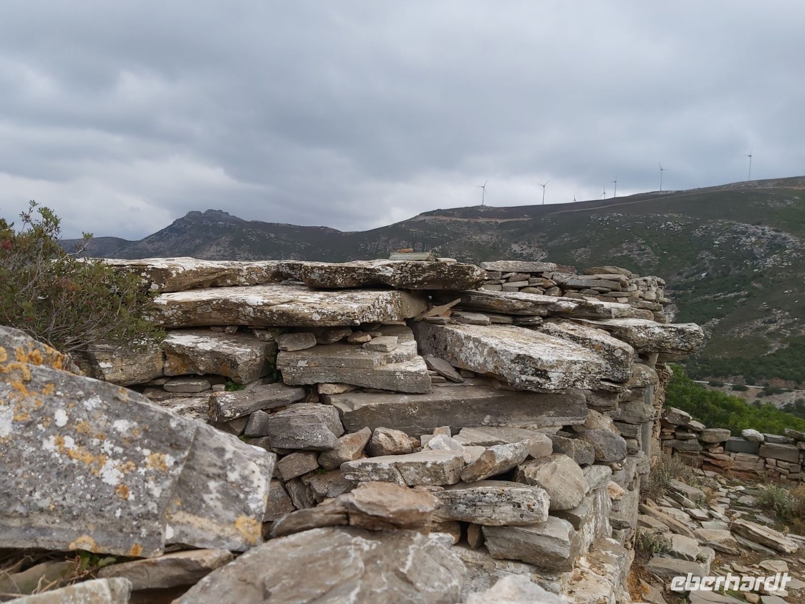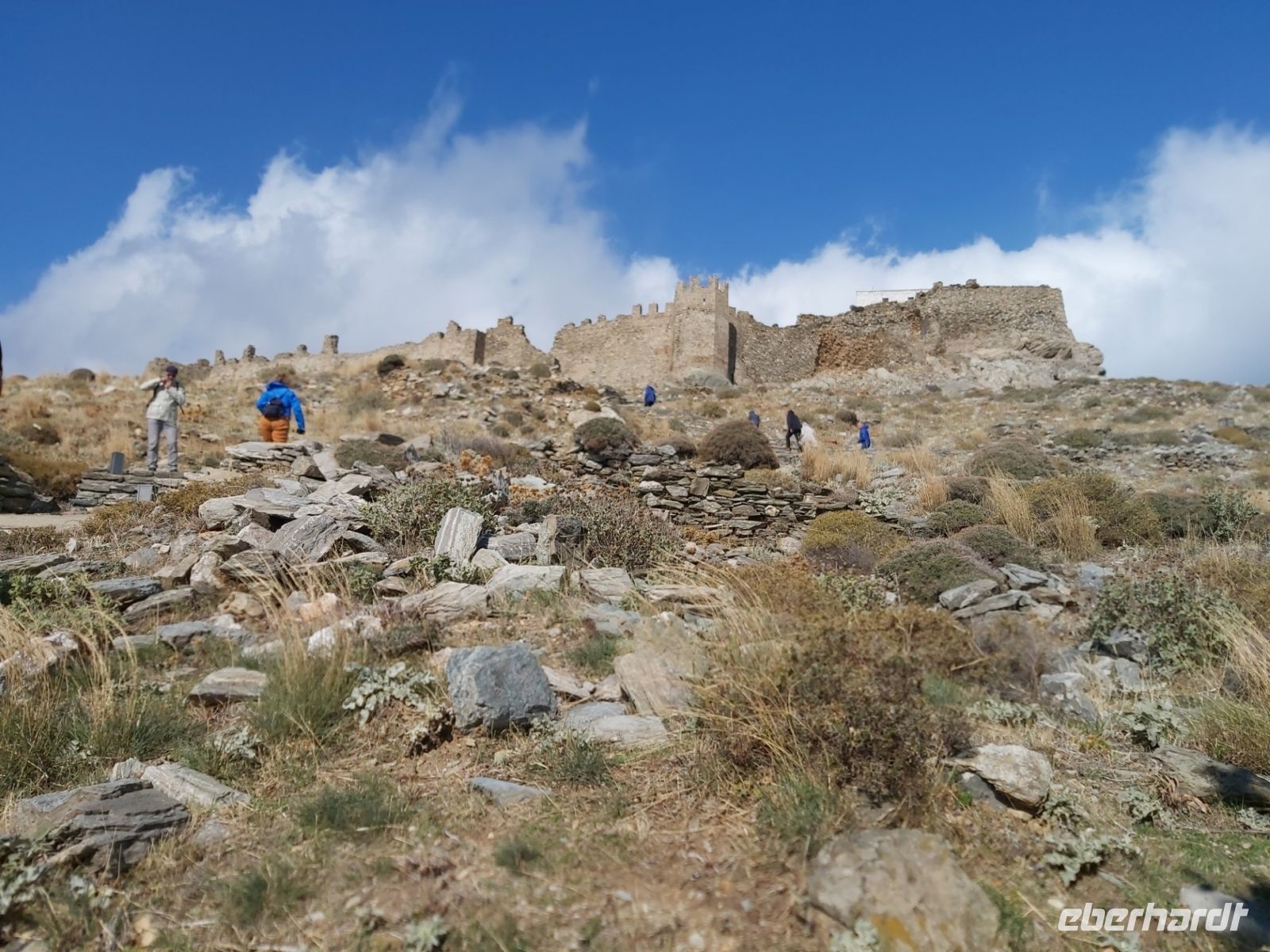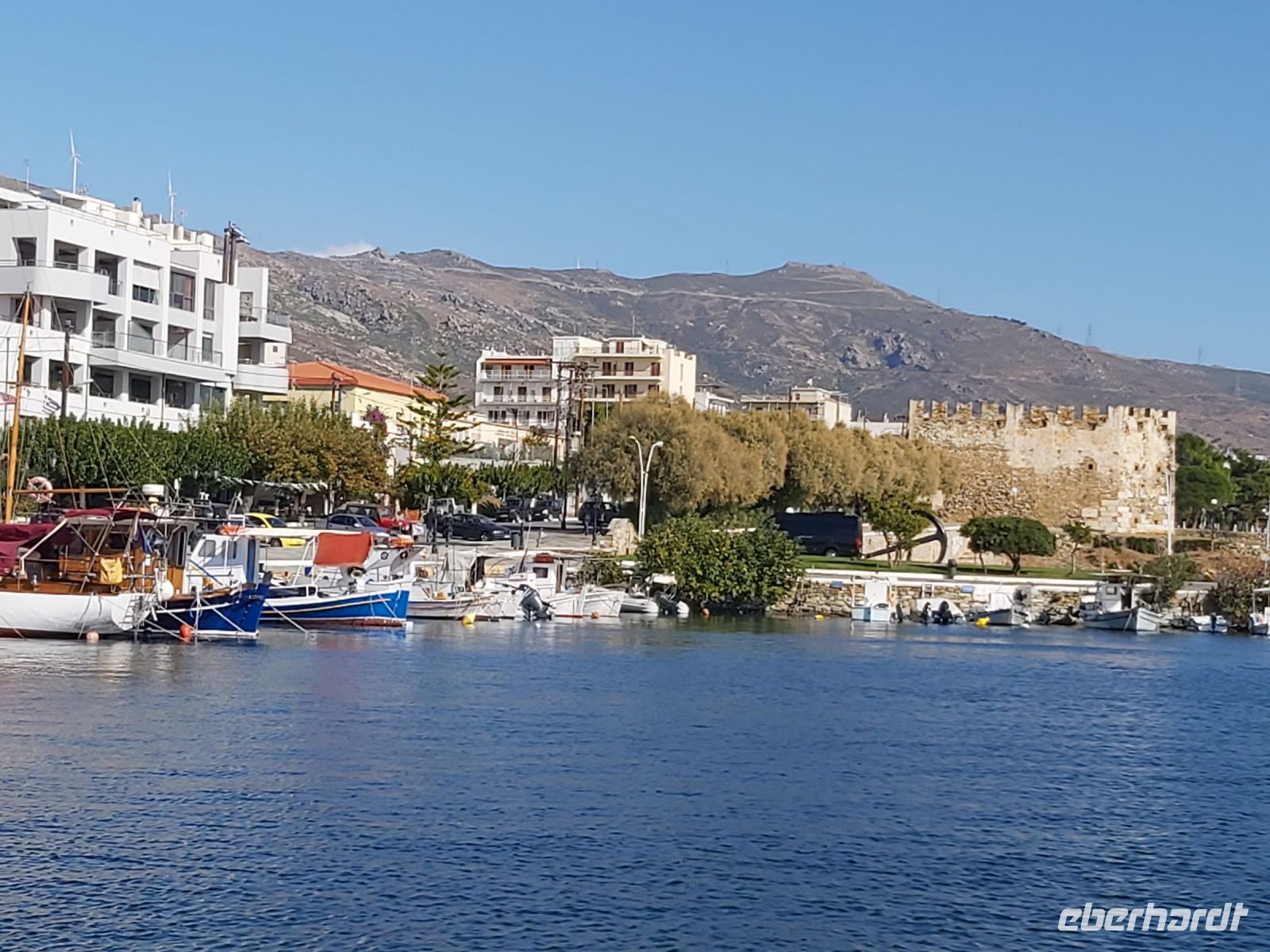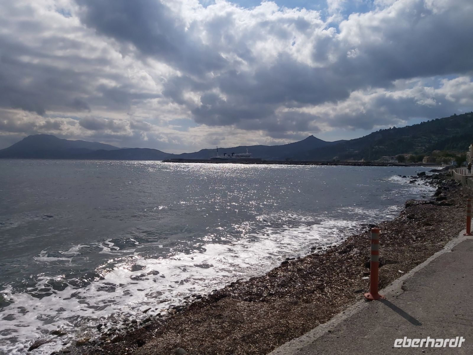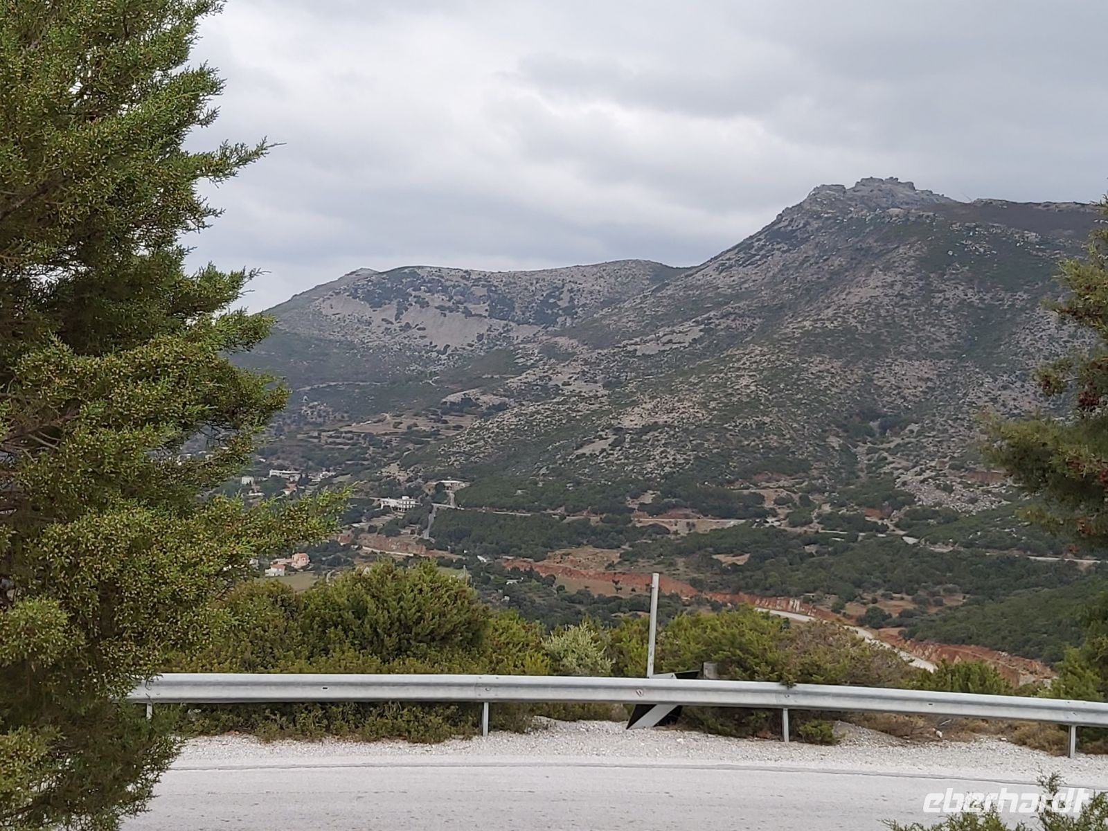Während der Fährüberfahrt nach Euböa spiegelt sich das Sonnenlicht im Meer und Möwen begleiten uns. 45 Minuten windiges Meeresrauschen lassen uns noch einmal den Sommer spüren. Wir sind gespannt auf die Insel und erkunden am heutigen Tag die südliche Hälfte bis Karystos. Unterwegs halten wir an rätselhaften Steinstrukturen, die als Drachenhäuser bekannt sind. Vermutlich dienten sie als Unterbringung von Arbeitern, die den grünen Marmor abgebaut haben. Unser nächster Halt ist in den Ausläufern des Ochi Gebirges beim Castello Rosso. Ein schmaler, holpriger Weg erlaubt unserem Minibus die Vorfahrt bis zum Tor. Wir sind die einzigen Besucher und folgen dem Weg bis hinauf zur Burganlage. Die Burg wurde 1209-1216 errichtet und wechselte Besitzer und Herrscher im Verlaufe der Jahrhunderte. Von hier aus waren Eroberer, die über das Meer kamen, gut einzusehen. Wir haben uns eine gute Sicht in sehr stürmische Höhenlage erkämpft.