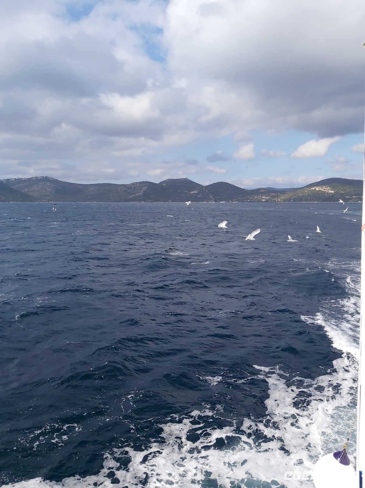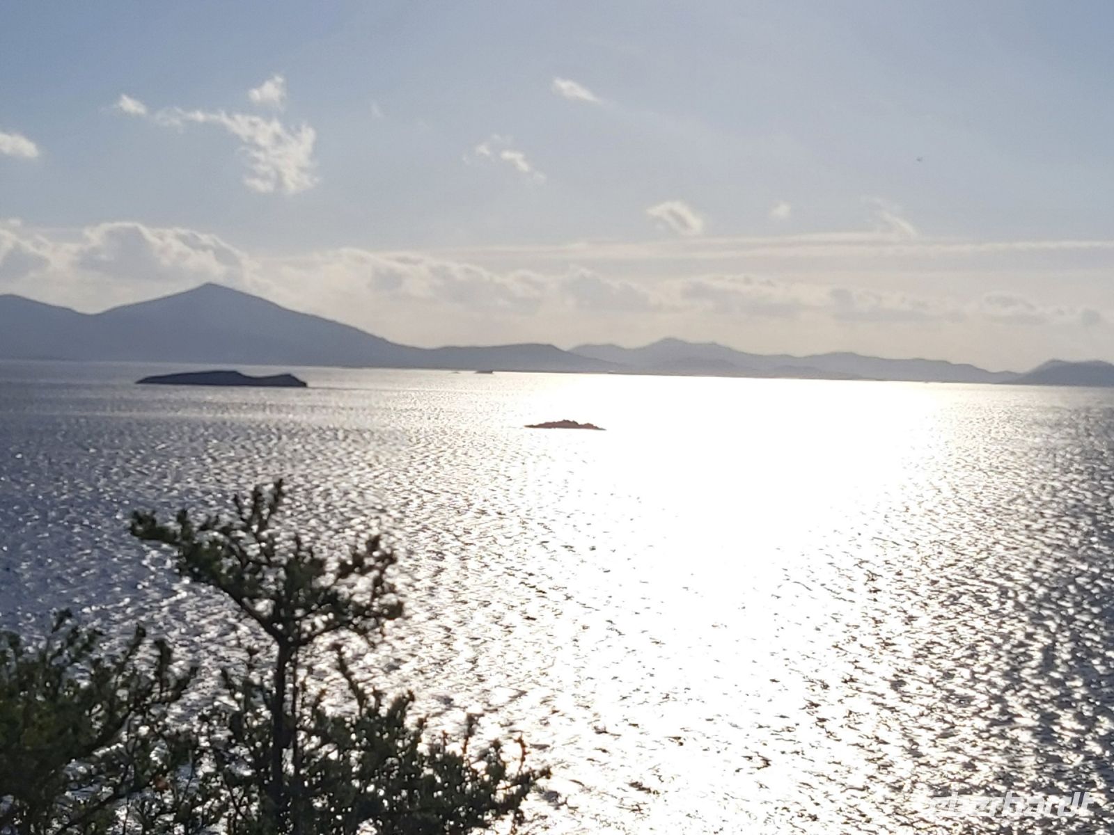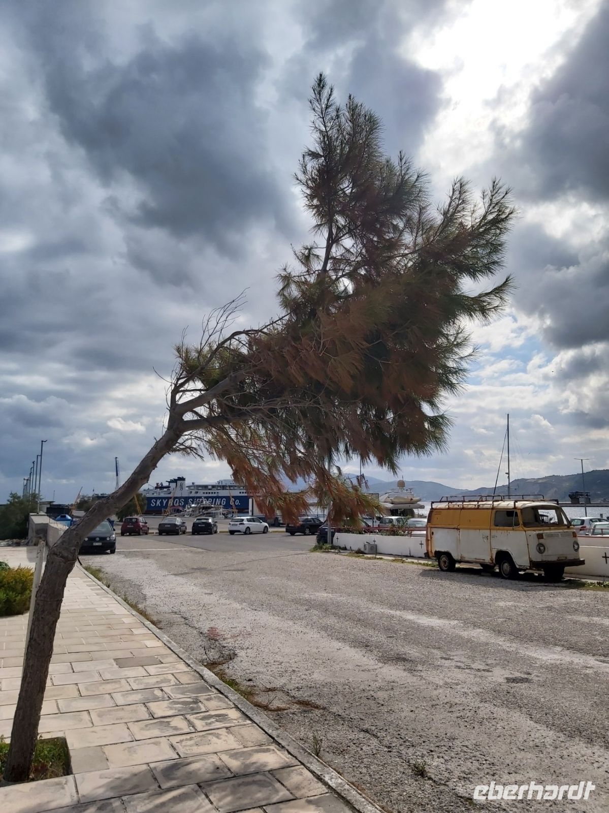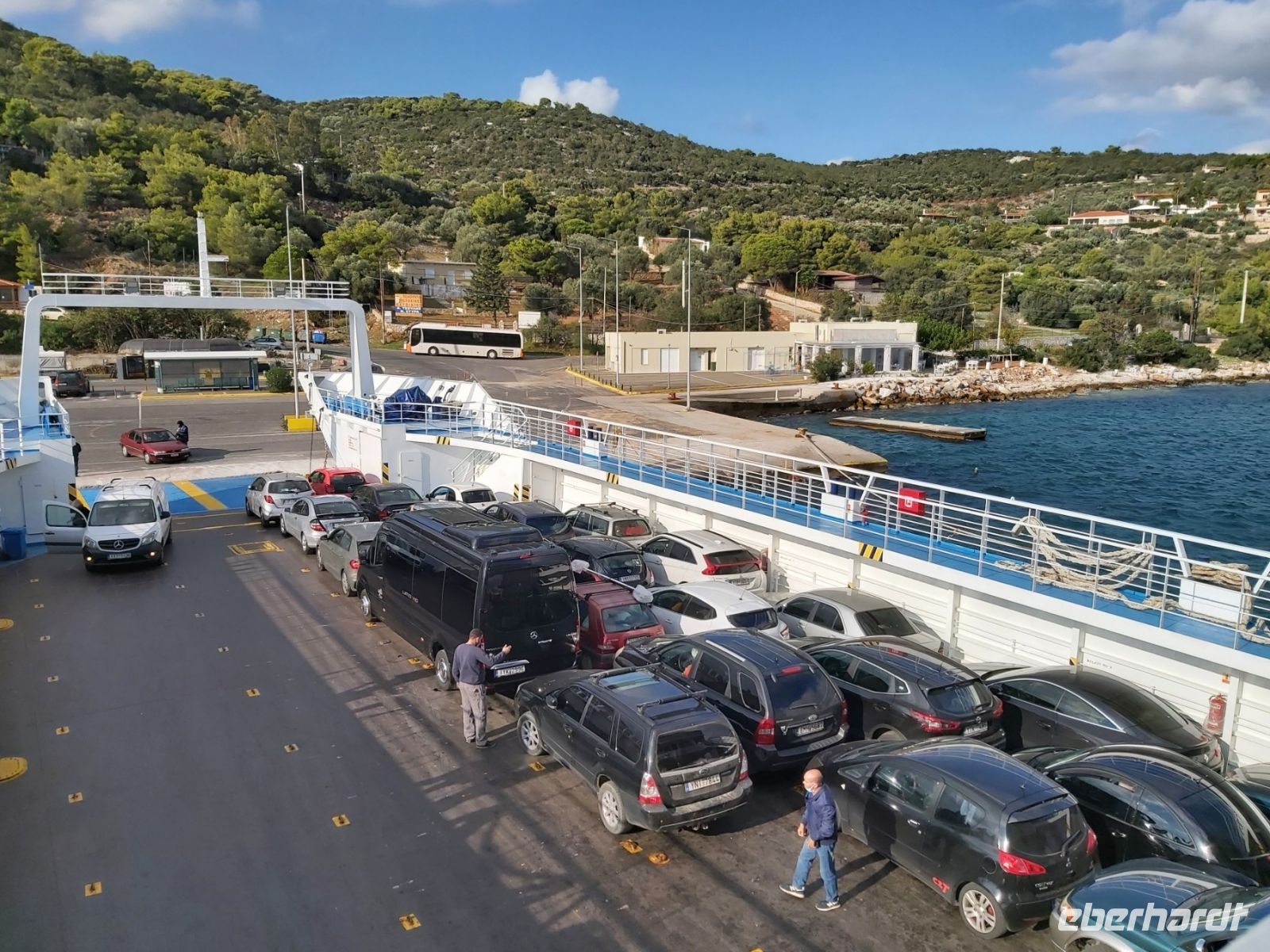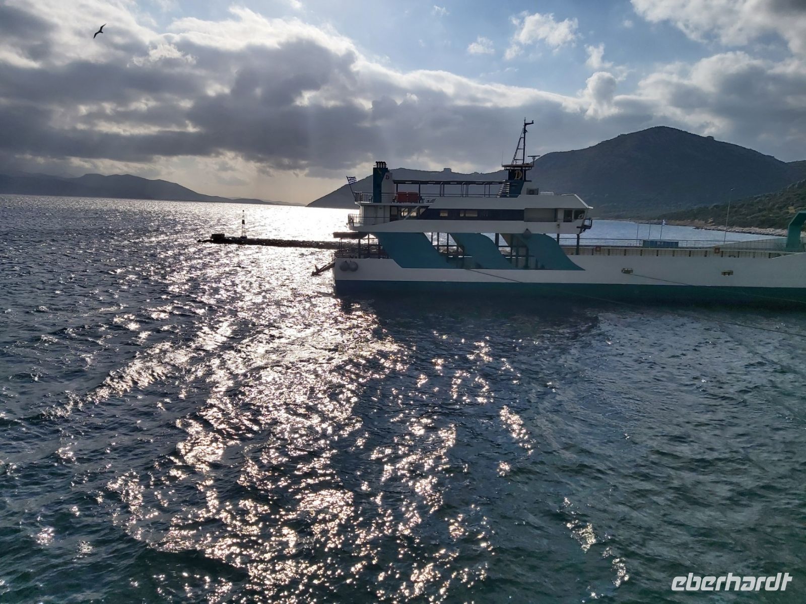 Während der Fährüberfahrt nach Euböa spiegelt sich das Sonnenlicht im Meer und Möwen begleiten uns. 45 Minuten windiges Meeresrauschen lassen uns noch einmal den Sommer spüren. Wir sind gespannt auf die Insel und erkunden am heutigen Tag die südliche Hälfte bis Karystos. Unterwegs halten wir an rätselhaften Steinstrukturen, die als Drachenhäuser bekannt sind. Vermutlich dienten sie als Unterbringung von Arbeitern, die den grünen Marmor abgebaut haben. Unser nächster Halt ist in den Ausläufern des Ochi Gebirges beim Castello Rosso. Ein schmaler, holpriger Weg erlaubt unserem Minibus die Vorfahrt bis zum Tor. Wir sind die einzigen Besucher und folgen dem Weg bis hinauf zur Burganlage. Die Burg wurde 1209-1216 errichtet und wechselte Besitzer und Herrscher im Verlaufe der Jahrhunderte. Von hier aus waren Eroberer, die über das Meer kamen, gut einzusehen. Wir haben uns eine gute Sicht in sehr stürmische Höhenlage erkämpft.