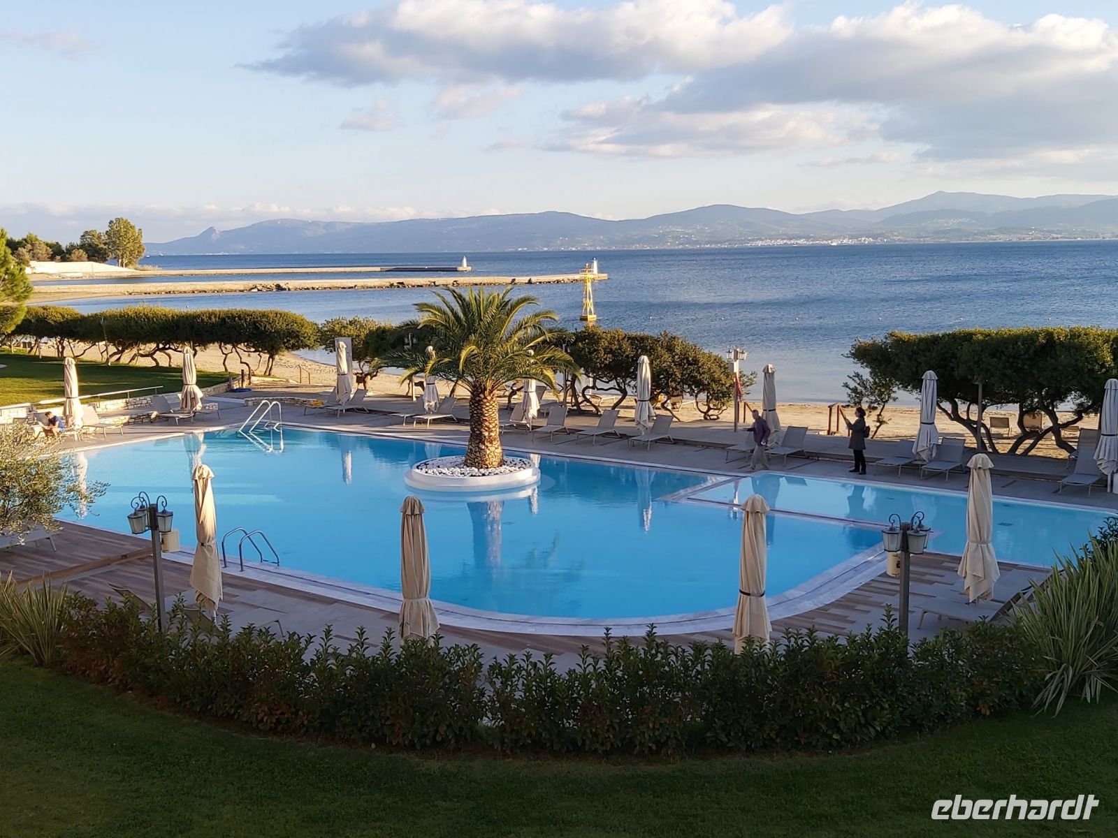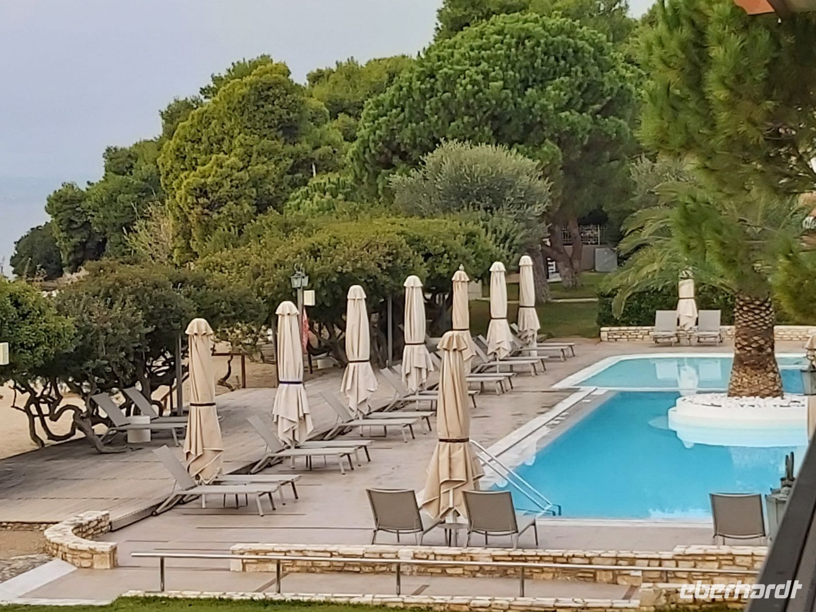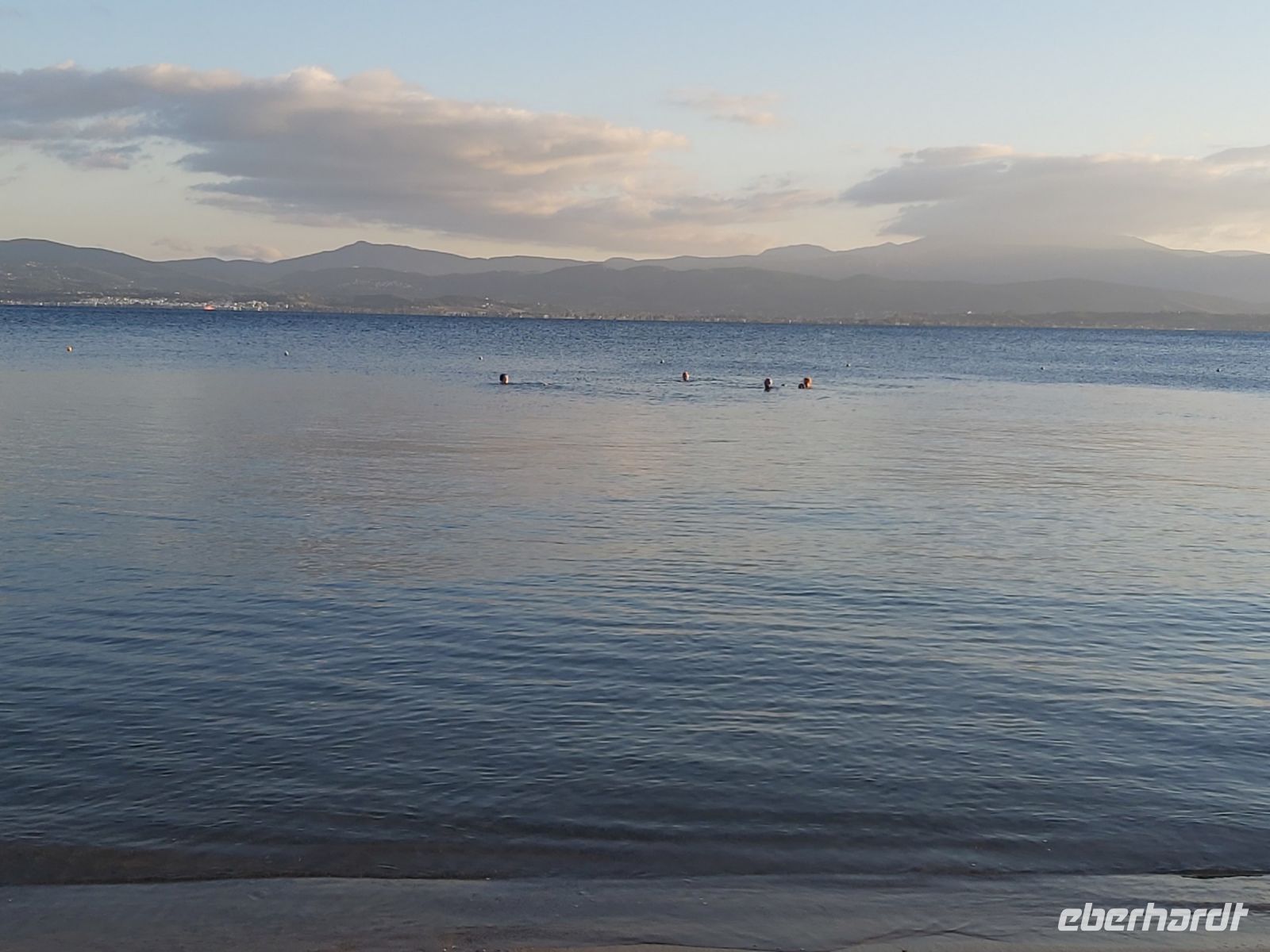 Anschließend fahren wir abwärts in die Stadt Karystos am Meer, nehmen unser Lunch, spazieren an der Promenade und beschauen die ankernden Fischerboote. Dann fahren wir Richtung Hotelunterkunft nach Eretria. Im Hotelresort atmen wir durch- alle haben Zimmer mit Balkon und Meerblick. Der Verheißung des Gartenpools können wir widerstehen, da das Wasser kälter ist als das Meerwasser: bei 21 Grad Wassertemperatur und 17 Grad Lufttemperatur steigen wir ins Meer.