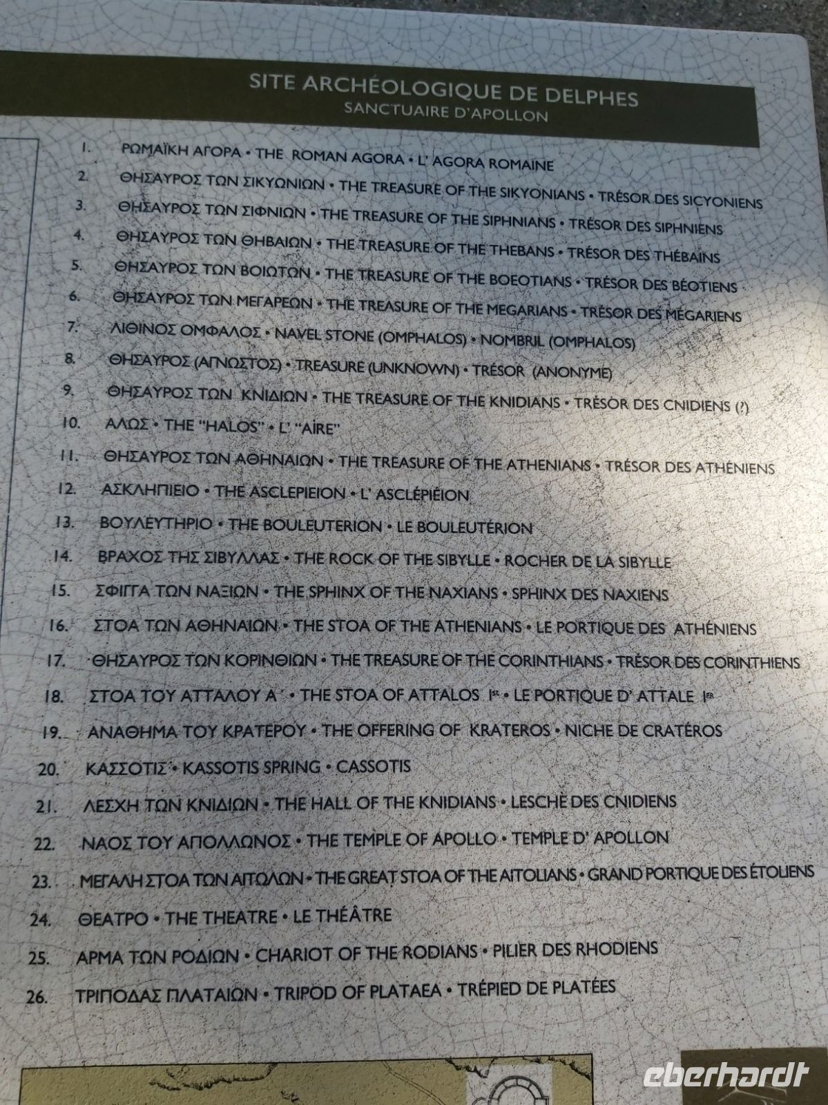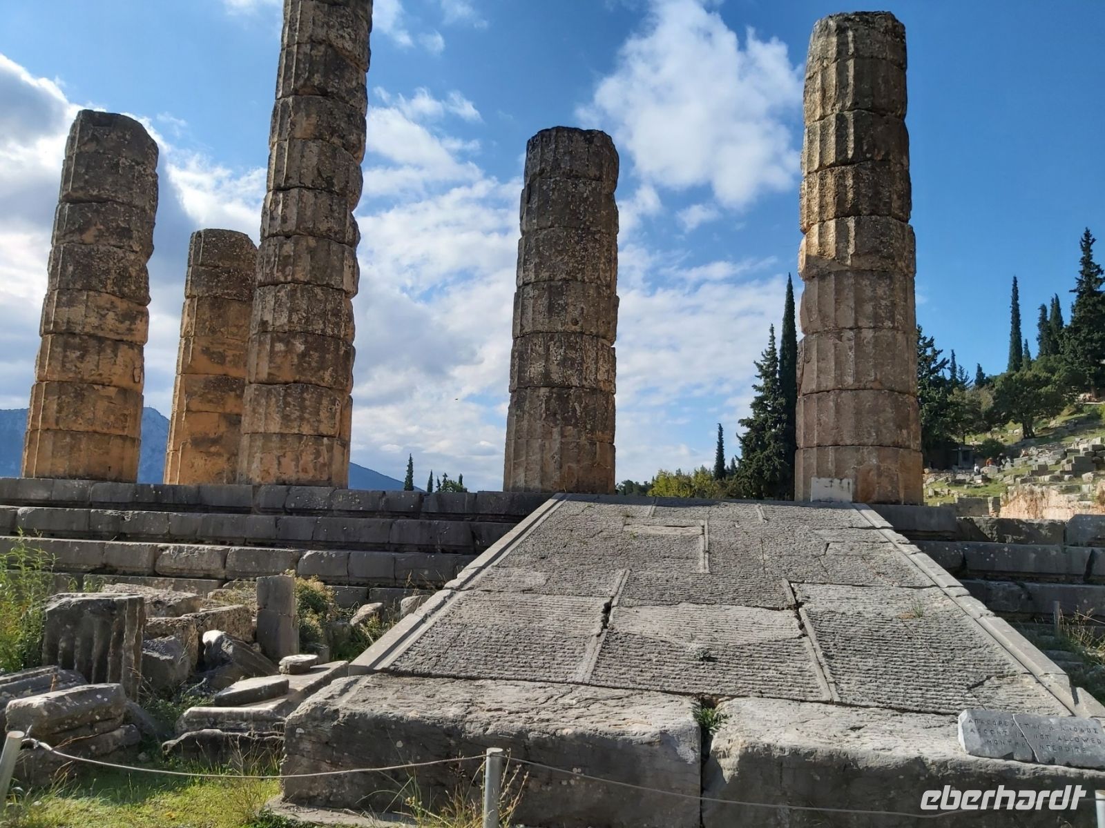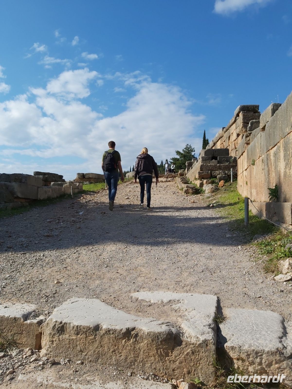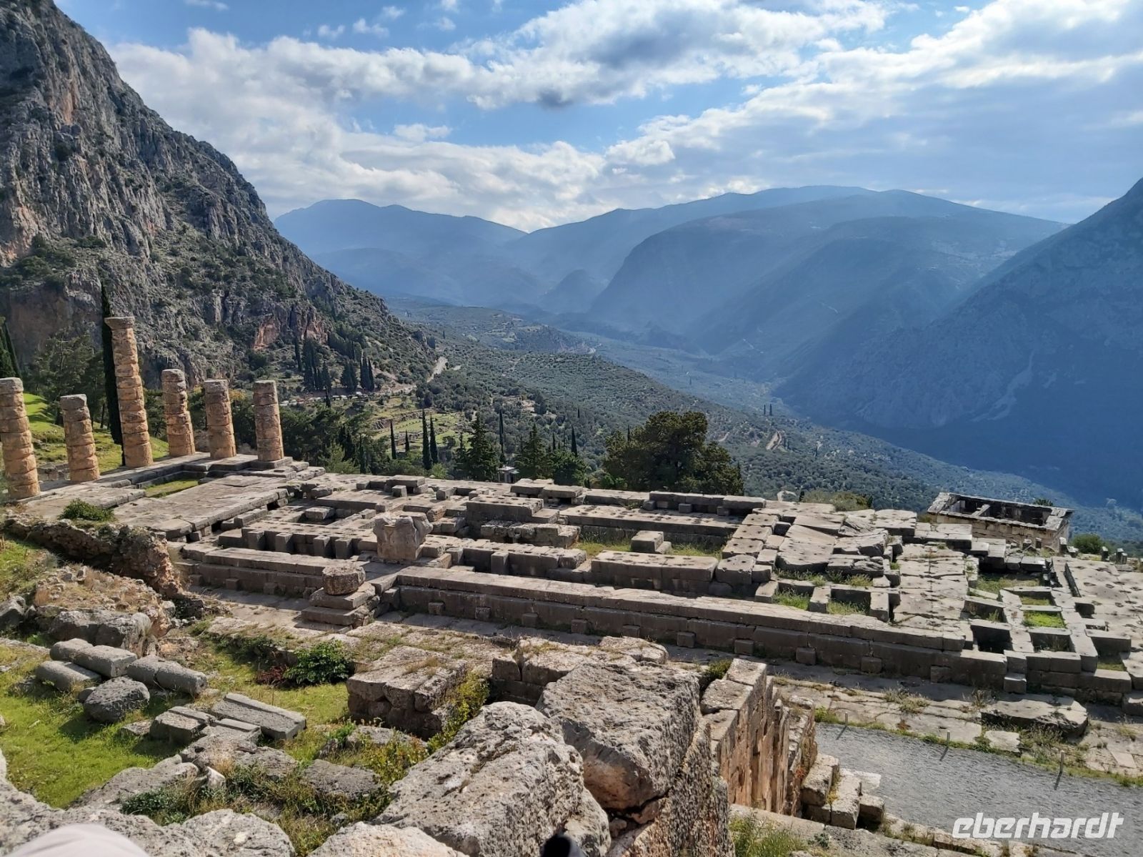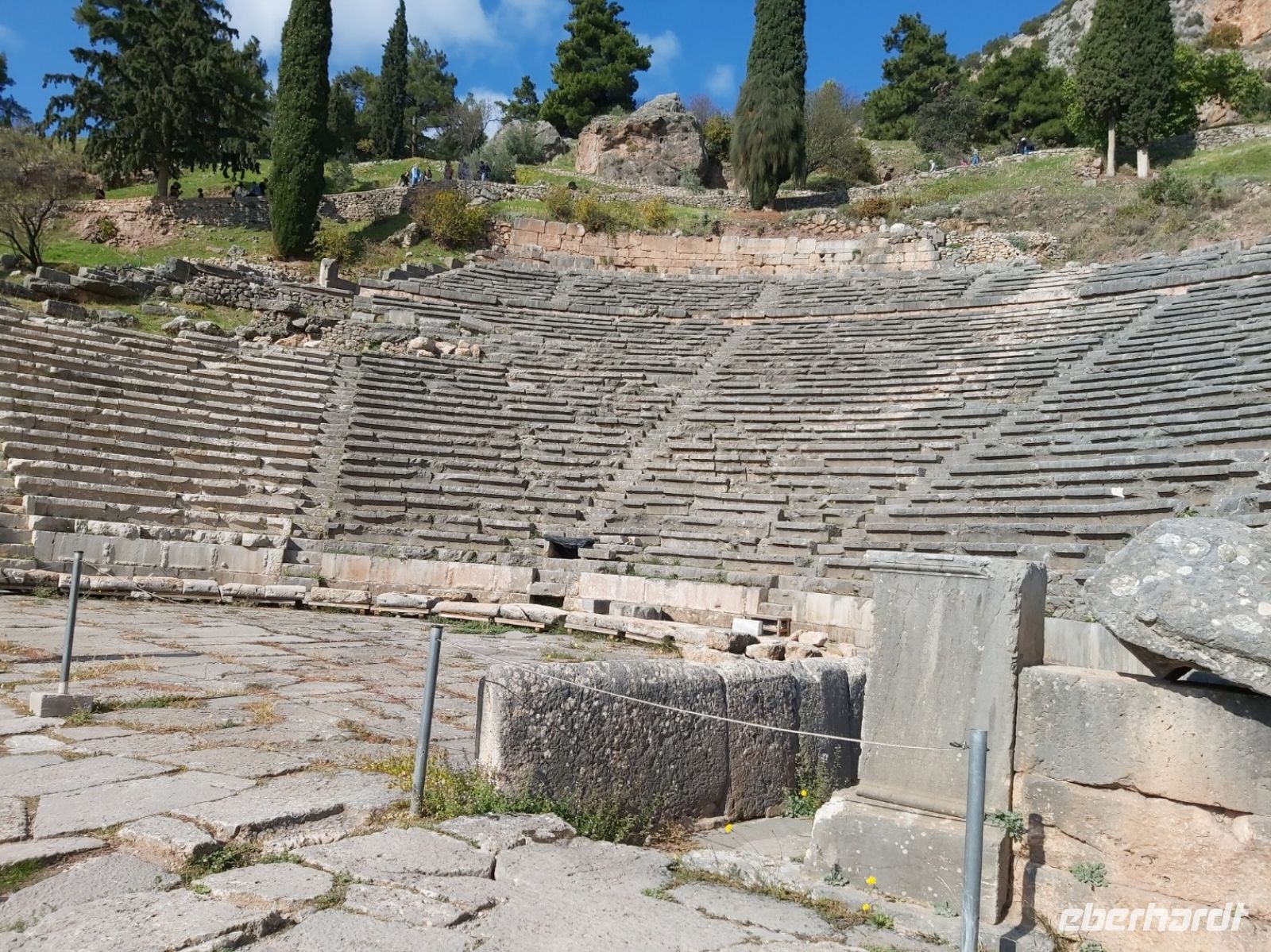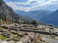 Der fakultative Ausflug führt uns über die Hängebrücke aufs Festland-2 h Fahrt. Wir überwinden 1000 m Höhe, ehe wir hinab nach Delphi kommen (knapp 500 m Höhenlage). Im Gelände folgen wir dem Heiligen Weg, den die Menschen bis zum Tempel zurück legten um das Orakel zu befragen. Der Ort bot den Pilgerern Unterhaltung durch Geschäfte, im Theater, durch Sport und Spiele im angrenzenden Stadion. Man vertrieb sich die Zeit bis zum Zeitpunkt des Zugangs zum Tempel. Mit den Audiogeräten gestalten wir den gemächlichen Anstieg bis zum Theater. Der steilere Weg bis zum Stadion steht den Gästen frei. Nach weiteren 20 Minuten indivdueller Besichtigung treffen wir uns zur Besichtigung des Museums. Auch hier wieder das vollständige Modell der Tempelanlage, die Farbigkeit beeindruckt. Im Museumsshop ist ergänzendes Material erhältlich.