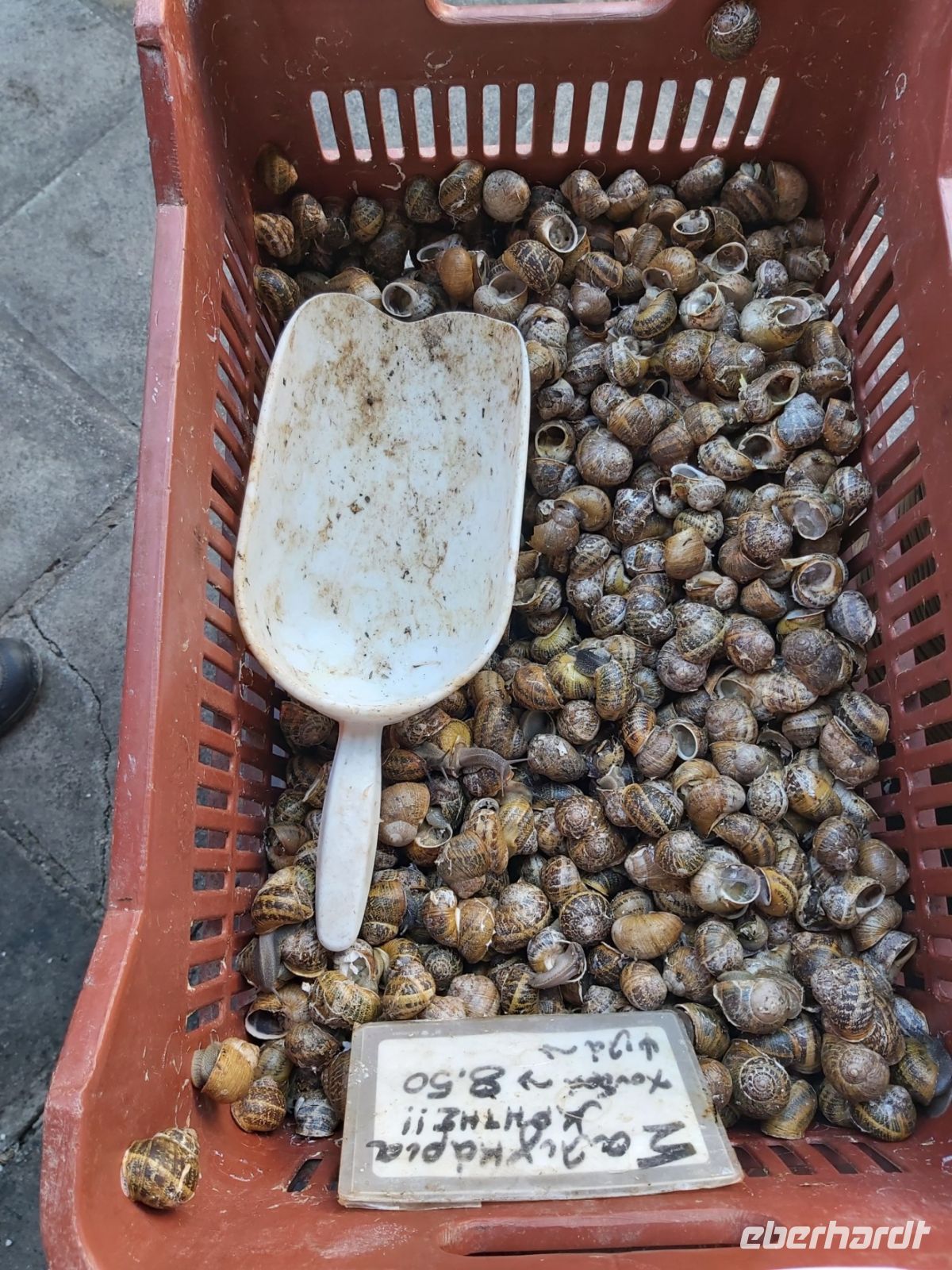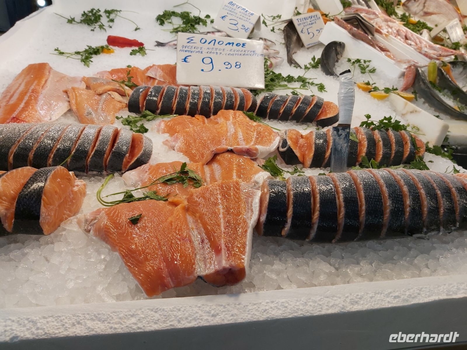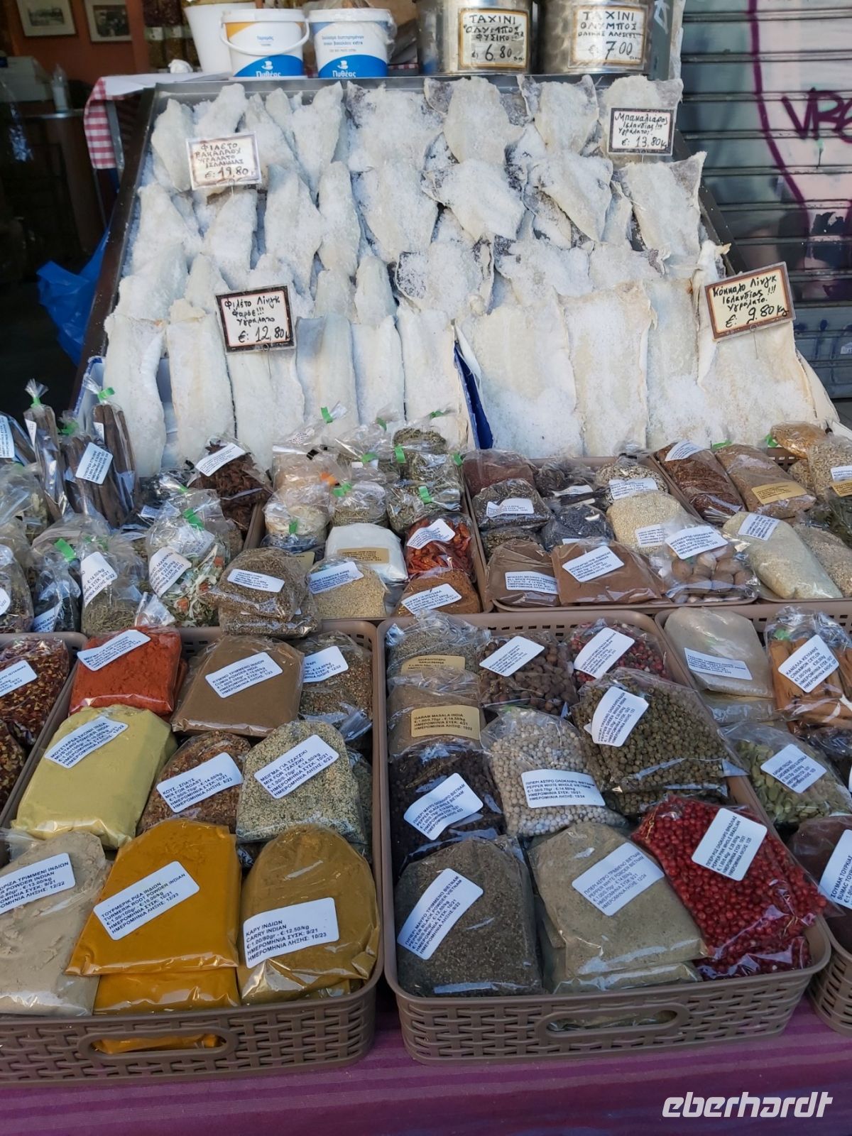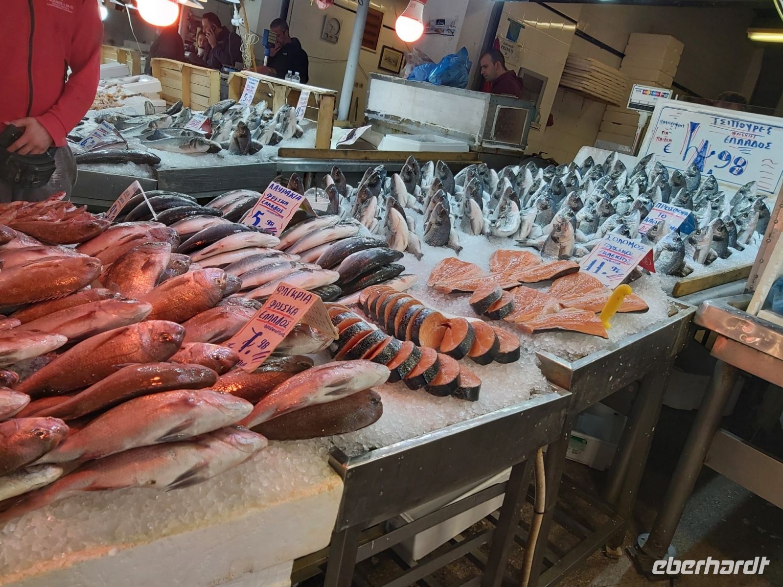 Auf Vorschlag von Anastasia laufen wir zur Besichtigung und lassen den Bus auf Abruf, falls wir ihn wünschen. So bleiben wir an verschiedenen Hausecken stehen und vor allem machen wir einen ausführlichen Stopp bei den Markthallen. Die Gewürze werden erklärt, 100 Grammtüten ein Preis: 1 €. Es werden Gewürze und Pistazien gekauft. Dann folgt ein Rundgang in der Fischhalle. Die Präsentation der Fische ist einmalig. Die Krabben bewegen sich noch in Zeitlupe, der Oktopus sei schmackhaft als herzhafter Salat oder gegrillt. Beides werden wir später im Restaurant probieren.