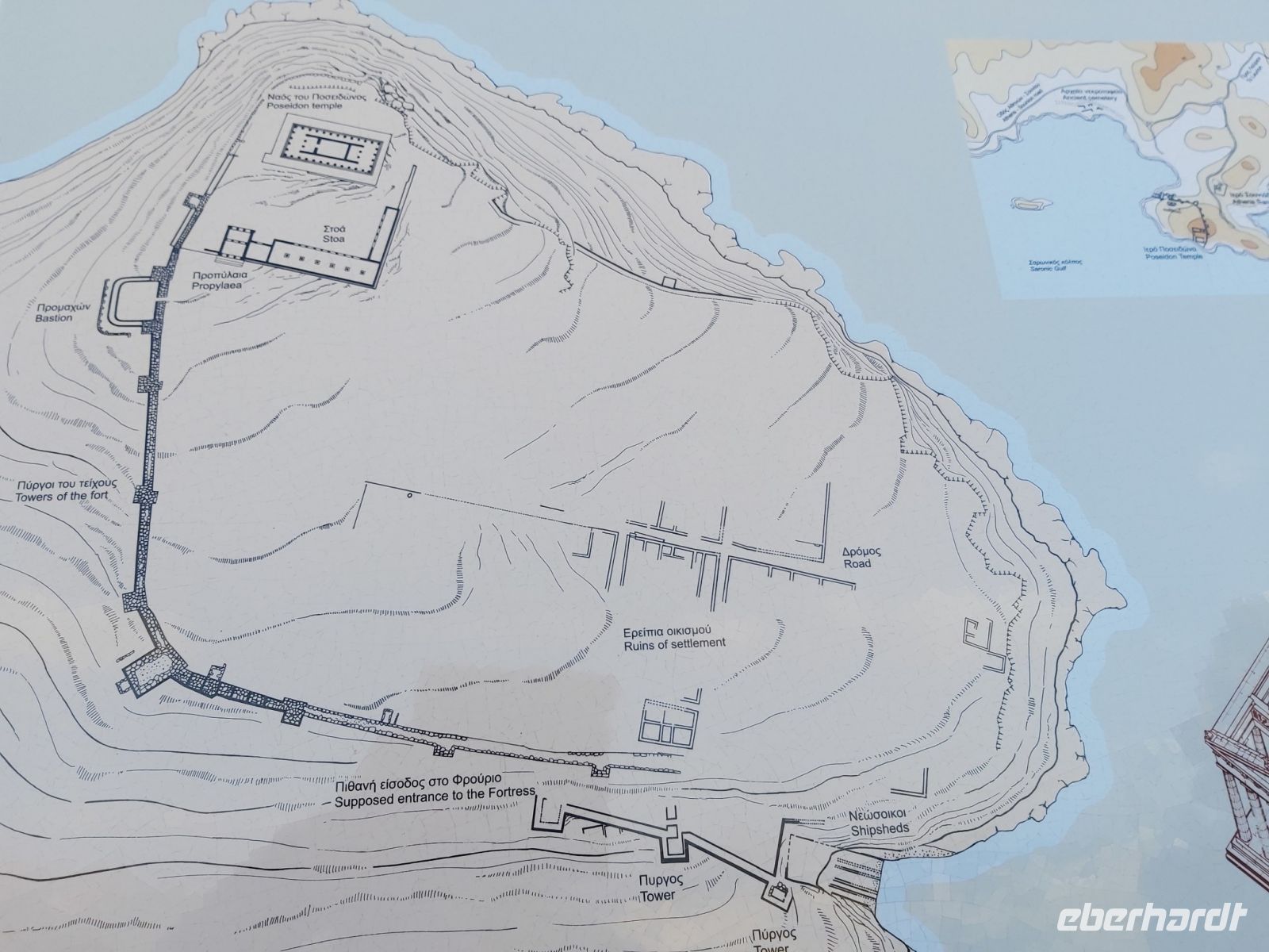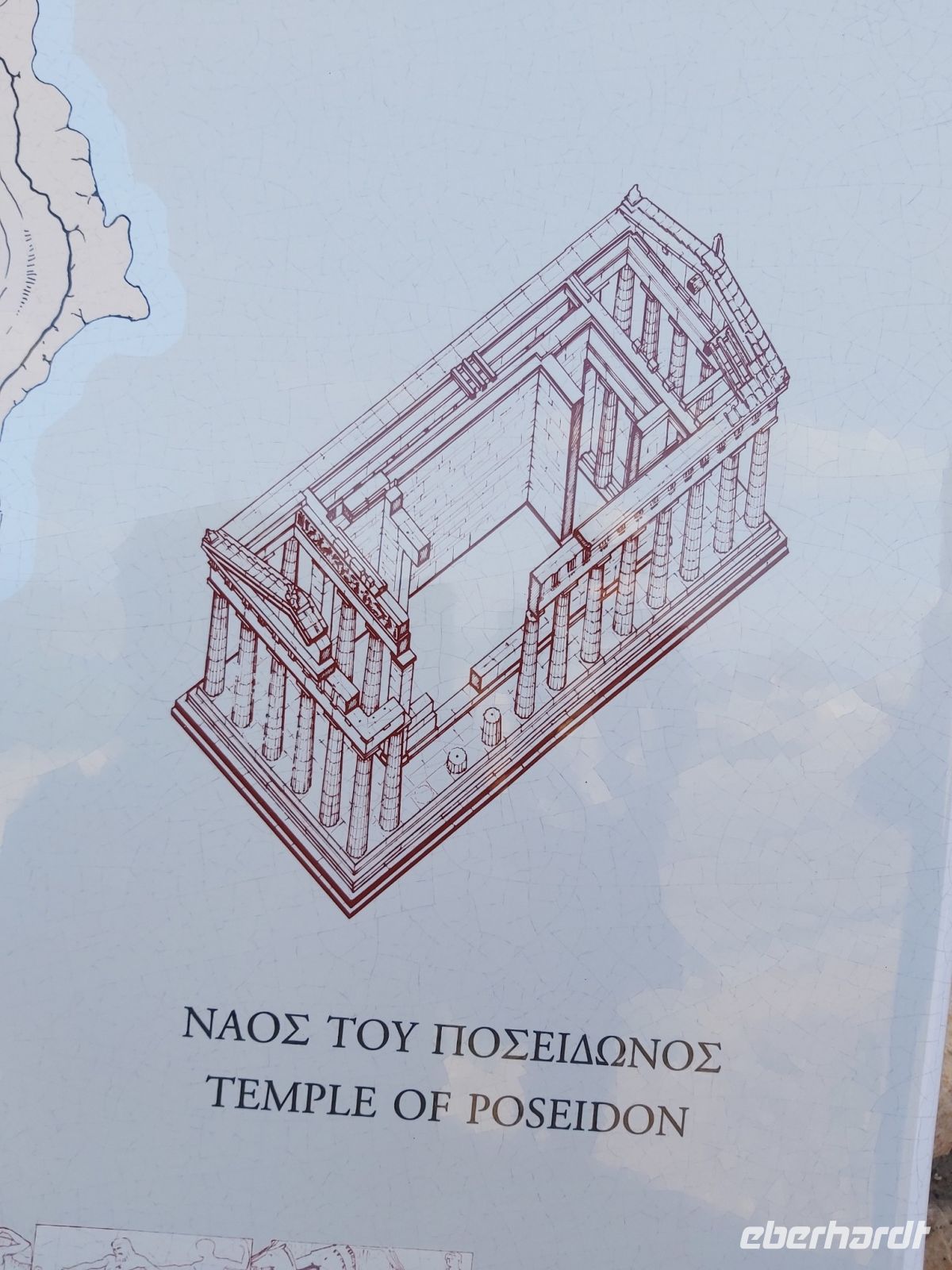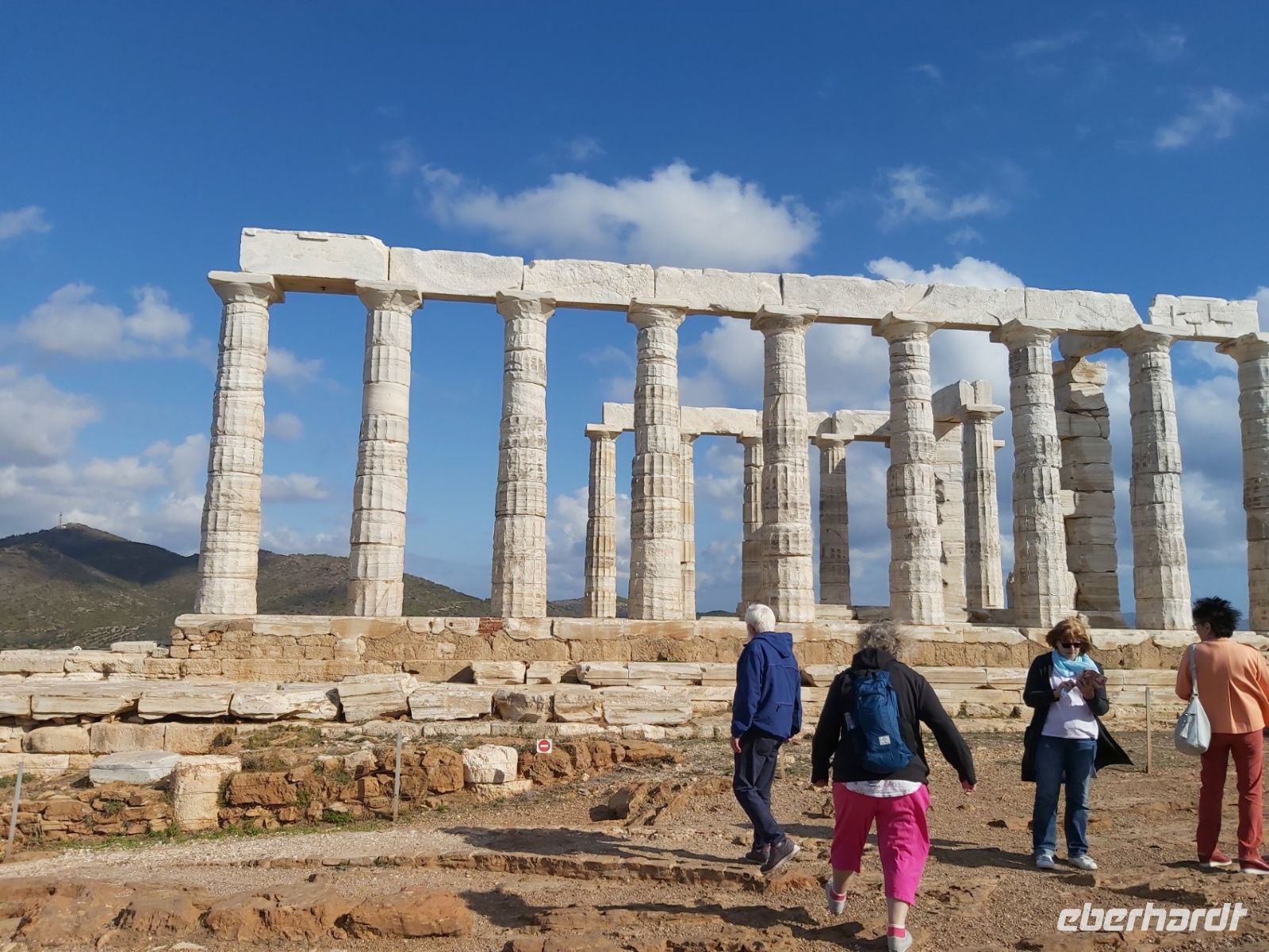 Wer als Leser den Eindruck gewinnt, Tempel und Ausgrabungen im täglichen Programm wiederholen sich, kann sich durch die Fotos überzeugen, dass keine archäologische Stätte der anderen von der Lage und der landschaftlichen Umgebung her der anderen gleicht. Vor diesem Hintergrund ist die Landschaft Reiz und Ziel der Exkursion, die belohnt wird durch eine einzigartige Verbindung von dem kulturhistorischem Zeugnis eines Tempels in Verbindung mit der Natur. Poseidon als Gott des Meeres und Bruder des Zeuss - ihm wurde auf der Klippe der schöne Tempel geweiht. Die Athener kamen früher mit Schiffen daher um den Gott zu ehren. Wir lassen uns verzaubern von dem Tempelblick über das Meer und lauschen den Ausführungen von Anastasia zur Tempelarchitektur.