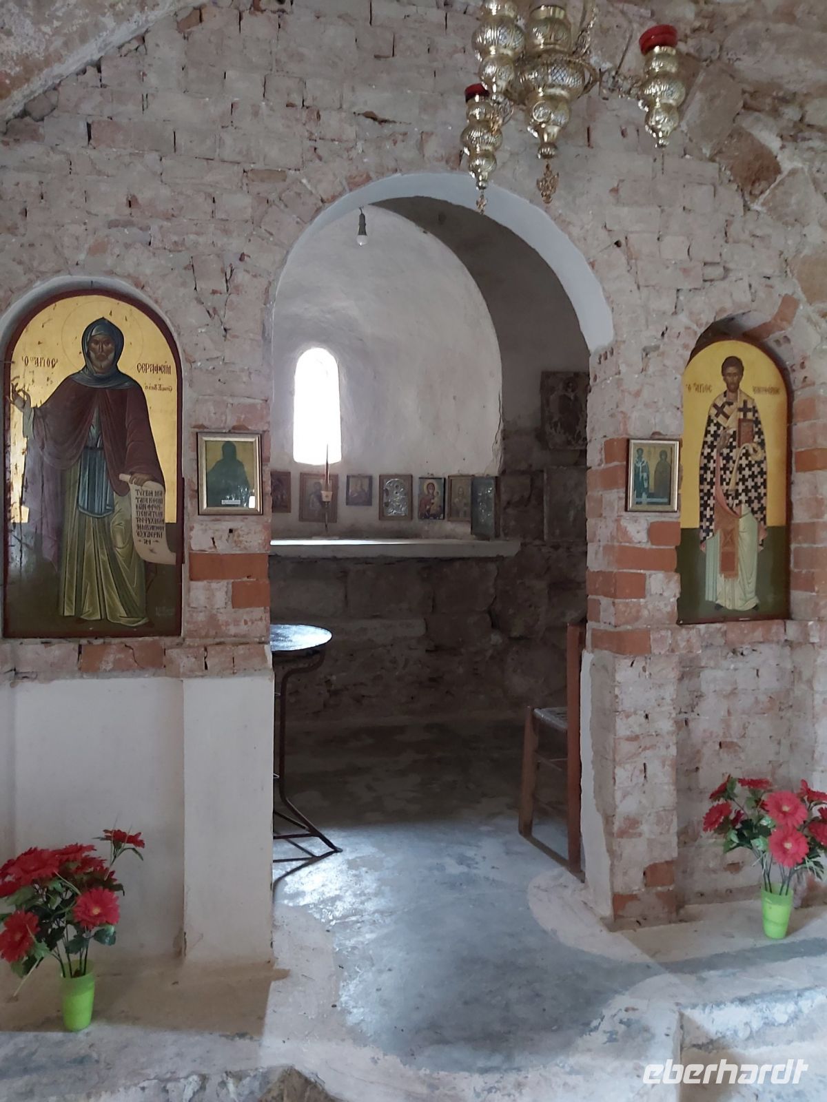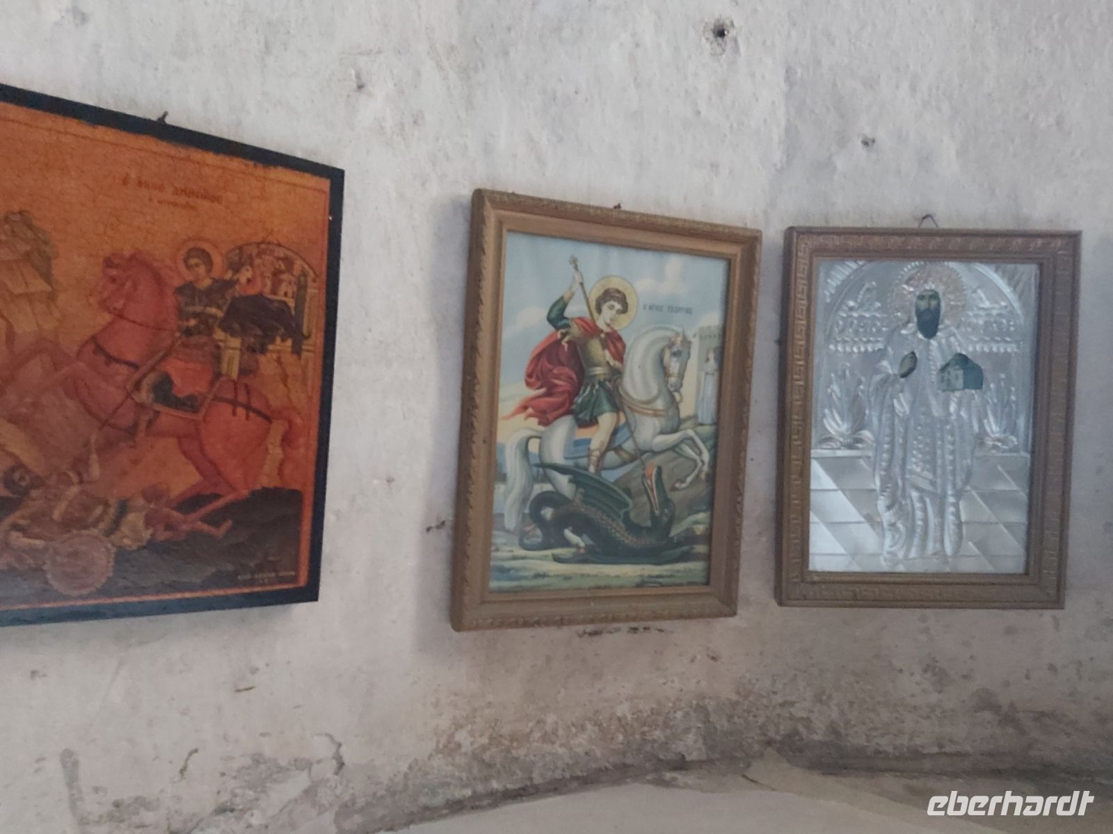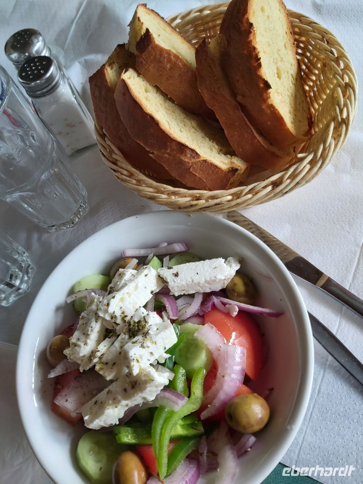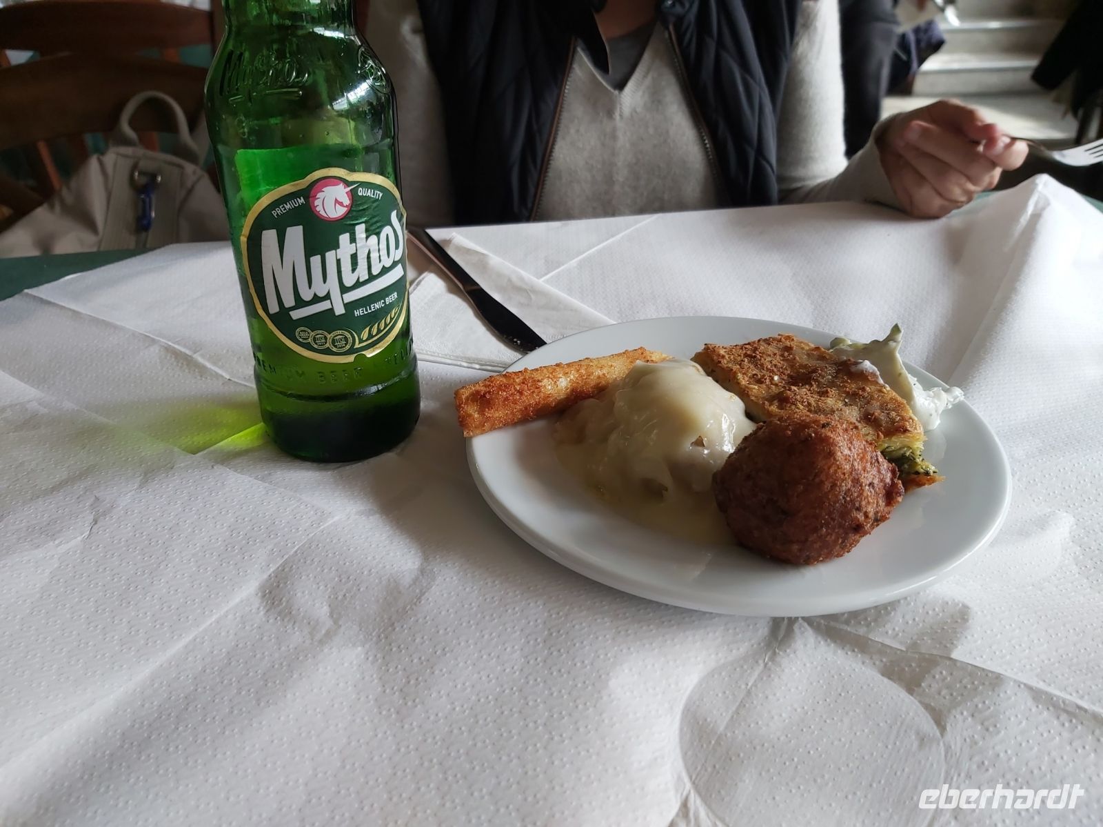 Die Mittagspause nehmen wir in einer Taverne. Dort hatten wir den Eindruck, dass wir in einem ehemaligen, umgebauten Wohnzimmer saßen. Küche auf engstem Raum. Ein altes Radio übertönte unsere Mittagsgespräche. Die Bedienung war flink u. und die Vorpeisen schnell auf den Tisch gezaubert u. sehr schmackhaft.