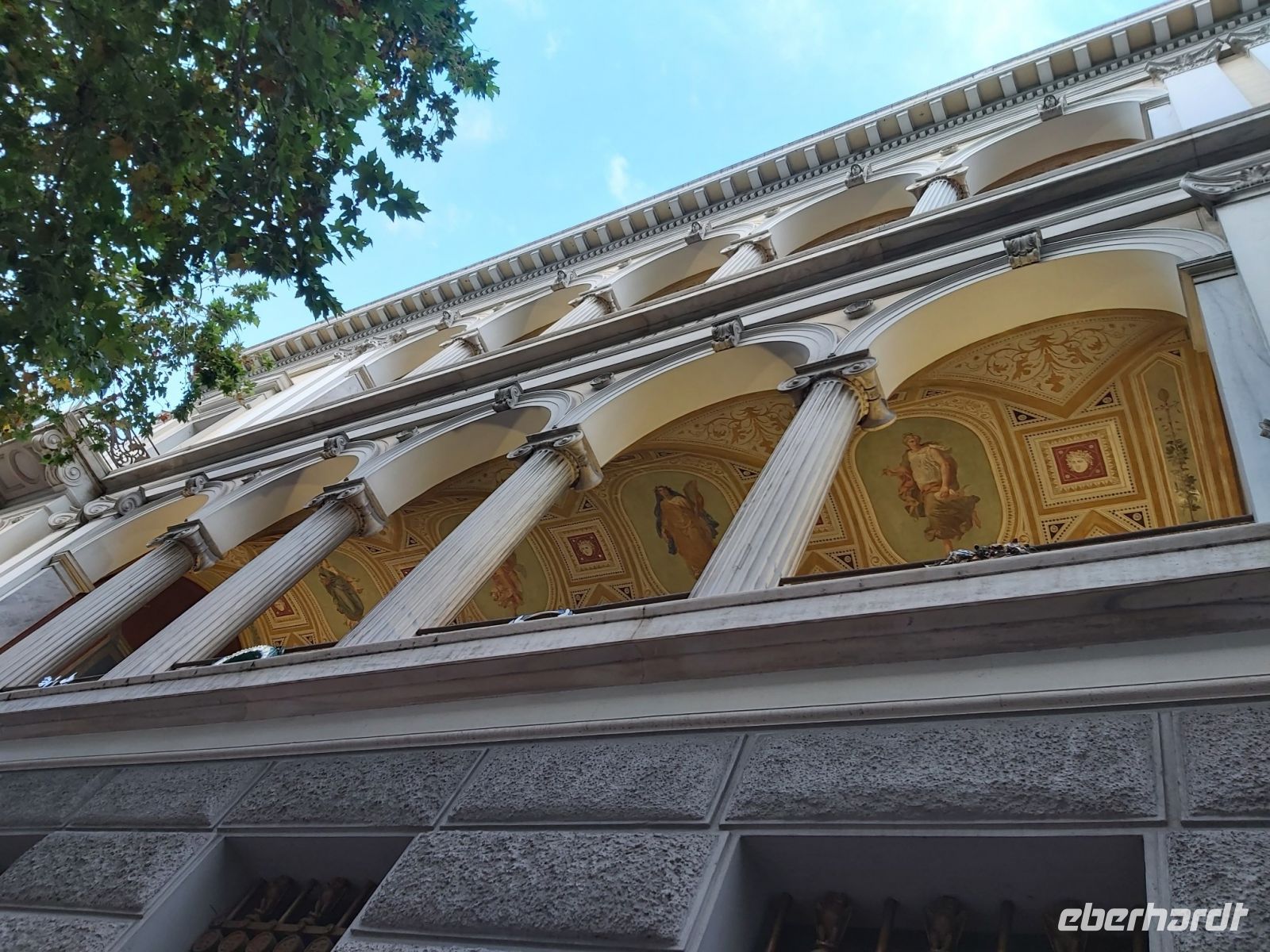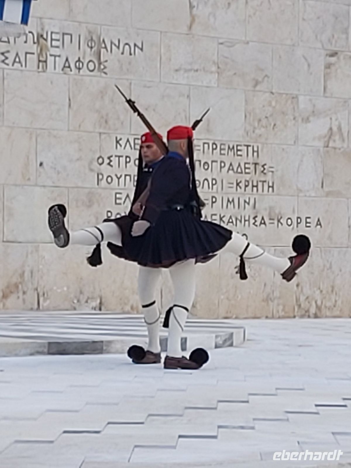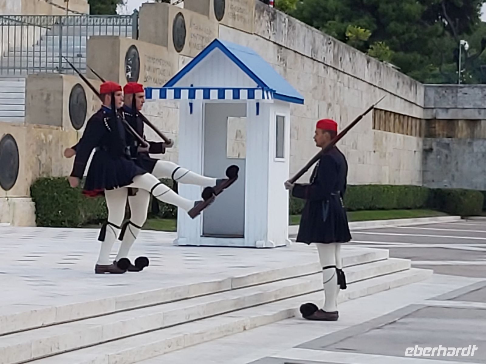 Wir wurden von unserem Fahrer Vasilis begrüßt u. zu einem schwarzen, fenstergetönten Kleinbus geleitet. Dieser sollte uns also die nächsten Tage begleiten. Vasilis gab auf dem Weg zum Hotel erste Erklärungen zu Athen u. den Sehenswürdigkeiten am Wegesrand. Vorbei am Regierungsgebäude u. den drei klassizistischen Gebäuden der Akademie, Bibliothek u. der (alten) Universität waren wir auch schon an unserem Hotel Titania angelangt; zentral gelegen. So konnten wir vor dem Abendessen bereits die Umgebung erkunden und der Wachablösung der Präsidialgarde am Parlament beiwohnen. Noch waren die Evzonen (Bezeichnung der Soldaten der ehemaligen königlich-griechischen Leibgarde) in sommerlicher Uniform, was sich mit der kühleren Witterung am nächsten Tag änderte.