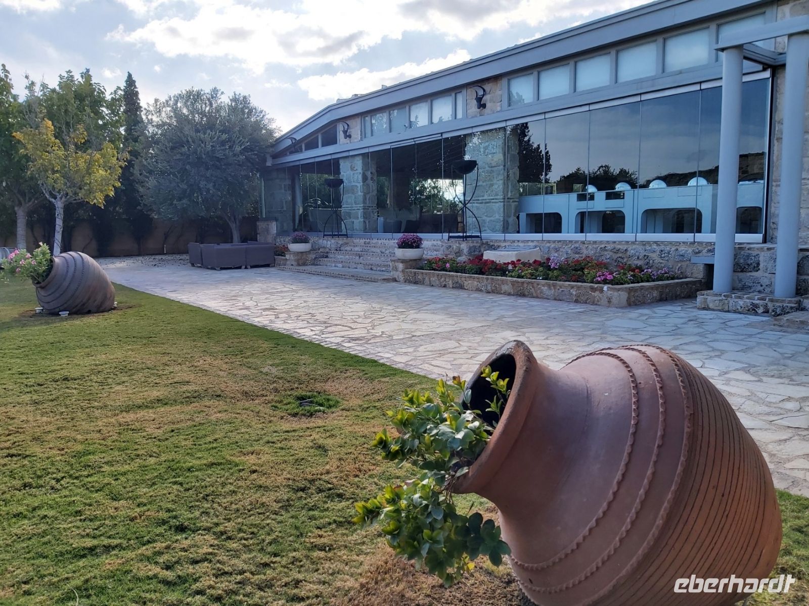 Das Weingut Vasssilliou beindruckt uns als modernes Landgut mit Tradition in 4. Generation. Wir werden von der Urenkelin des Gründers begleitet, die das Gut heute mit ihrem Cousin führt. Man erkennt modernes Management an der Investition in neue Gebäude und Anlagen, am Konzept der Vermietung als Eventlocation sowie an der Webseite mit Onlinevertrieb der Weine. Die Tradition des Weinanbaus und der Traubenverarbeitung wird anschaulich im kleinen Museum gezeigt. Wir verkosten vier Weine und erwerben käuflich noch einen Wein des individuellen Geschmacks.