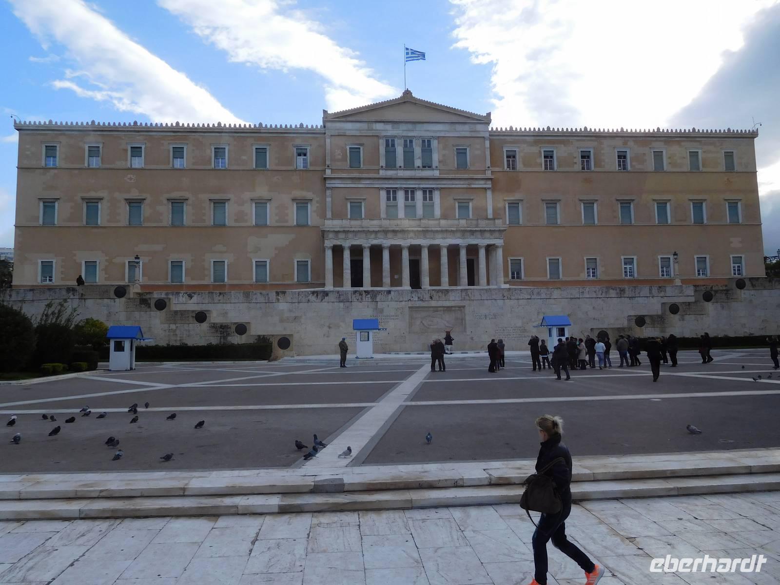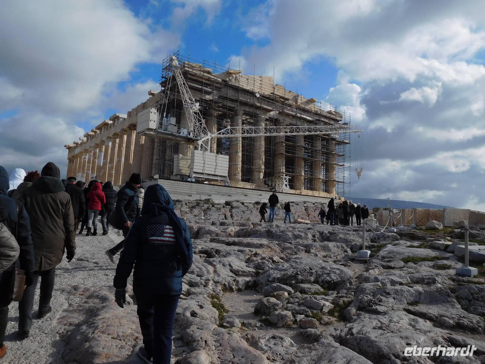 Der heutige Tag beginnt für uns mit einem reichhaltigen Frühstück im Hotelrestaurant. Nach dem Genuss des einen oder anderen Kaffees treffen wir uns 9:00 Uhr an der Rezeption und starten mit Reiseleiterin Lenia zu unserem Ausflug. Bei unserer Stadtrundfahrt durch Athen sehen wir unter anderem das Olympiastadion, das griechische Parlament mit Soldaten, die den ganzen Tag Wache stehen und, um nicht steife Glieder zu bekommen, interessante Bewegungen vorführen. Auch für uns ist dies eine Attraktion und wir bestaunen sie lang, bemitleiden sie allerdings auch, da heute ein sehr kühler Tag bei recht winterlichen Temperaturen ist.