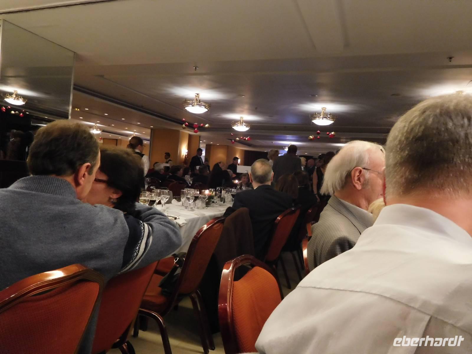 Am Tisch haben wir reichlich Wein stehen und eine große Auswahl guter Speisen erwartet uns am Buffet des Hotels. Bis Mitternacht verbringen wir die Zeit mit guten Gesprächen und genießen die kulinarischen Köstlichkeiten. Einige von uns gehen auch schon auf die Tanzfläche und schwingen das Tanzbein. Wie schön, alle lachen und fröhlich zu sehen. Um Mitternacht treffen wir uns auf der Dachterrasse des Hotels in dicke Jacken gehüllt...