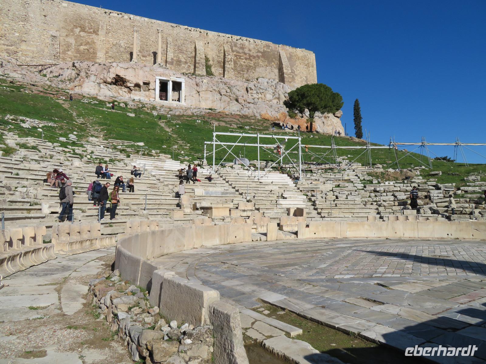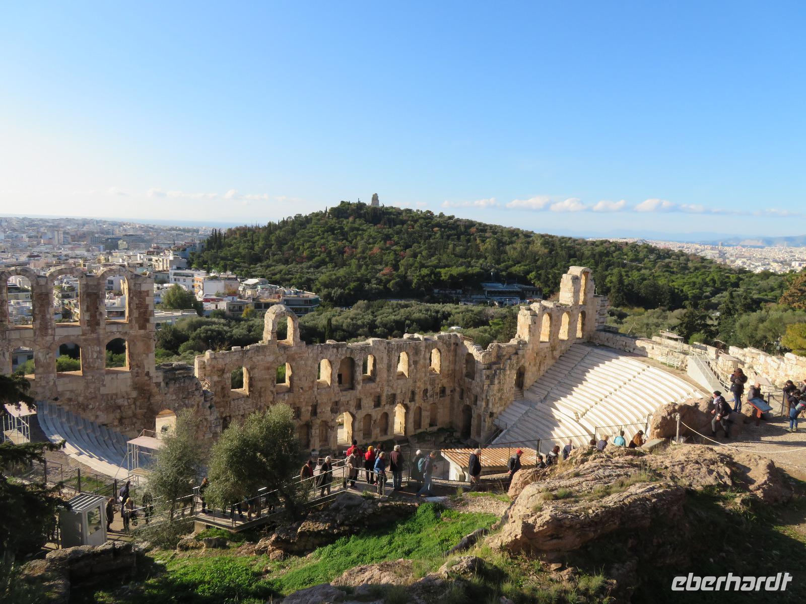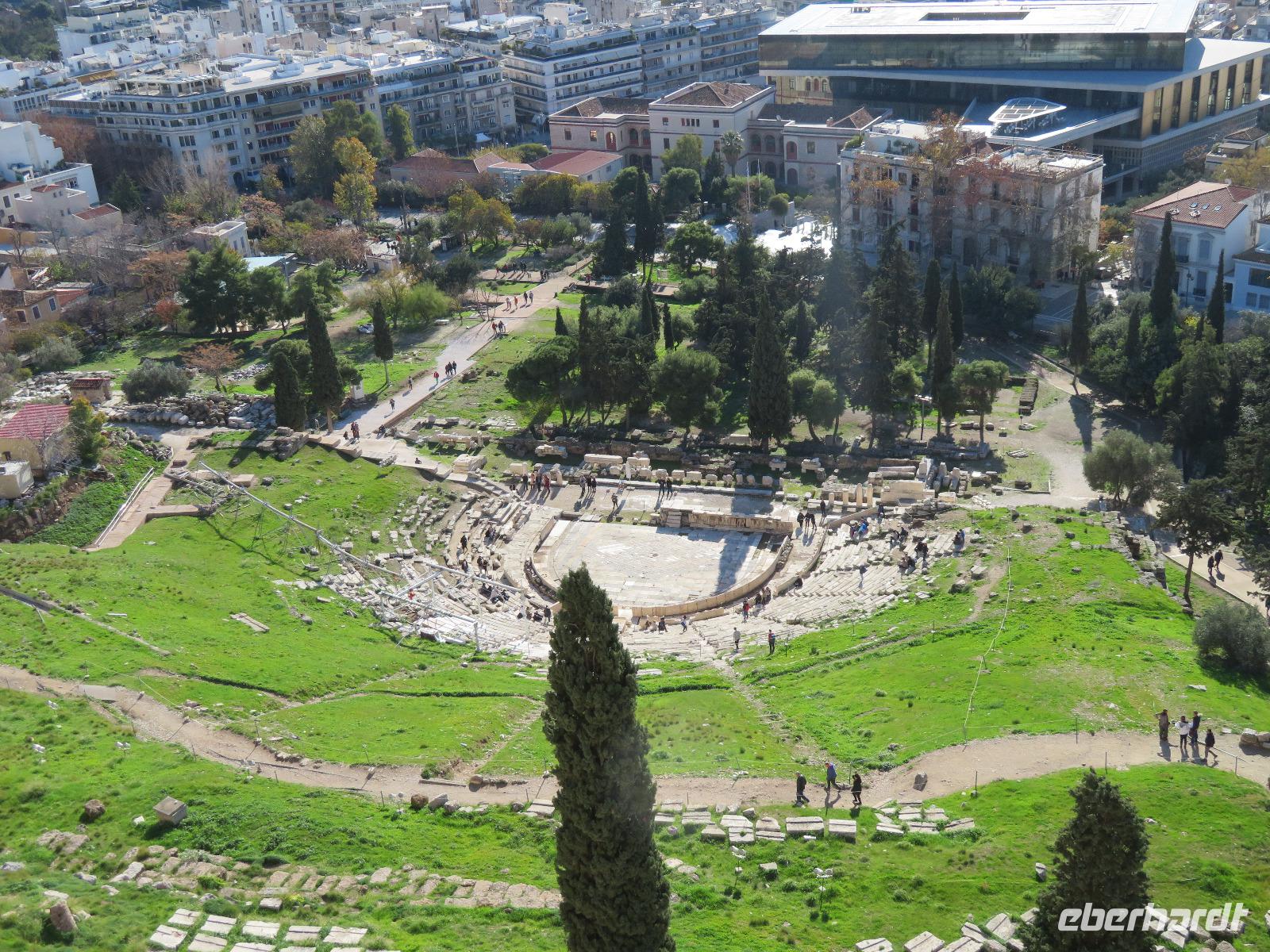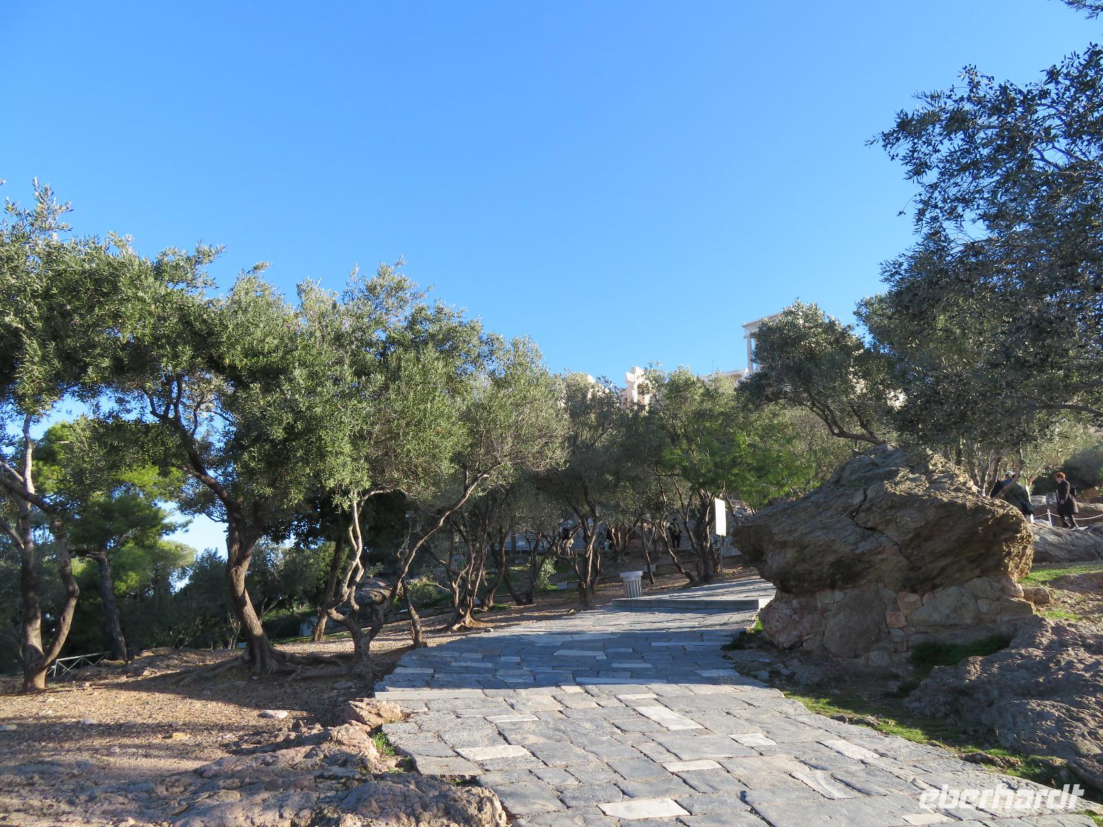 Nach dem Frühstück sind wir zur Akropolis gefahren, dem Wahrzeichen der Stadt. Langsam gingen wir den Berg hinauf, vorbei an grünen Oliven- und Johannisbrot-Bäumen. Die Akropolis spiegelt die goldene Zeit der Stadt um 500 v.C. mit den Idealen von Pericles wider. Auf den Hügel wurde ein schönes Odeon gebaut, in denen damals Theater-Vorstellungen und Musik-Konzerte gespielt wurden. Ein Stück weiter höher, fanden wir das Tor der Akropolis, die sogenannten Propyläen. Im nordwestlichen Teil befindet sich der Athena-Nike Tempel, welches auf ihrer linken Seite das große Tor mit ihren Säulen und der Rampe, die Agora mit der Akropolis verbindet und gleichzeitig den Weg für die alten Prozessionen aufzeigt. In dem nordöstlichen Teil gab es eine Alte Pinakothek (Gemäldegalerie) mit verschiedenen Ausstellungen des Gottes und das Monument von Agrippa. Auf der Akropolis fanden wir auf unserer linken Seite den alten Tempel von Athene und das Erechtheion mit ihren berühmten Karyatiden. In den westlichen Teil der Akropolis befindet sich der imposante Tempel von Parthenon, was neben der Eule und den Olivenbäumen, ein Symbol der Stadt bildet. Auf dem Weg hinab haben wir die Ruinen des Augustus Tempels gesehen, sowie das Odeon, was auf der anderen Seite lag und das bekannte Dionysostheater. Auf den Rückweg sind wir ebenfalls über den Peripatos spazieren gewesen.