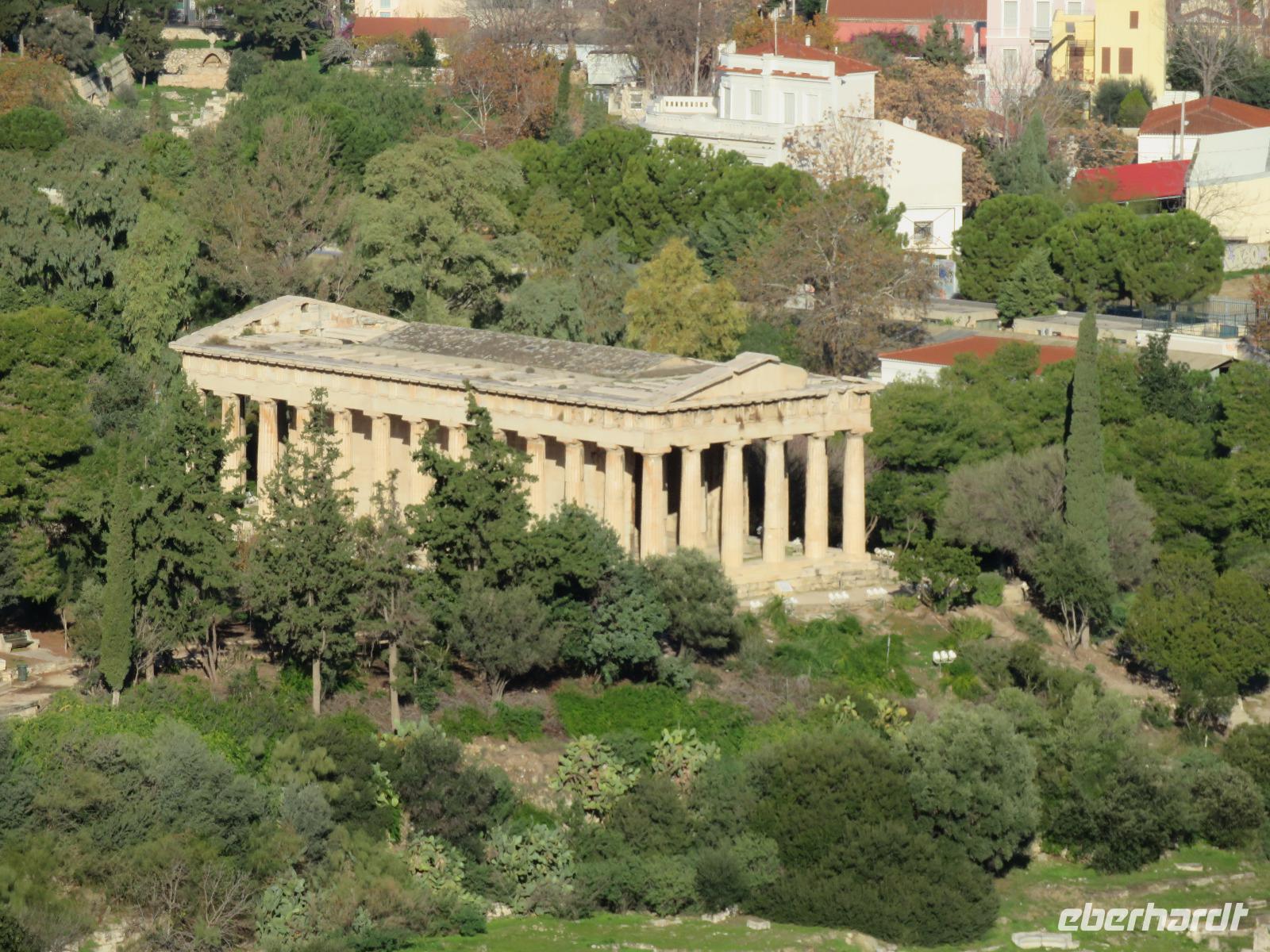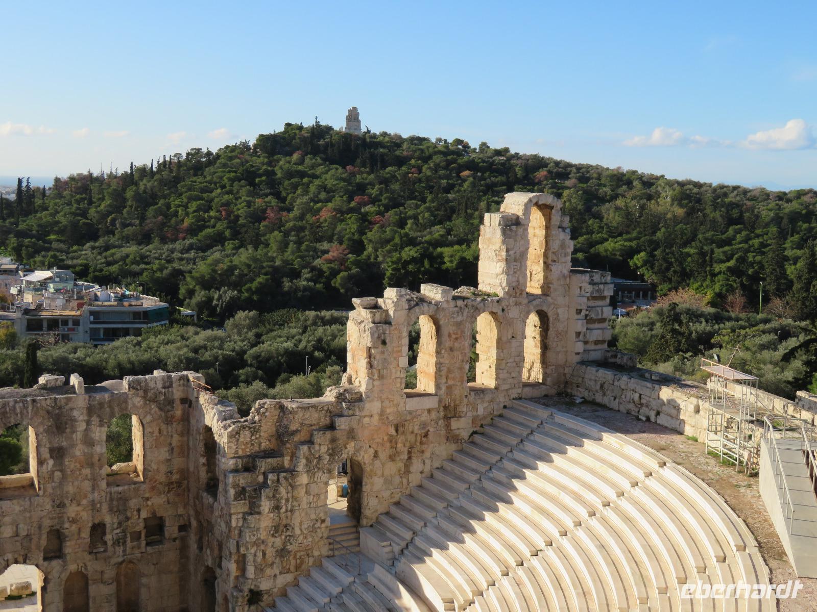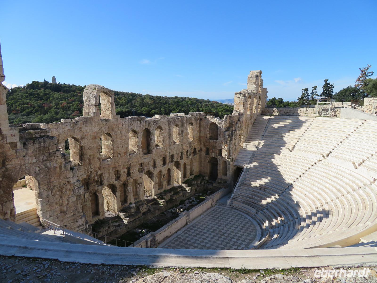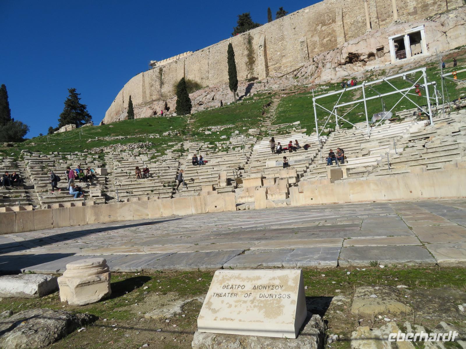 Nach dem Frühstück sind wir zur Akropolis gefahren, dem Wahrzeichen der Stadt. Langsam gingen wir den Berg hinauf, vorbei an grünen Oliven- und Johannisbrot-Bäumen. Die Akropolis spiegelt die goldene Zeit der Stadt um 500 v.C. mit den Idealen von Pericles wider. Auf den Hügel wurde ein schönes Odeon gebaut, in denen damals Theater-Vorstellungen und Musik-Konzerte gespielt wurden. Ein Stück weiter höher, fanden wir das Tor der Akropolis, die sogenannten Propyläen. Im nordwestlichen Teil befindet sich der Athena-Nike Tempel, welches auf ihrer linken Seite das große Tor mit ihren Säulen und der Rampe, die Agora mit der Akropolis verbindet und gleichzeitig den Weg für die alten Prozessionen aufzeigt. In dem nordöstlichen Teil gab es eine Alte Pinakothek (Gemäldegalerie) mit verschiedenen Ausstellungen des Gottes und das Monument von Agrippa. Auf der Akropolis fanden wir auf unserer linken Seite den alten Tempel von Athene und das Erechtheion mit ihren berühmten Karyatiden. In den westlichen Teil der Akropolis befindet sich der imposante Tempel von Parthenon, was neben der Eule und den Olivenbäumen, ein Symbol der Stadt bildet. Auf dem Weg hinab haben wir die Ruinen des Augustus Tempels gesehen, sowie das Odeon, was auf der anderen Seite lag und das bekannte Dionysostheater. Auf den Rückweg sind wir ebenfalls über den Peripatos spazieren gewesen.