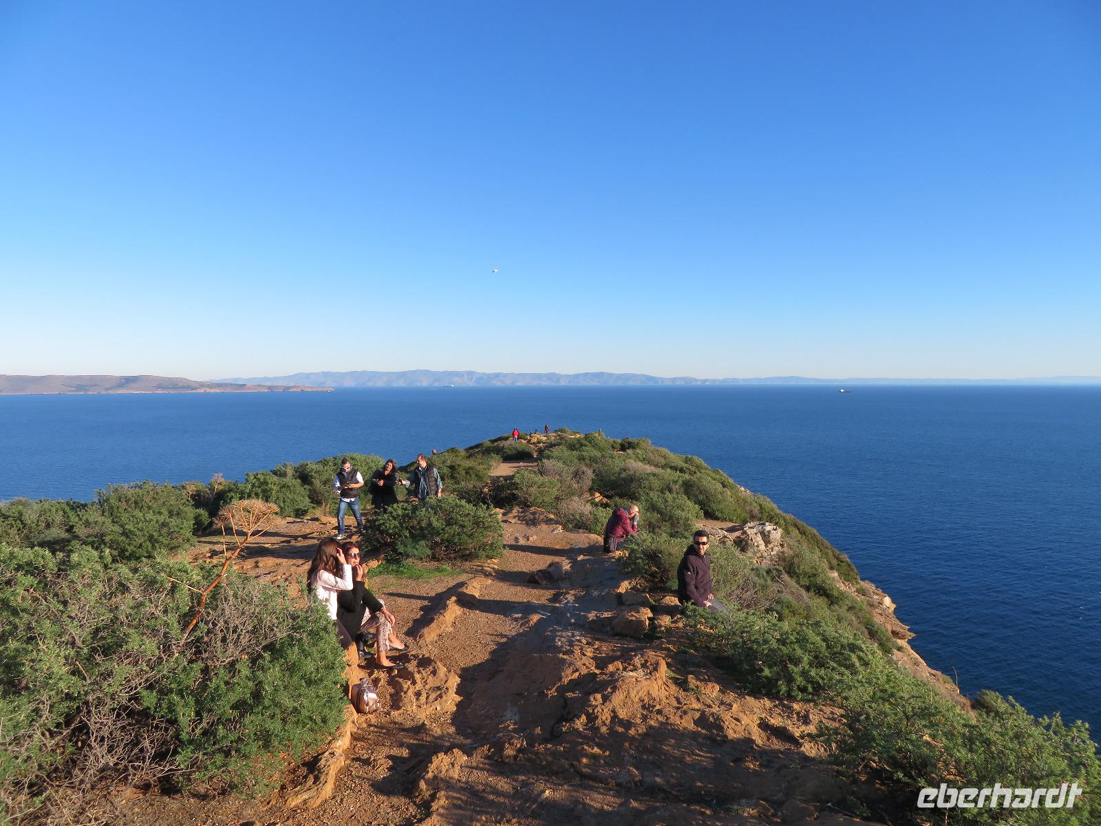 Dann fuhren wir entlang der Apolloküste in Richtung Süden. Die Sonne schien und die Ausblicke waren fantastisch: Jede Spitze der Mittelmeer-Flora endete in das blaue Meer. Unser Reiseleiter Simos hat uns den Ursprung der Namensgebung vom Ägäis-Meer erklärt. So erzählte er uns über den Mythos von Theseus, der seinem Vater versprach nach seinem Sieg gegen den Minotaurus, die typisch schwarzen Segel gegen weiße umzutauschen. Dies vergaß er jedoch, aufgrund seiner Freude, was zur Folge hatte, dass sein Vater, König Egeo (Ägäis), die schwarzen Segel von der Ferne sah und sich den Hügel hinunterstürzte mit dem Wissen, dass sein Sohn im Kampf gegen den Minotaurus gefallen ist. Nach einer guten Fahrt erreichten wir Kap Sounion und den Poseidon Tempel. An diesem malerischen Ort haben wir bei einem perfekten Wetter etwas getrunken. Außerdem hatten wir die Möglichkeit um Kap Sounion zu spazieren und viele Fotos von dem Meer zu machen. Danach fuhren wir nach Athen zurück und sahen uns den Sonnenuntergang auf der Dachterrasse des Hotels an. Uns bot sich eine atemberaubende Aussicht, in der die Sonne hinter der Akropolis langsam verschwand. Nach diesem schönen Moment probierten wir einen typischen Ouzo, bevor wir nach etwas Freizeit zum Viertel Plaka, direkt in der Altstadt gelegen, unsere Reise mit typisch griechischer Musik beendeten.