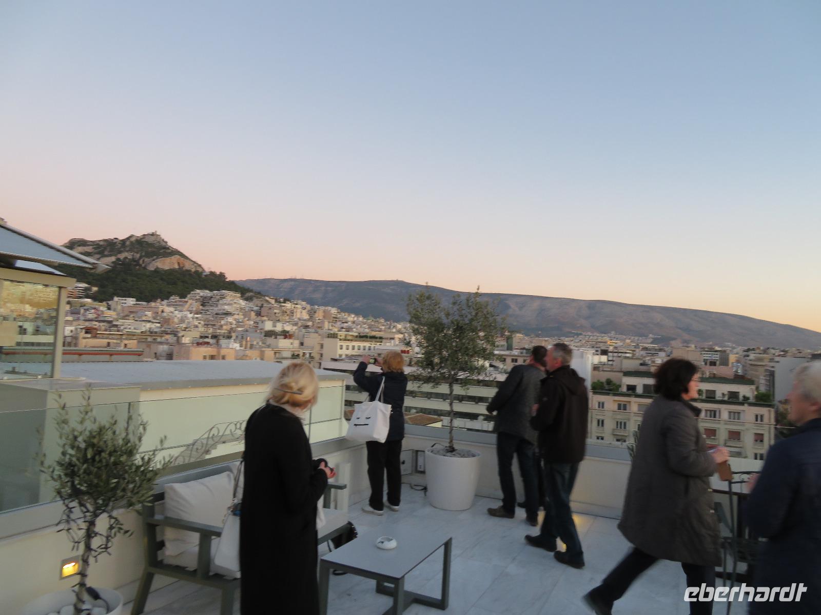 Nach unserer Ankunft in Athen begrüßten uns der örtliche Reiseleiter Simos und unser Busfahrer Kostas. Danach sind wir zum Hotel über die Attika-Autobahn gefahren und konnten auf den Weg dahin, verschiedene Dörfer sehen, in denen Olivenöl, Gemüse, Obst und auch das bekannte Efesina Weißwein produziert werden. Außerdem bekamen wir einen kleinen Eindruck von der Stadt und konnten uns schon die ersten Wörter auf Griechisch aneignen. Im Hotel angekommen, genossen wir unser Abendessen und hatten die Möglichkeit den Abend mit einem Getränk auf einer wunderschönen Terrasse mit Ausblick auf die Akropolis ausklingen zu lassen.