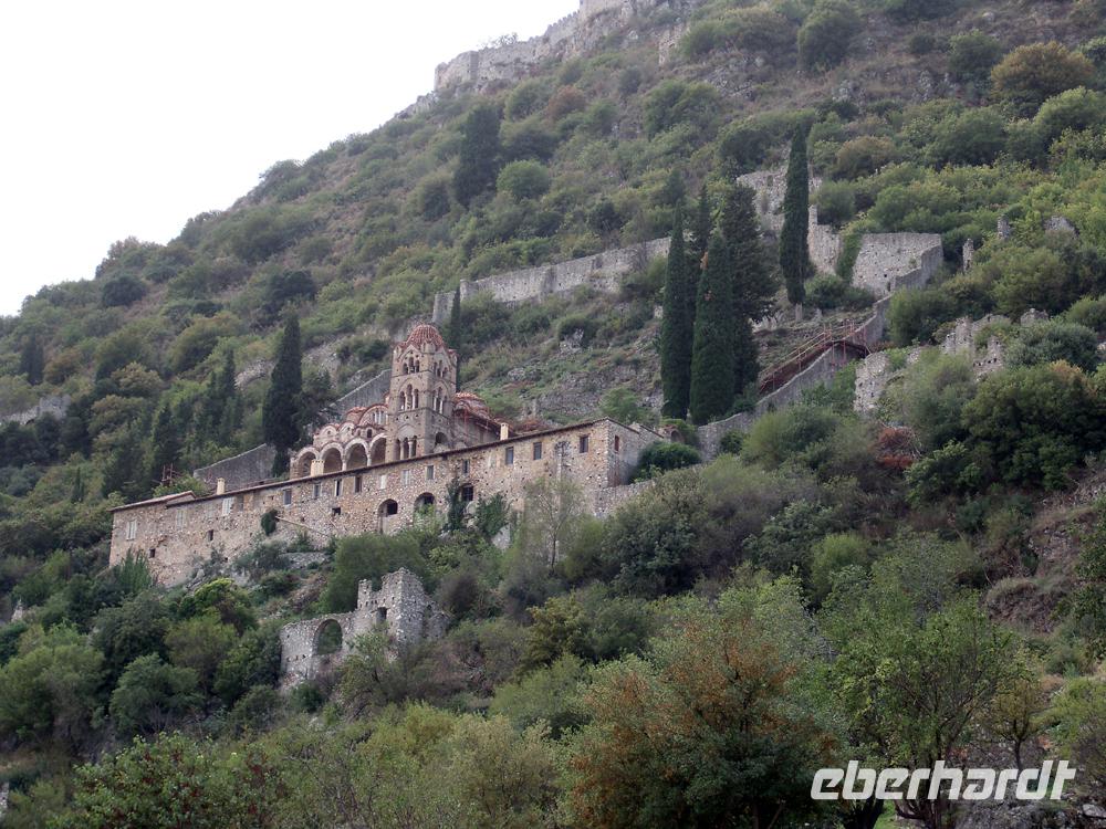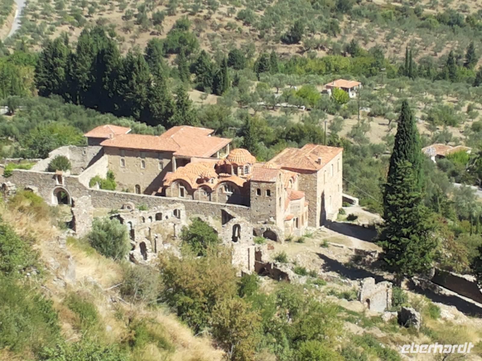 Die Besichtigung des mittelalterlichen Mistras ist der heutige Tagespunkt. Man betritt die Anlage durch das Burgtor. Die Wege sind eines der anspruchsvollsten Straßenpflaster Europas. Ohne sicheres Schuhwerk geht hier gar nix. Es geht es in die Kirche Hagia Sophia und am Despotenpalst zum Pantanassas Kloster, wo die dort lebenden Nonnen den Besuchern Decken und vieles andere selbstgefertigtes anbieten. Die Nonnen sind die einzigen Menschen, die in der verlassenen Ruinenstadt leben und eine sehr alte ist immer sooooo dermaßen liebenswert und freut sich so, dass man sie am liebsten gleich in den Arm nehmen möchte. Die letzten Bewohner siedelten in den 30er Jahren in das neu erbaute Sparta um. In diese Stadt zieht es uns auch, nach dem Besuch der Basilika von Mistras. In Sparta kehren wir in eine Taverne ein und genießen ein gutes Essen im Garten unter Apfelsinenbäumen. Die Reise zu unserem Hotel führt über den Taygetos Pass. Der Pass geht durch eine atemberaubende Landschaft über enge Kurven, Serpentinen, durch eine wilde Schlucht mit herrlichen Ausblicken und Eindrücken. Den Tag beschließen wir in einem großzügigen Resort Hotel direkt am Meer bei einem üppigen 4 Gänge Menu.