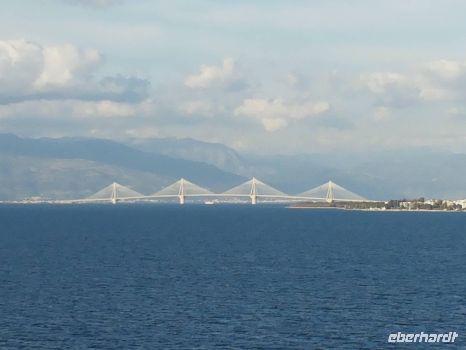 Mit der Besichtigung von Olympia geht unser Aufenthalt in Griechenland langsam dem Ende entgegen. Die Führung beginnt am Leonidaion, einem Gästehaus, der Basilika, und dem Zeustempel. Danach geht es weiter ins Stadion und am Standort der Schatzhäuser vorbei. Das riesige Stadion bot Platz für 45000 Menschen. Wir sehen einen prähistorischen Hausgrundriss, bevor es zum Heraaltar geht, auf dem auch heute noch das olympische Feuer entzündet wird. Am Heratempel vorbei wird noch der Tholos des Phillippeions, wie auch das Gymnasium und die Palästra auf dem Rückweg in Augenschein genommen. Plötzlich rennen alle zum Altar, wo das olympische Feuer entzündet wird. Es ist eine Probe für die olympischen Spiele im Gange und Schauspieler in traditionellen Gewändern proben die Zeremonie. Was für ein Glück. Selbst Anastasia ist ruhig, weil überrascht und selten übertroffen. Der Weg führt uns weiter zum Museum, wo neben vielen anderen Exponaten vor allem die hervorragende Plastik des Hermes mit Dionysosknaben vom Bildhauer Praxiteles zu bestaunen ist. Am frühen Nachmittag reisen wir nach Patras, wo wir von der Fähre aus noch einen guten Überblick in die Straßen der Stadt haben. Die Verabschiedung von unserer Reiseleiterin Anastasia kann herzlicher nicht sein. Noch längere Zeit grüßt uns die gewaltige Konstruktion der 2250 m langen Schrägseilbrücke, die hier den Peleponnes mit dem Festland verbindet.