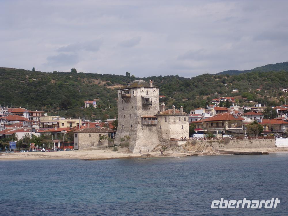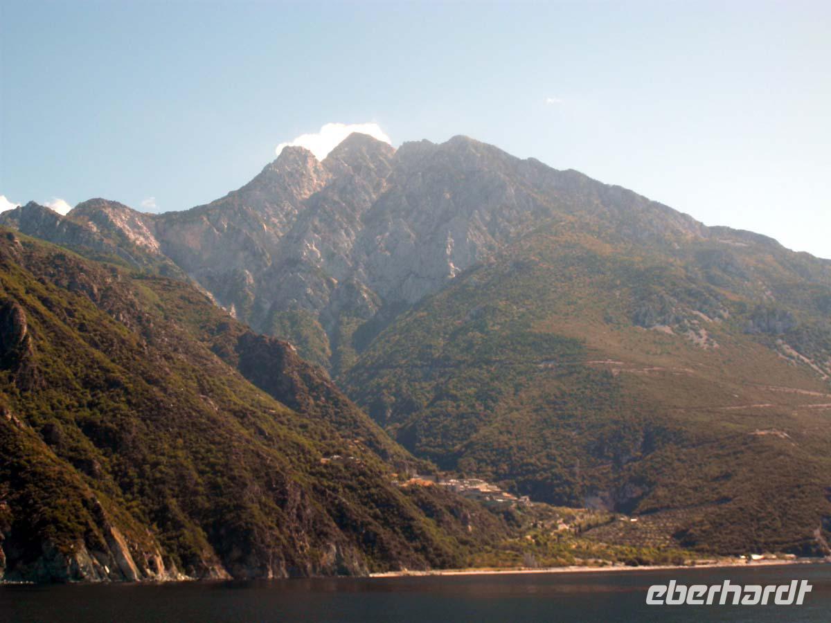 Mit einem griechischen Reisebus und Fahrer erkunden wir heute den Berg Athos, den unser Fahrer hat heute seinen ersten lenkzeitfreien Tag. Es geht durch die hügelige und bergige Landschaft von Chalkidiki mit Olivenbäumen bis zum Horizont und vielen schönen Photomotiven. Schon von weitem grüßt uns der schöne Berg Athos mit seiner fast ebenmäßigen Silhouette. In Ouranopolis besteigen wir unser Boot um an der Küsdte der Mönchsrepublik entlang zu schippern. An Land darf man allerdings nicht gehen, denn der Zutritt zur autonomen Republik ist Frauen strengstens untersagt. So ziehen die uralten Klöster, Sketen und Eremitagen von See aus am Ufer an uns vorbei und bieten herrliche Impressionen. Einige von uns sehen auch Delüphine mit dem Bug unseres Schiffes spielen. Höhepunkt ist am südlichen Ende der 2033 m hohe Berg Athos, der sich in erhabenen Gestalt in voller Pracht zeigt. Nach 3 Stunden Schifffahrt landen wir wieder in Ouranopolis. Das kleine Städtchen wartet mit einer schönen Ladenstrasse auf, in deren Läden man z. B. verschiedene Sorten Weihrauch, oder den berühmten Thymian-, Kastanien- und Orangenhonig erwerben kann. Danach begeben wir uns zum Hotel zurück, wo vor dem Abendmenü noch Zeit zum Schwimmen im Meer ist.