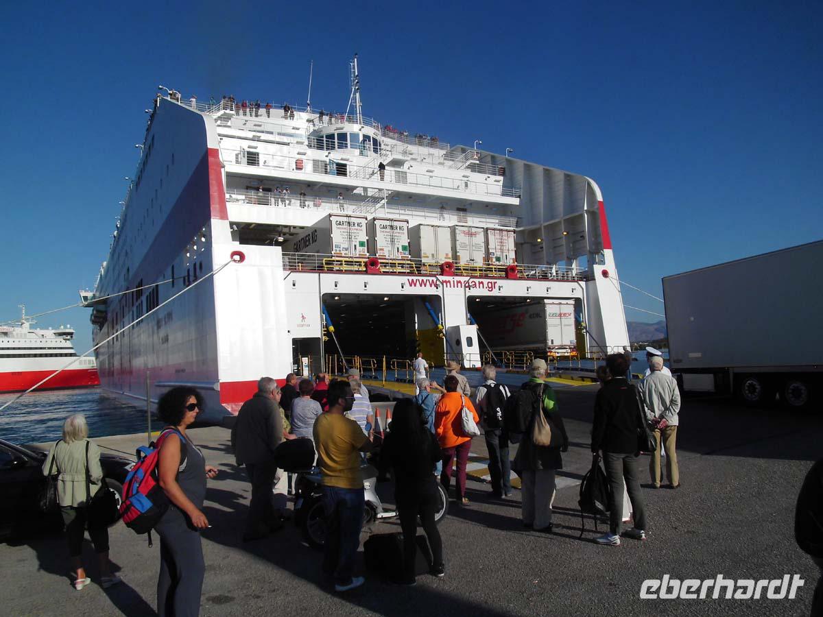 Noch einmal heißt es früh aufstehen, denn wir müssen punkt 12 Uhr in Ancona am Fährterminal einchecken. Schon bald liegt die Ebene des Po mit seinen Zuflüssen vor uns. Am Morgen liegt die Poebene im typischen Morgendunst. Erst langsam schafft sich die Sonne Platz. Schnell ist Bologna an uns vorbei gezogen wo wir am Horizont die Kirche Sta. Madonna di San Luca sehen. Bei klarer Sicht zieht der Staat San Marino an uns vorbei, der sich deutlich durch den spitzen Monte Titano zu erkennen gibt. Schon bald kommt Ancona in Sicht. Hier wirft Griechenland schon seine Schatten voraus, denn die Stadt geht auf griechische Kolonisten aus Syrakus zurück, die die vor dem Tyrannen Dionysos I. flohen. Nach den Formalitäten bei Zoll und Hafenbüro steht die Fähre der Minoan Line im Hafen schon bereit. Man staunt immer wieder welche ungeheuere Menge an Bussen, LKWs und PKWs aus dem Bauch des Schiffes quellen. Auf der Fähre liegt uns Ancona zu Füßen. Lange noch ist der altehrwürdige Dom St. Ciriachi aus dem 11. Jahrhundert in der Ferne sichtbar, der auf Resten des römischen Venustempels steht. Nun wird das Schiff erkundet und danach finden wir uns am Restaurant ein, wo für uns Plätze für ein sehr reichhaltiges Abendmenü reserviert sind. An Bord bei ruhiger See klingt der tag aus.
