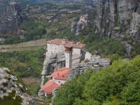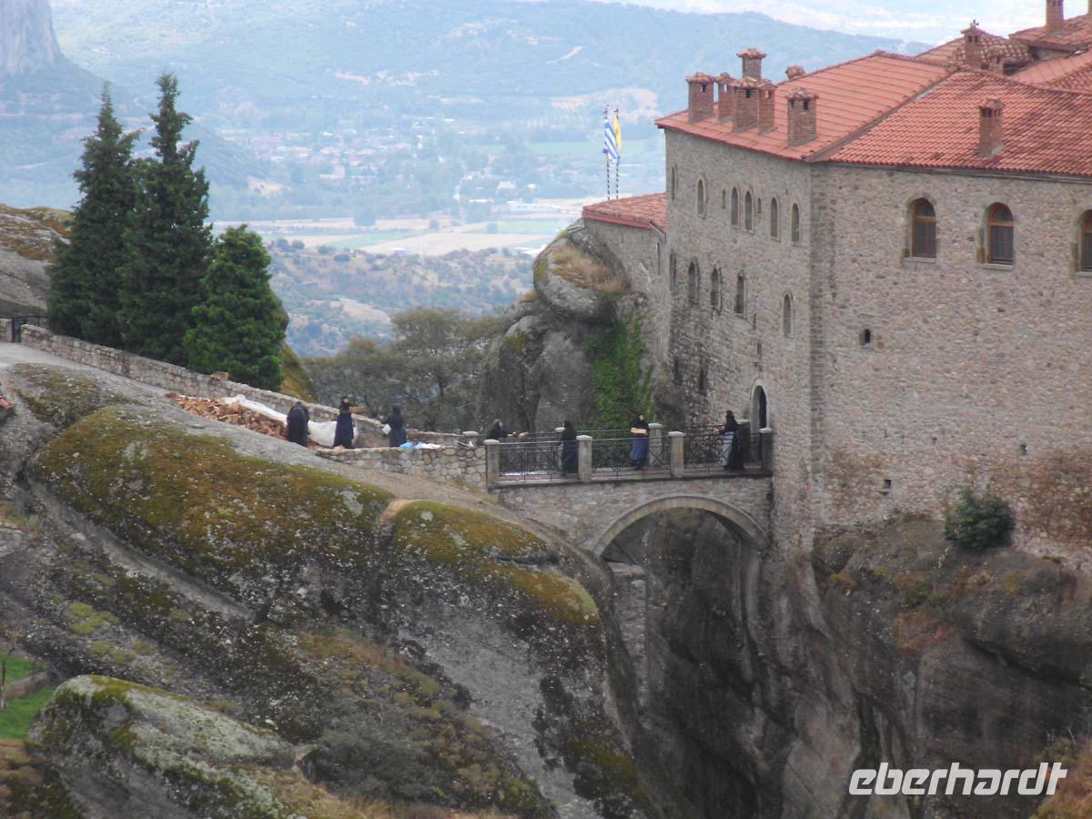 Das Frühstück nehmen wir noch an Bord ein. Im Restaurant sind die Tische für uns schon gedeckt, während die Masse der Reisenden anderer Veranstalter sich im Self-service Bereich drängelt. Zunächst sehen wir die albanische Küste, dann Korfu und bald schon kommt Igoumenitsa in Sicht, eine Stadt, die dem Fährhafen ihre Existenz verdank und von und mit ihm lebt. Hier empfängt uns unsere örtliche Reiseleitrein Anastasia. Wir verlassen Igoumenitsa recht schnell in Richtung Osten. Das Wetter ist hervorragend. Die Sonne scheint aus allen Löchern. Die Reise geht zunächst nach Dodona, der ältesten bekannten Orakelstätte Griechenlands. Aus dem Rauschen der Blätter einer heiligen Eiche vernahmen die Priester hier die Stimme von Zeus. Nächstes Ziel nach Ioannina. Hier machen wir einen Zeitsprung in die Jahrhunderte, in denen Griechenland zum Osmanischen Reich gehörte (Ende 14. Jh. - 1830). In der ummauerten Altstadt wird die Aslan Pascha Moschee mit der Mädresse sowie die darunter liegende Osmanische Bibliothek besichtigt. Danach geht es hinauf zur inneren Zitadelle mit dem Normannischen Turm, der Fetije Moschee und dem Ali Pascha Grab. Es bieten sich wunderschöne Ausblicke auf den Pamvotissee mit seiner kleinen Insel und den teils noch verschneiten Gipfeln des Pindos Gebirges. Die Einkehr in das dort vorhandene Cafe schließt den Besuch in Ioannina ab. Am späten Nachmittag erreichen wir unser erstes Hotel in Kalambaka. Schon von weitem sind die Meteorafelsen über dem Pindostal zu sehen, die alle beeindrucken. Das Hotel liegt direkt unterhalb der mächtigen Felsformation. Von dort oben grüßt uns schon das Kloster St. Stephani. Das große und reichhaltige Buffet am Abend rundet den ersten Tag auf dem griechischen Festland wohltuend ab.