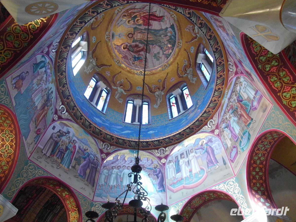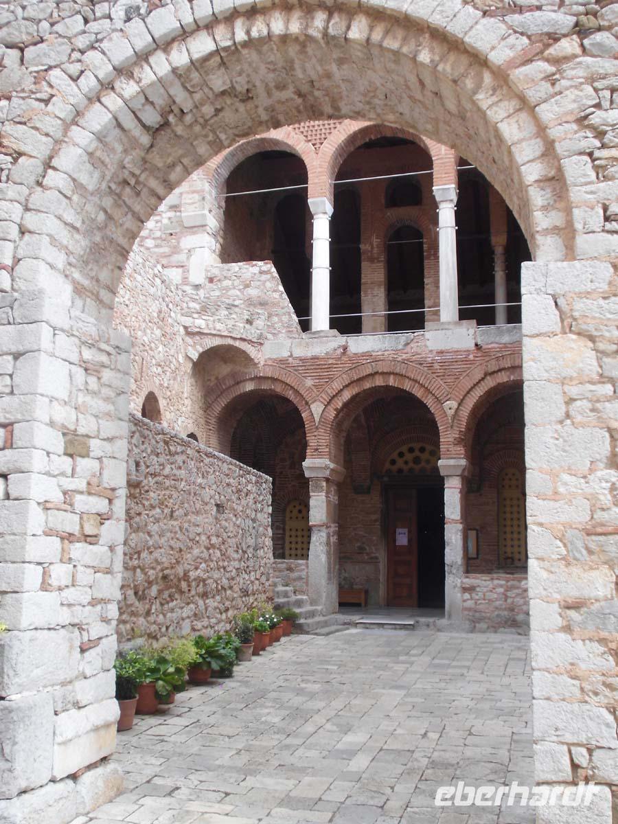 Auf der Fahrt zu unserem Hotel in Vrahati legen wir halbstündige Pause auf einem Parkplatz gegenüber dem malerisch gelegenen Ort Arachova ein, dem St. Moritz von Griechenland. Vor Vrahati steht aber noch die Besichtigung des Klosters Ossios Lukas mit den berühmten Goldmosaiken aus dem 11. Jh. Auf dem Programm. Danach gibt es Gelegenheit in den beiden Klosterläden Spezereien aus dem Kloster zu erwerben, oder den Blick für einige Zeit auf der ausgedehnten Ebene zu Füßen des Klosters ruhen zu lassen. Den Tag lassen wir an einem überaus reichhaltigen Buffet ausklingen.