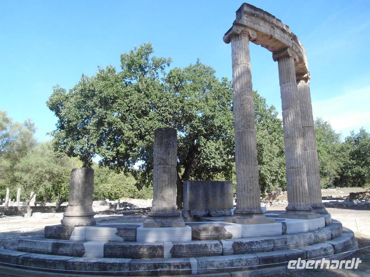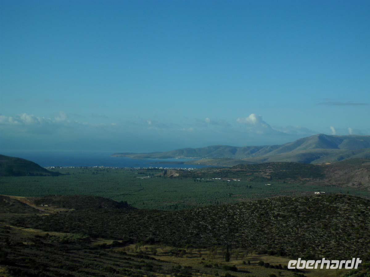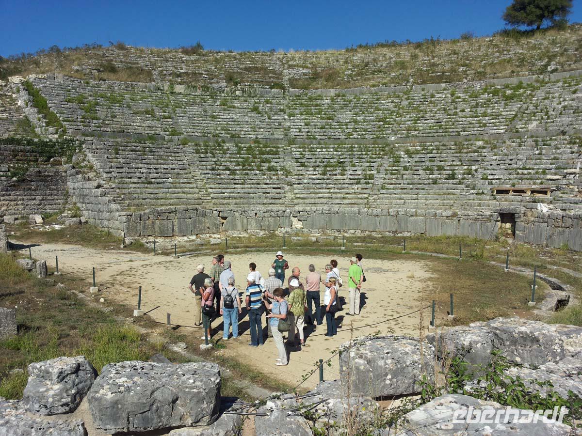 Pella, die alte Hauptstadt des Makedonierreiches steuern wir als erstes Tagesziel an. Von König Archelaos um 410 v. Chr. gegründet, wurde die Stadt zum Geburtsort von Phillip II. und seines Sohnes Alexander dem Großen. 196 v. Chr. durch die Römer zerstört, bedurfte es bis zur Gegenwart, um zahlreiche kostbare Fußbodenmosaiken aus den reichen Villen zu bergen, die wir im ganz neu gebauten Museum unweit der Grabungsstätte bestaunen. Unser nächstes Vorhaben ist eine Wanderung zur Badewanne des Zeus im Nationalpark des Olymp. Die Fahrt dorthin führt uns nach Lithochoro. Hier beginnen wir unsere kleine Wanderung durch die wilde Schlucht des Enipeasflusses. Der führt allerdings sehr wenig Wasser und die Badewanne des Zeus zeigt sich uns zwar voll, jedoch ist der Wasserfall recht schwach. Auch der 2915 m hohe Gipfel des Olymp hüllt sich heute in Wollen. Die Götter wollen anscheinend unter sich sein. Auf dem Weg nach Itea im Süden legen wir noch einen Stop an den Thermopylen, den warmen Toren ein. Hier führte der König von Sparta, Leonidas einen aussichtslosen Kampf gegen das überlegene Heer der Perser.Bei einer längeren Lenkzeitpause auf einem Rastplatz südlich von Lamia überrasche ich die Gäste mit einem Glas Tsipouro, der beim Verdauen des Mittagessens hilft. Es handelt sich um einen Tresterschnaps, der überall in Griechenland getrunken wird. Nach dem Abendmenu in unserem Hotel genießt man den Blick aufs Meer, dem Golf von Korinth den fast alle Zimmer haben, und das nur 100 m weit entfernt ist.
