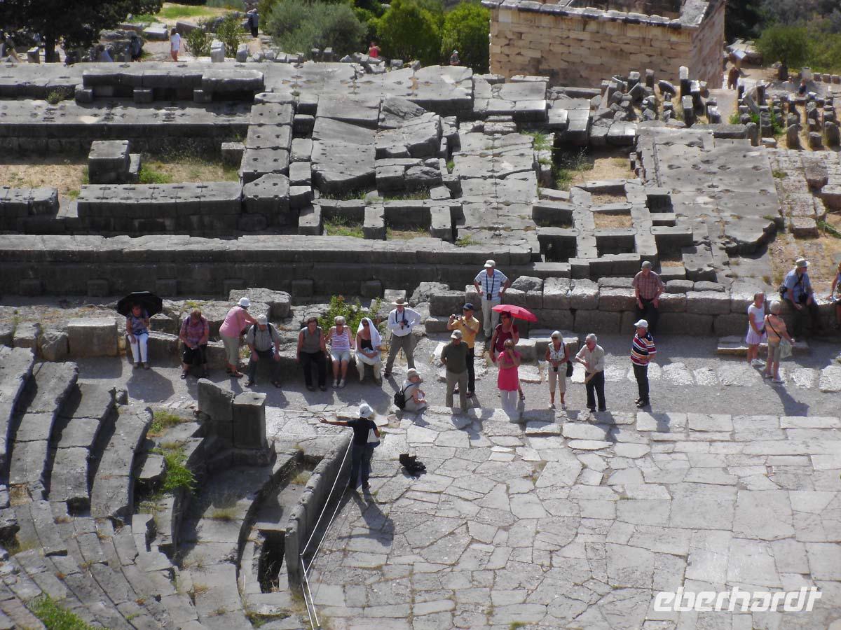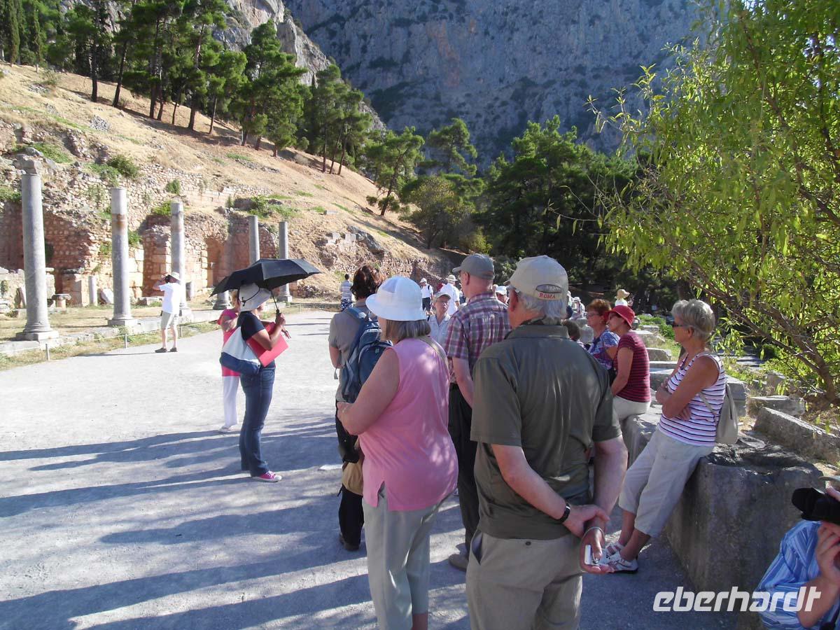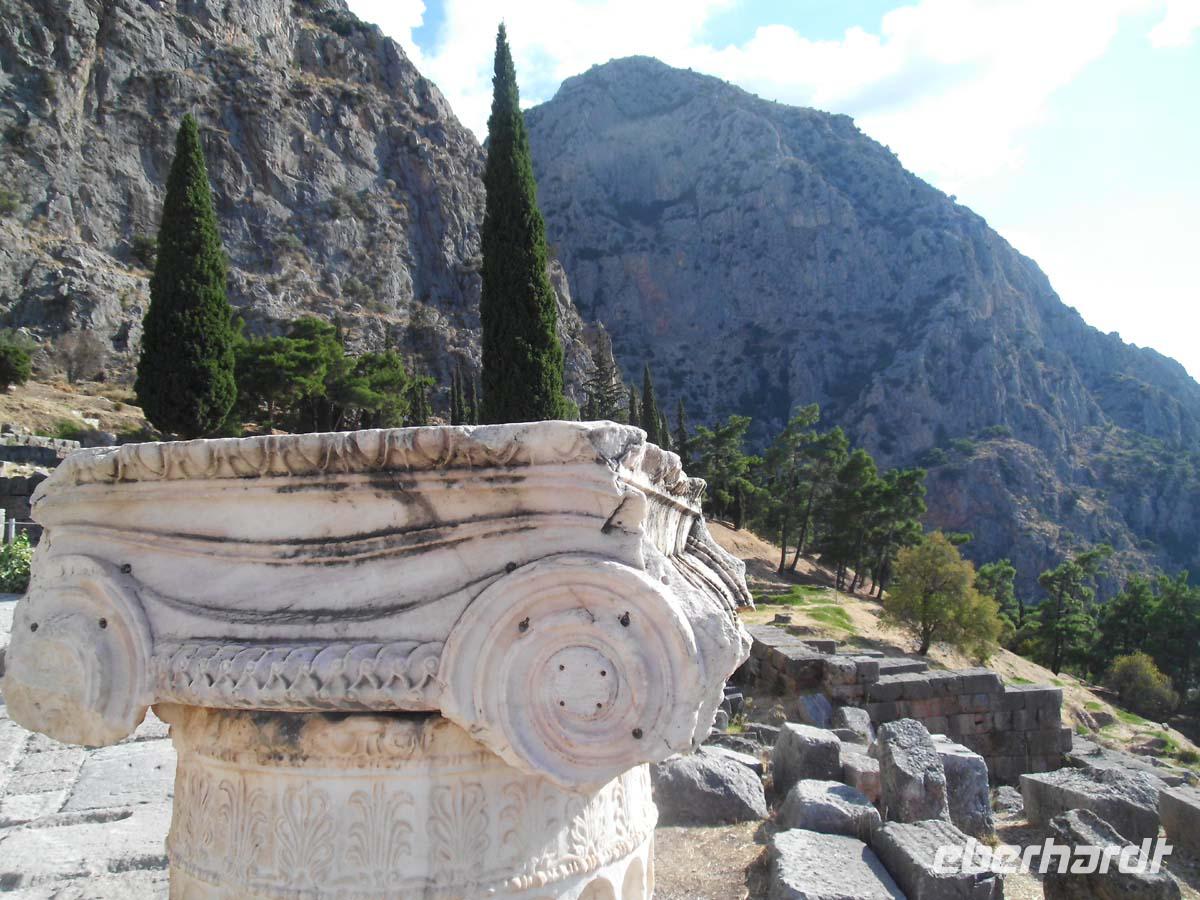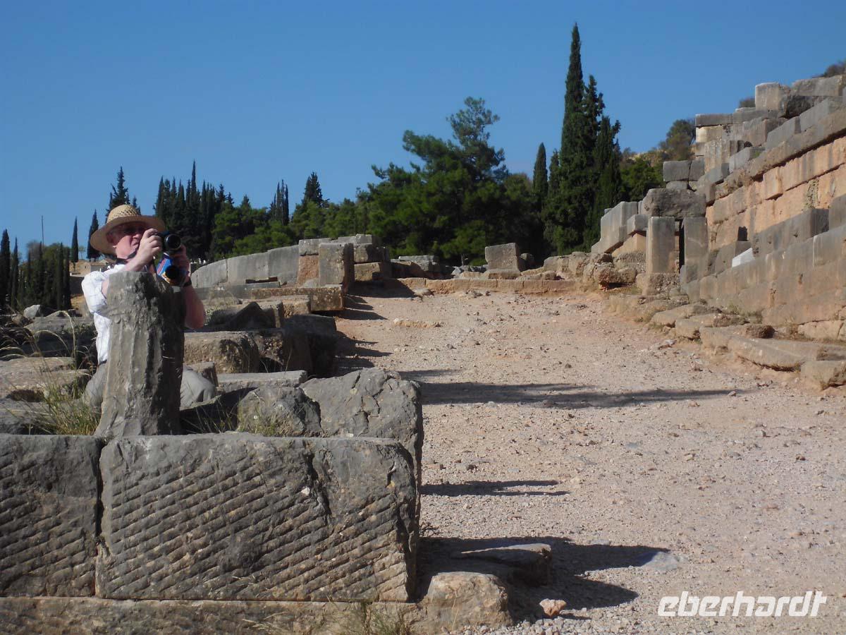 Die wichtigste und berühmteste Orakelstätte der Antike ist heute unser Ziel. Delphi, am Hang des Parnassos und mit Blick auf den Golf von Korinth gelegen erlebte seine erste Blüte ab dem 7. Jh. v. Chr. Hier fiel die Phytia mittels berauschender Dämpfe aus einer Erdspalte in Trance und wurde so zum Medium des Gottes Apollon. Wir schreiten vorbei an den Resten von Schatzhäusern der griechischen Stadtstaaten, die in diesen Ihre Weihegaben aufbewahrten. Schließlich stehen wir vor dem Tempel des Apollo, aber berauschende Dämpfe steigen nicht mehr auf. Das Orakel ist seit langem erloschen. Dafür bietet der Besuch des Museum einen guten Ersatz. Hier ist alles zu bestaunen, was die langjährigen Ausgrabungen im heiligen Bezirk zu Tage gefördert haben, u. a. die weltberühmte Bronzestatue des Wagenlenkers aus Delphi, die bei einem Erdbeben im 4. Jh. V. Chr. verschüttet wurde. Den Abschluß in Delphi bietet eine Betrachtung des Tholos (Rundtempel) der Athene Pronaia. Es ist DAS Photomotiv aus Delphi obwohl es gar nicht zum eigentlichen heiligen Bezirk gehört.