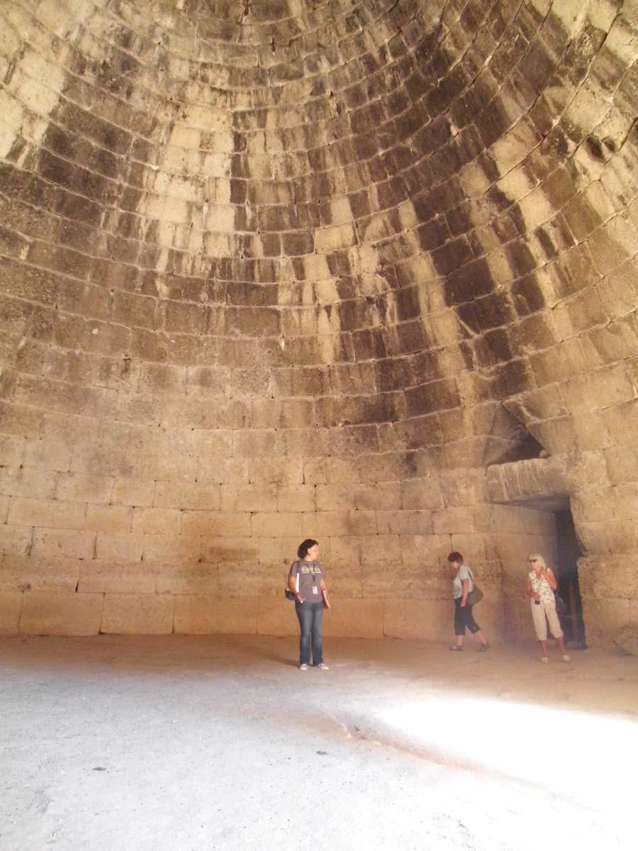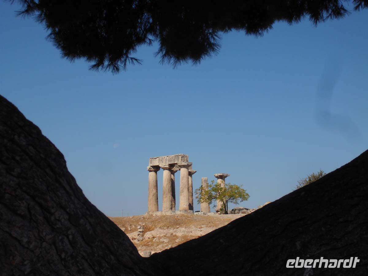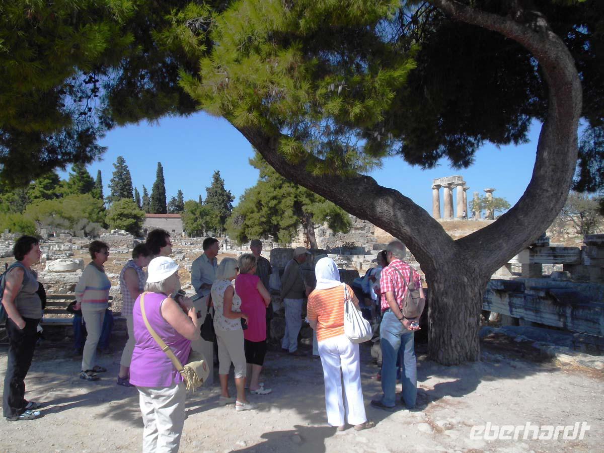 In weitem Umkreis ist die Akropolis von Altkorinth auf einem mächtigen Felsen zu sehen, zu deren Füßen die antike Stadt liegt. Im 10. Jh. v. Chr. besiedelt, entwickelte sie sich zu einer Metropole mit mehr als 300000 Einwohnern. Den Aufschwung verdankte sie ihrer Lage, denn sie bewachte den Einzigen direkten Zugang vom Peleponnes zum griechischen Festland. Nur ein Bruchteil der Stadt ist bis heute ergraben worden. Wir begutachten den Tempel des Apollon, schreiten über die Agora und lauschen einem langen Vortrag an der Peireneqelle, über der Herodes Atticus im 2. Jh. n. Chr. einen prächtigen Marmorbau errichten ließ. Durch die Lechaionstrasse, die nördliche Ladenstrasse verlassen wir das Zentrum der antiken Stadt. Es steht die Fahrt durch den Kanal auf dem Programm. Unser Schiff wartet schon und wir haben es ganz für uns allein. Der Kanal ist nur 25 m breit. Bei gut 6 km Länge ragen die steilen Wände bis zu 80 m in die Höhe. Wild spritzt die Gischt unseres Schiffs gegen die Wände. Viele Versuche diesen Kanal zu bauen scheiterten, u.a. auch Kaiser Nero. Erst 1893 konnte das Vorhaben erfolgreich in die Tat umgesetzt werden. Auf der Rückfahrt werden unter Deck Ouzo und Mese, also kleine Häppchen gereicht Am frühen Nachmittag sind wir bereits wieder am Hotel. Der restliche Tag ist der Ruhe gewidmet. Es ist schön, mal einfach die Seele baumeln zu lassen können Zeit zu haben, das bisher Gesehene zu verarbeiten.