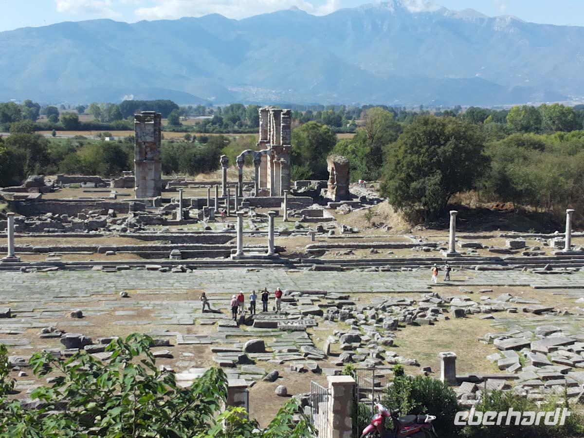 Der heutige Tag steht zunächst im Zeichen des frühen Christentums auf dem europäischen Kontinent. Wir reisen zur antiken Stätte von Philippi. Phillip II. gab der Stadt seinen Namen, die vor allem durch die reichen Goldvorkommen im nahen Pangaiongebirge reich und mächtig wurde. Hier gründete der Apostel Paulus im Jahre 49 n. Chr. die erste christliche Gemeinde. An kaum einem anderen Ort wird die Überprägung griechisch-römischer Anlagen durch christliche Großbauten visuell so deutlich. Der zweieinhalbstündige Rundgang geht nach dem Theater über Basilika A und das Gefängnis des Apostel Paulus zum Forum, der Bischofskirche mit schönen Mosaiken zur Basilika B, die auch heute noch mit ihren korinthischen Säulen das Ruinenfeld weit überragt. Hinter dieser werden noch die antiken Toiletten des Gymnasiums begutachtet, die eine fließende Wasserspülung besaßen. Längst ist noch nicht alles ausgegraben. Nur eine kurze Strecke ist zu überwinden, dann haben wir das Taufbecken der Lydia erreicht, des ersten Menschen, der in Europa getauft wurde. Hernach kann auch noch ein Blick in das neuzeitliche Baptisterium geworfen werden. Am frühen Nachmittag treffen wir am alten Hafen von Kavala ein. Es ist freie Zeit um die Stadt selbst zu erkunden und/oder in eine der zahlreichen Tavernen zu gehen um etwas zu Mittag zu essen. Am besten verbindet man beides miteinander. Wahrzeichen der Stadt ist ein mächtiges Aquädukt aus der Seit Suleiman des Prächtigen (16. Jh.). Über der Altstadt thront die Zitadelle, eine 1425 erbaute byzantinische Burg. Nach einem Rundgang sind vor allen die zahlreichen Restaurants an der Hafenpromenade mit guten griechischen Essen zu empfehlen. Der fangfrische Fisch, der hier auf die Teller kommt, wird auf der gegenüberliegenden Straßenseite am Kai angelandet. Bei der Rückkehr zum Hotel statten wir dem Löwen von Amphipolis einen Besuch ab. Die bombastische Plastik ist der Rest eines gewaltigen Grabmonuments aus hellenistischer Zeit, das sich etwas außerhalb der eigentlichen antiken Stadt befindet. Bei einem üppigen Abendbüffet in unserem Hotel lassen wir den Tag ausklingen.